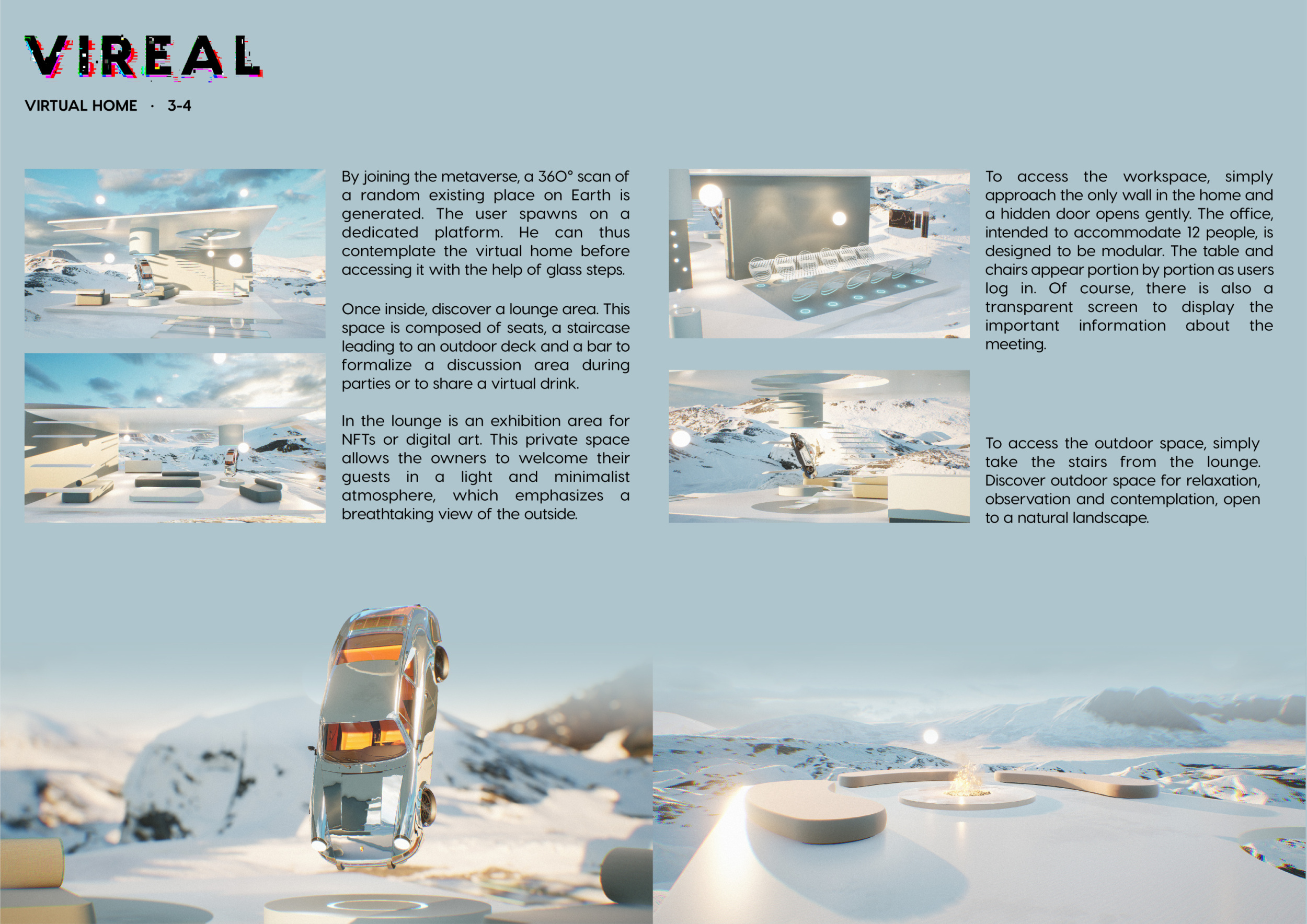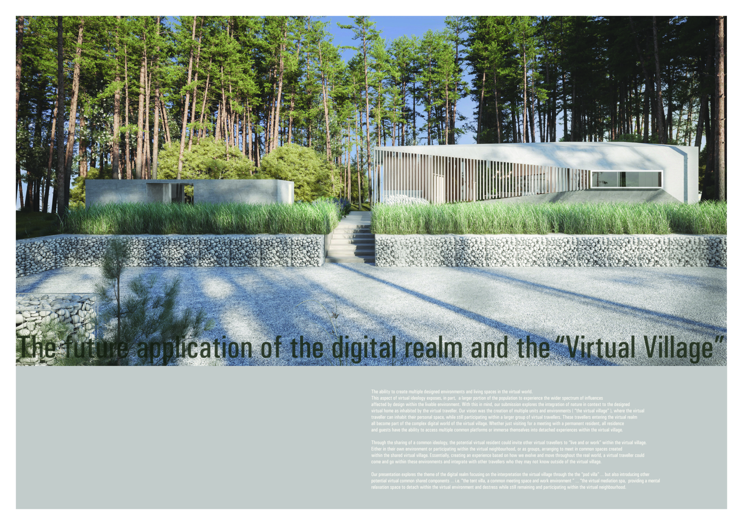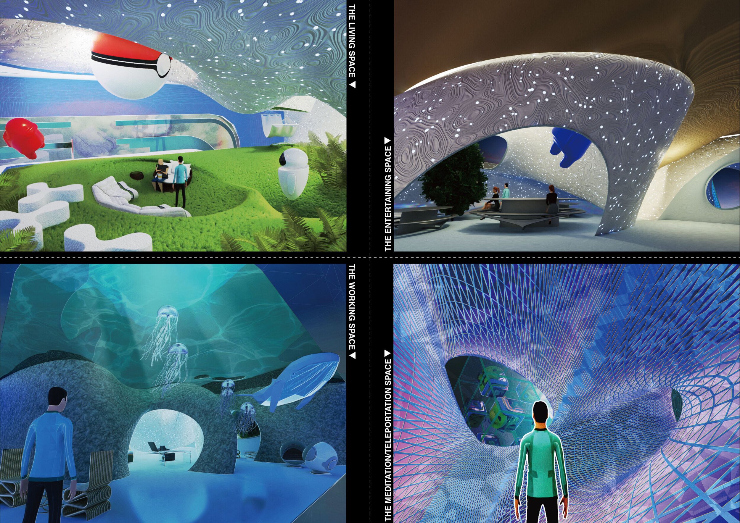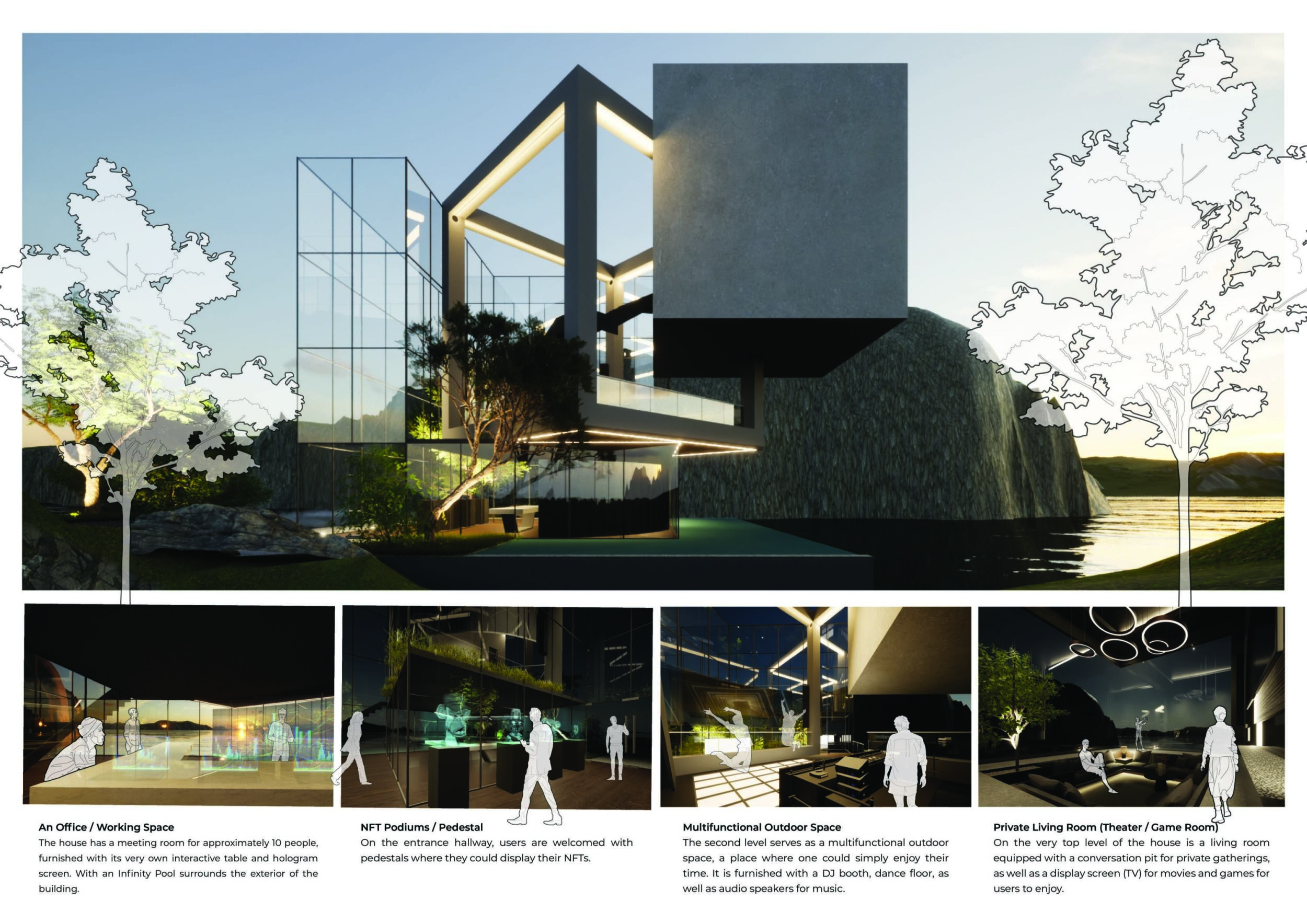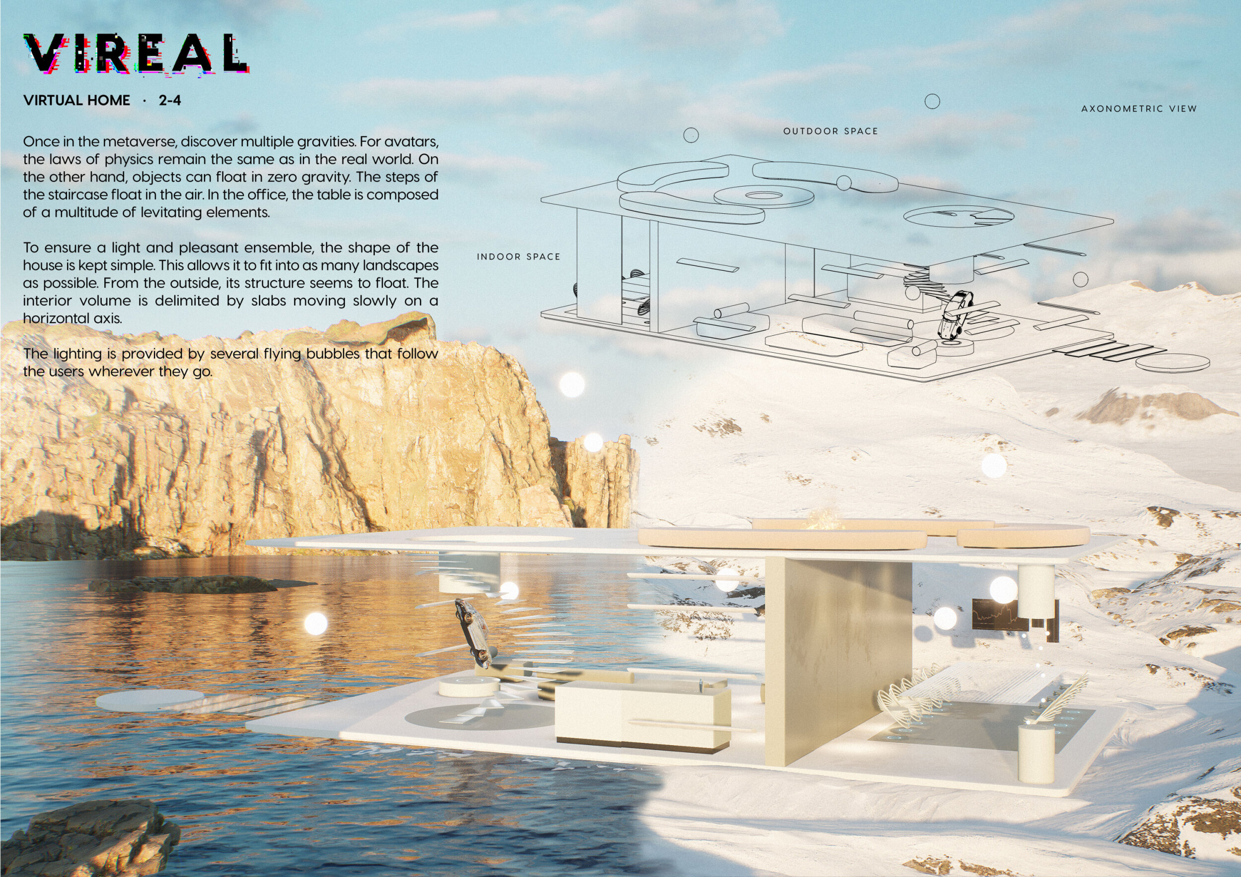 The Neo-Dimension references the film Inception, and proposes a “loop” that creates a dreamscape cubic home, with mystical vistas, gravity-defying environments, and cozy interiors that float between reality and fantasy. It considers the 6 interior and 6 exterior faces of a geometrical cube as hosts, to 12 “active spaces”. Read more The jury writes: “The subversion of the sense of orientation and gravity is a blow to other projects that depict the cliche of a house in the cliff or the mountain or any idyllic landscape. This is a very strong project because it invents rules on how a digital real estate realm may be constructed, defying the rules and constraints of the physical realm - gravity, physics. It does not transfer the ideal home in a digitized world, but instead constructs a new series of values. There are no illogical spaces like a bedroom, or bathroom - all the rooms are instead meaningful to a virtual space. It studies varying levels of security and privacy. It explores the limits of the virtual world, where none of our physical laws are applicable. The concept is elaborate and gives room to imagination and adventure. The chosen graphic language is very appropriate for the family of ideas at stake.”