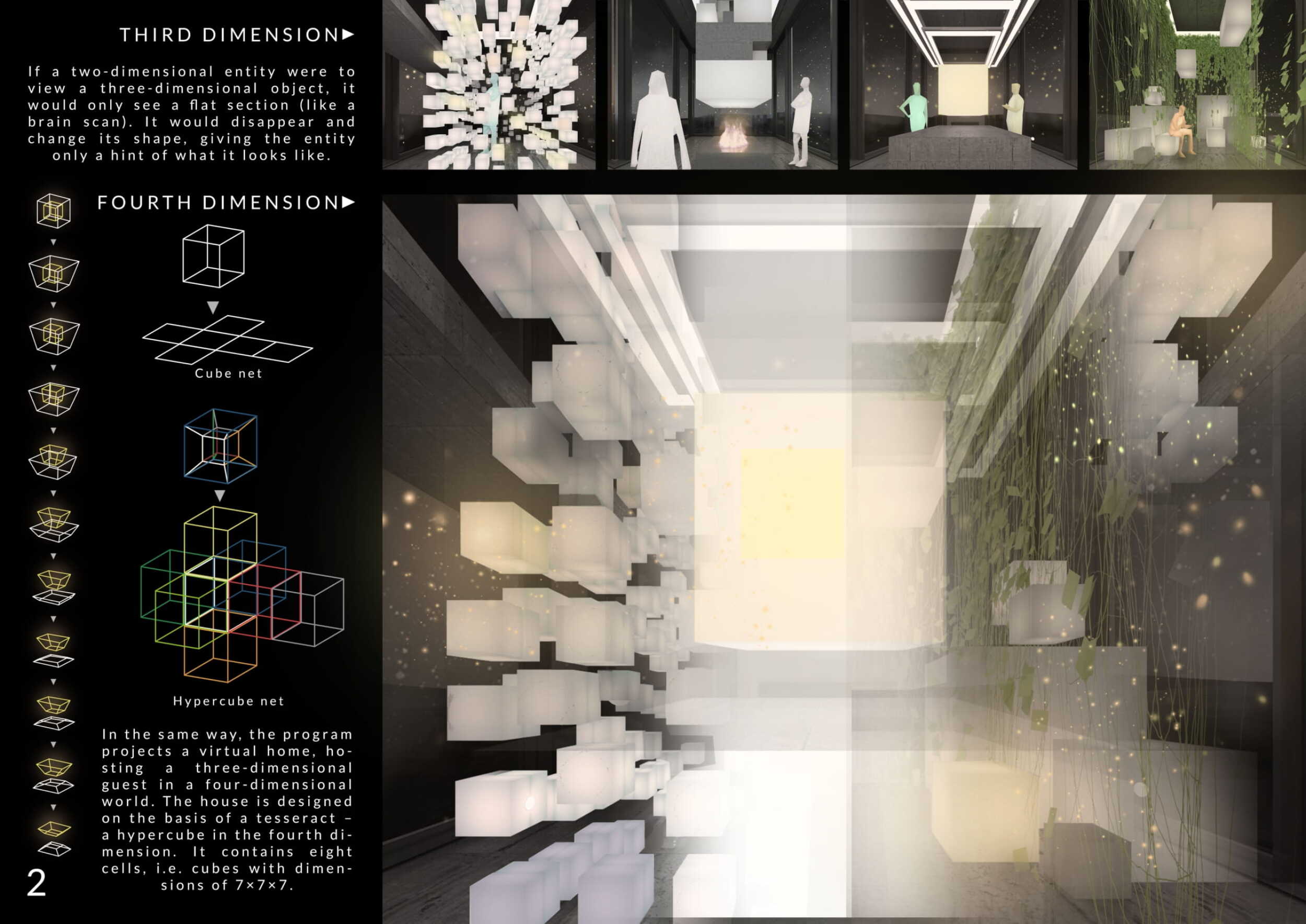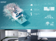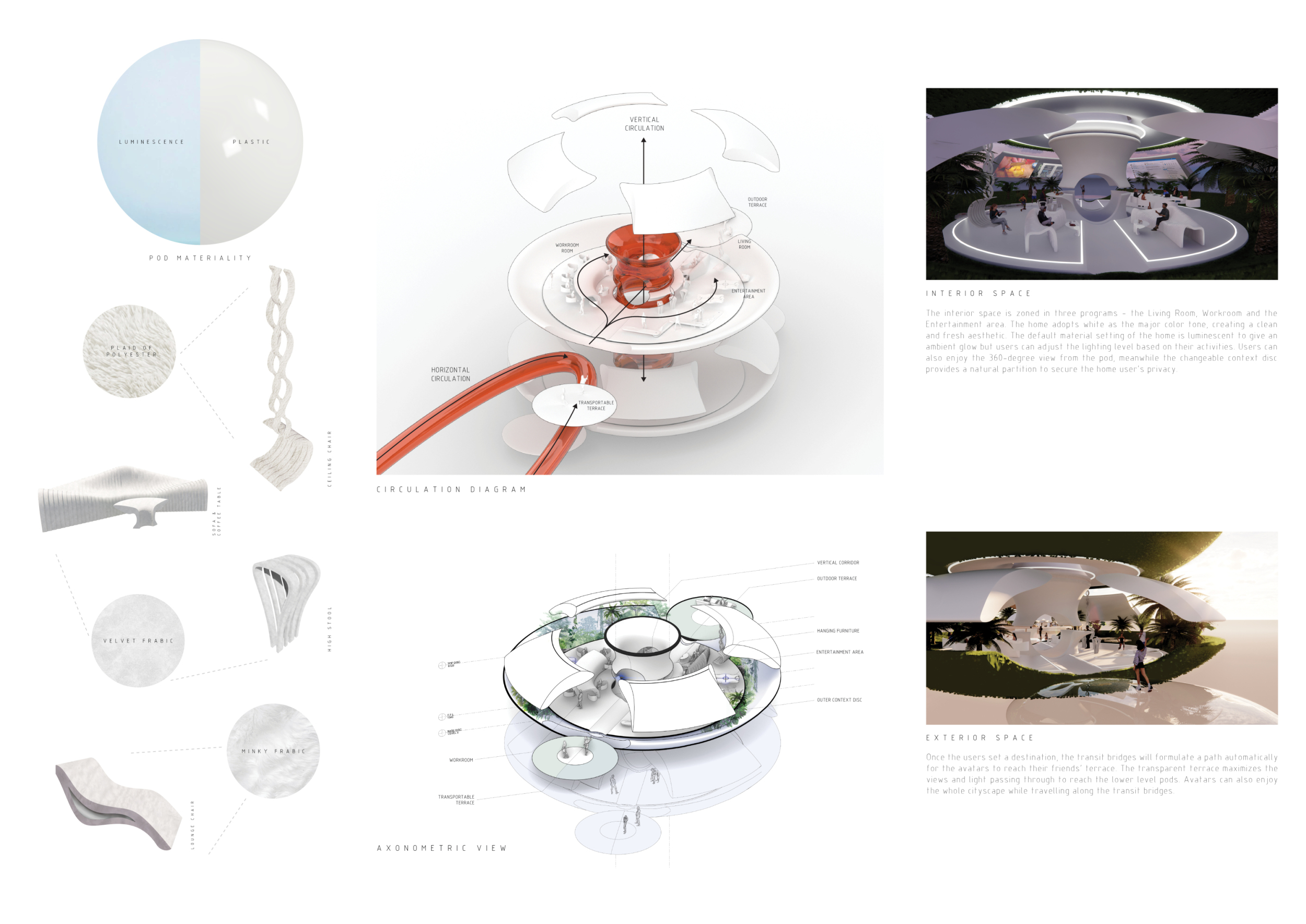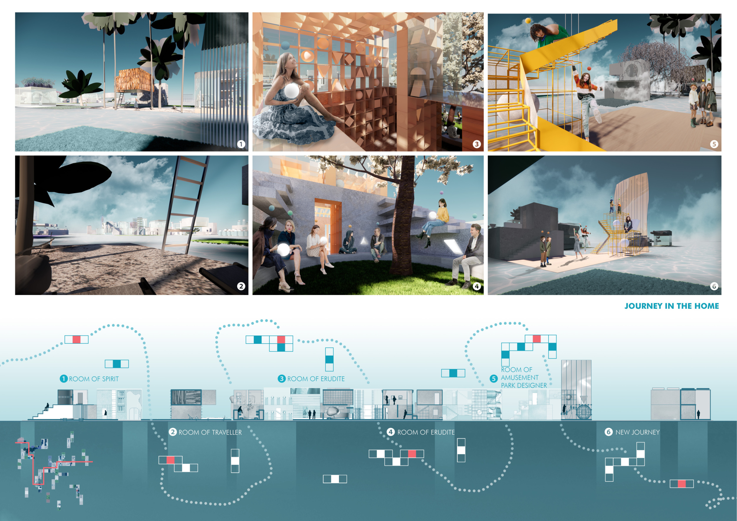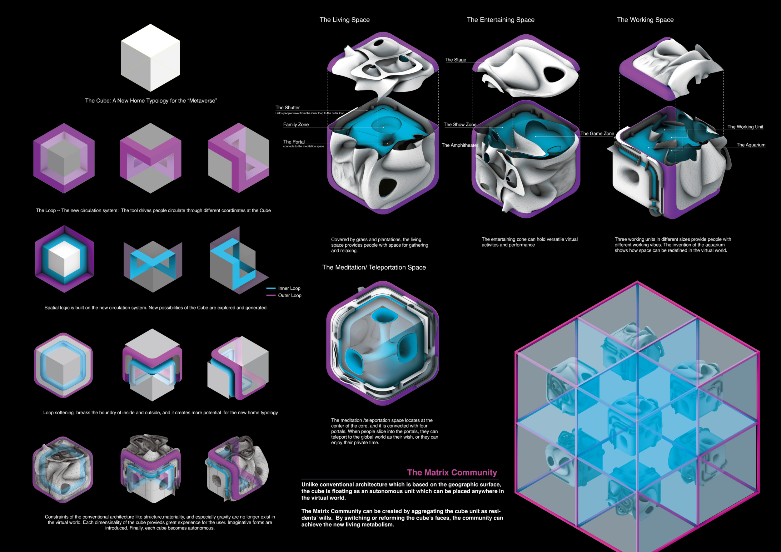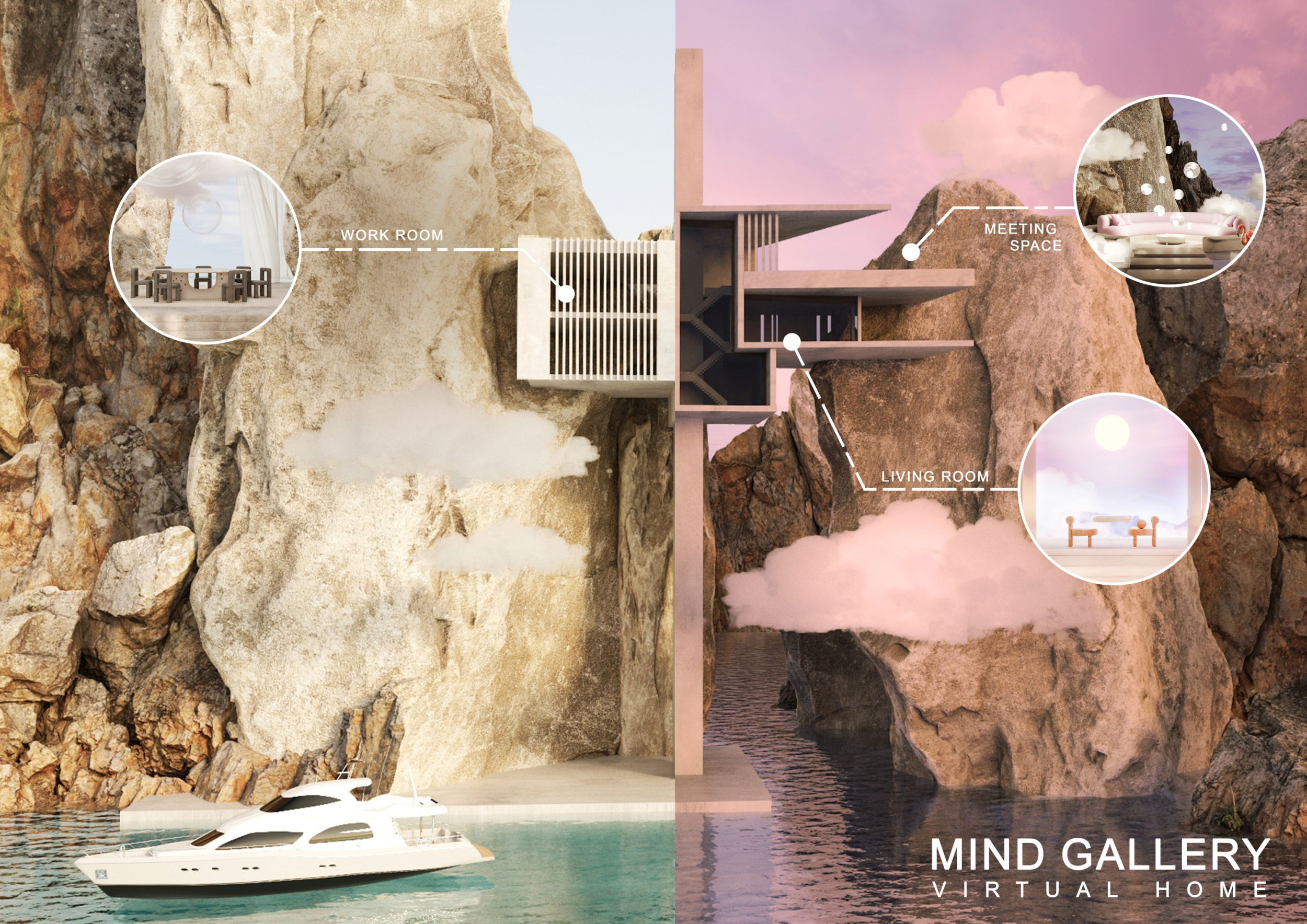 The Neo-Dimension references the film Inception, and proposes a “loop” that creates a dreamscape cubic home, with mystical vistas, gravity-defying environments, and cozy interiors that float between reality and fantasy. It considers the 6 interior and 6 exterior faces of a geometrical cube as hosts, to 12 “active spaces”. Read more The jury writes: “The subversion of the sense of orientation and gravity is a blow to other projects that depict the cliche of a house in the cliff or the mountain or any idyllic landscape. This is a very strong project because it invents rules on how a digital real estate realm may be constructed, defying the rules and constraints of the physical realm - gravity, physics. It does not transfer the ideal home in a digitized world, but instead constructs a new series of values. There are no illogical spaces like a bedroom, or bathroom - all the rooms are instead meaningful to a virtual space. It studies varying levels of security and privacy. It explores the limits of the virtual world, where none of our physical laws are applicable. The concept is elaborate and gives room to imagination and adventure. The chosen graphic language is very appropriate for the family of ideas at stake.”