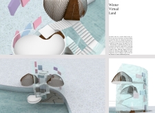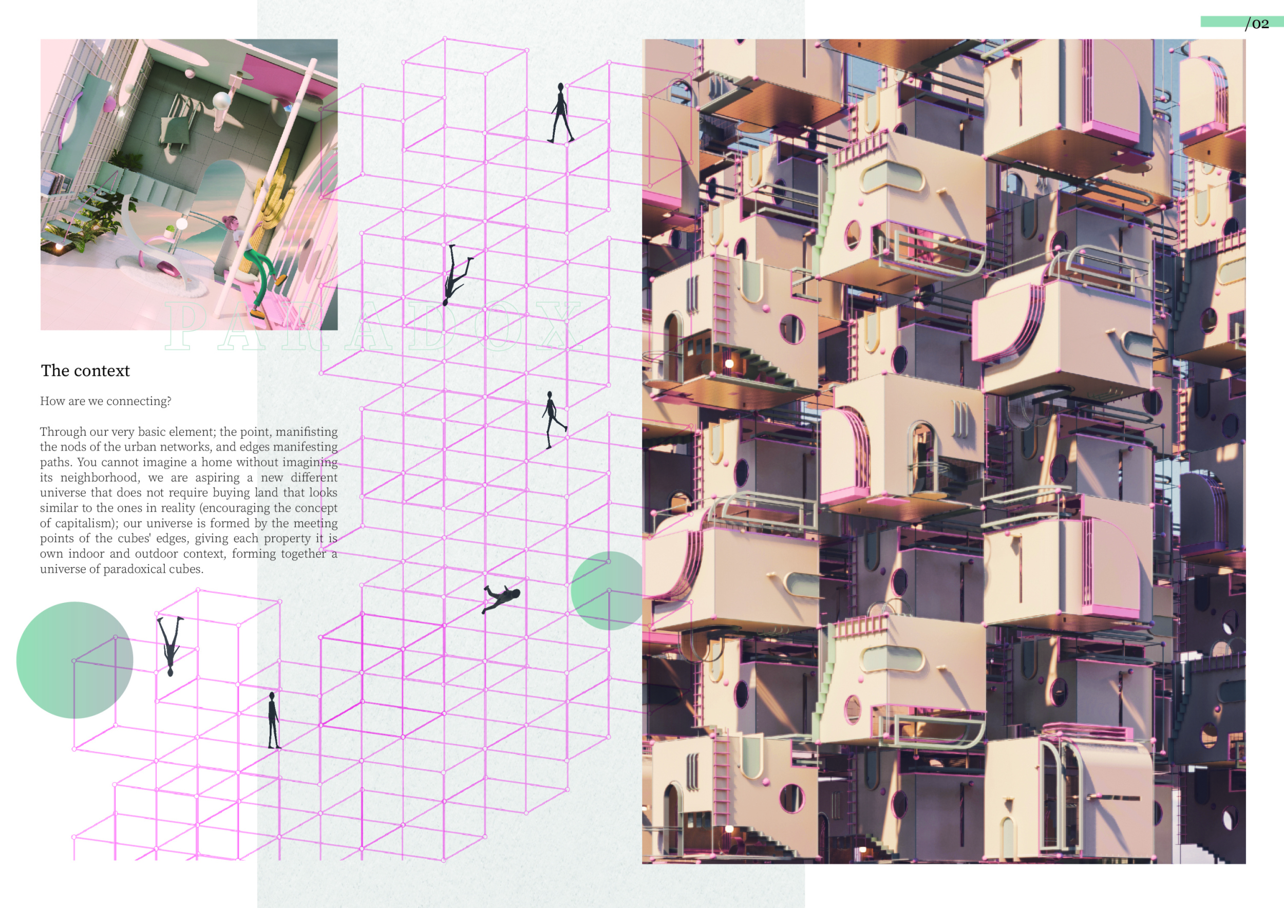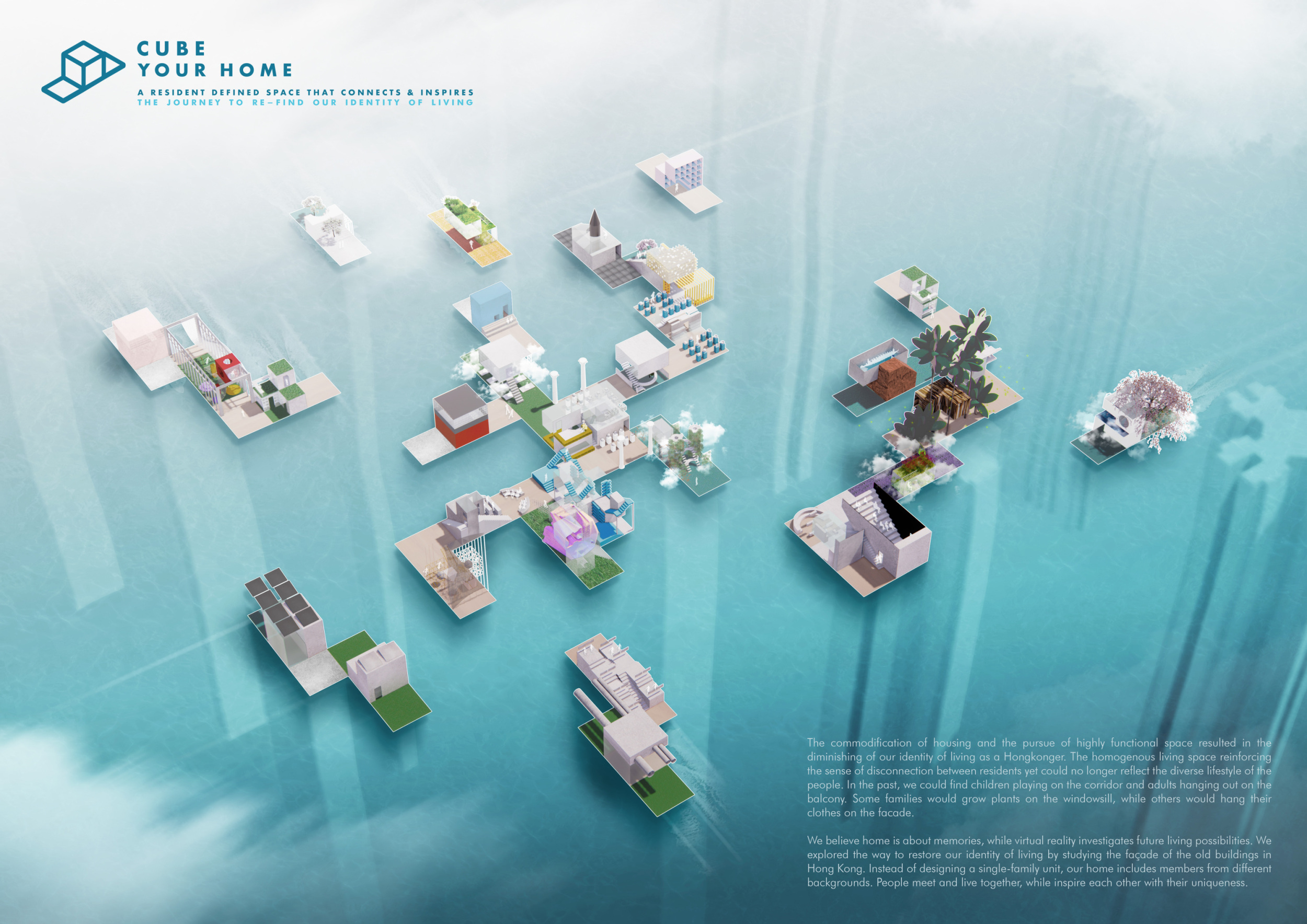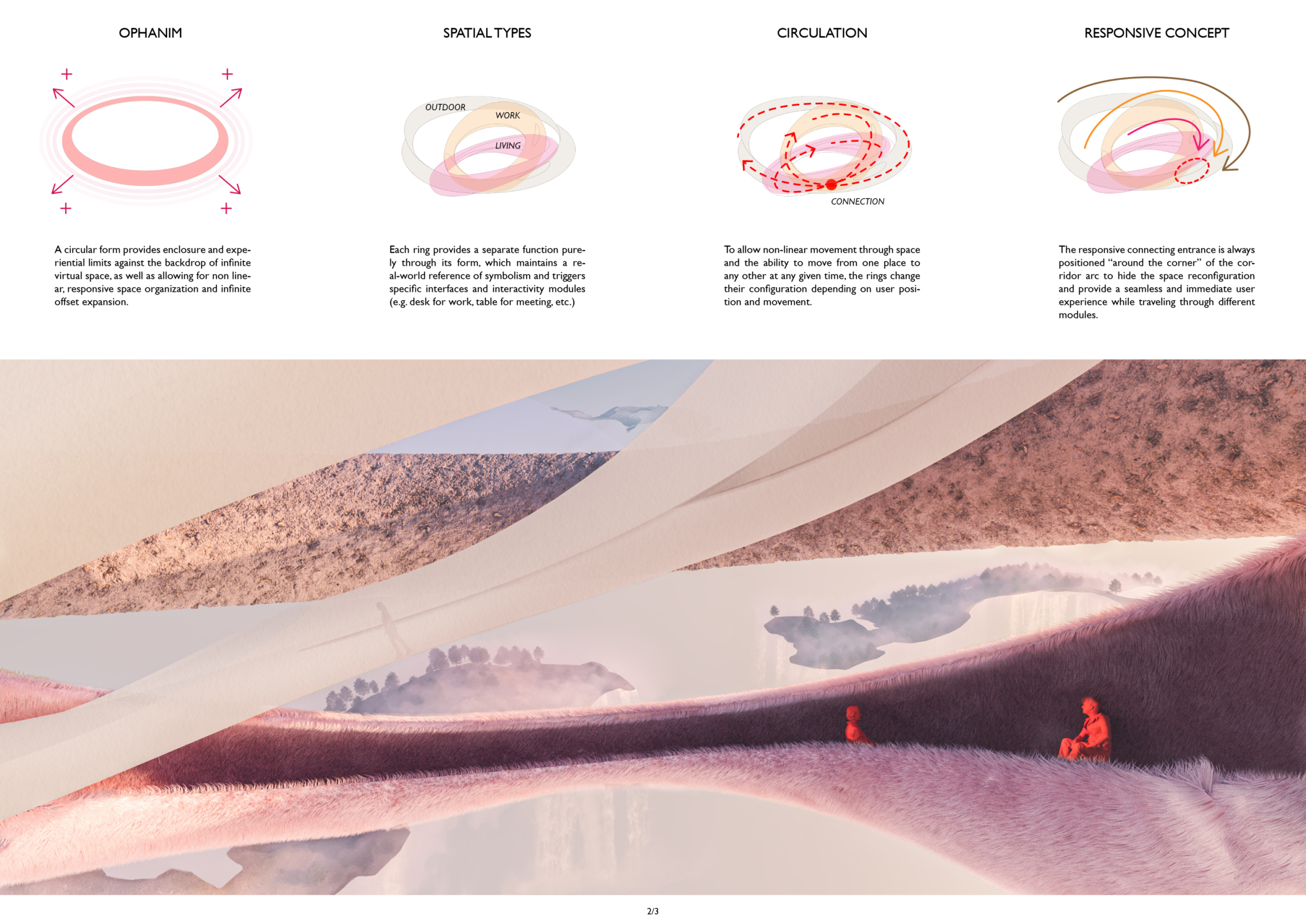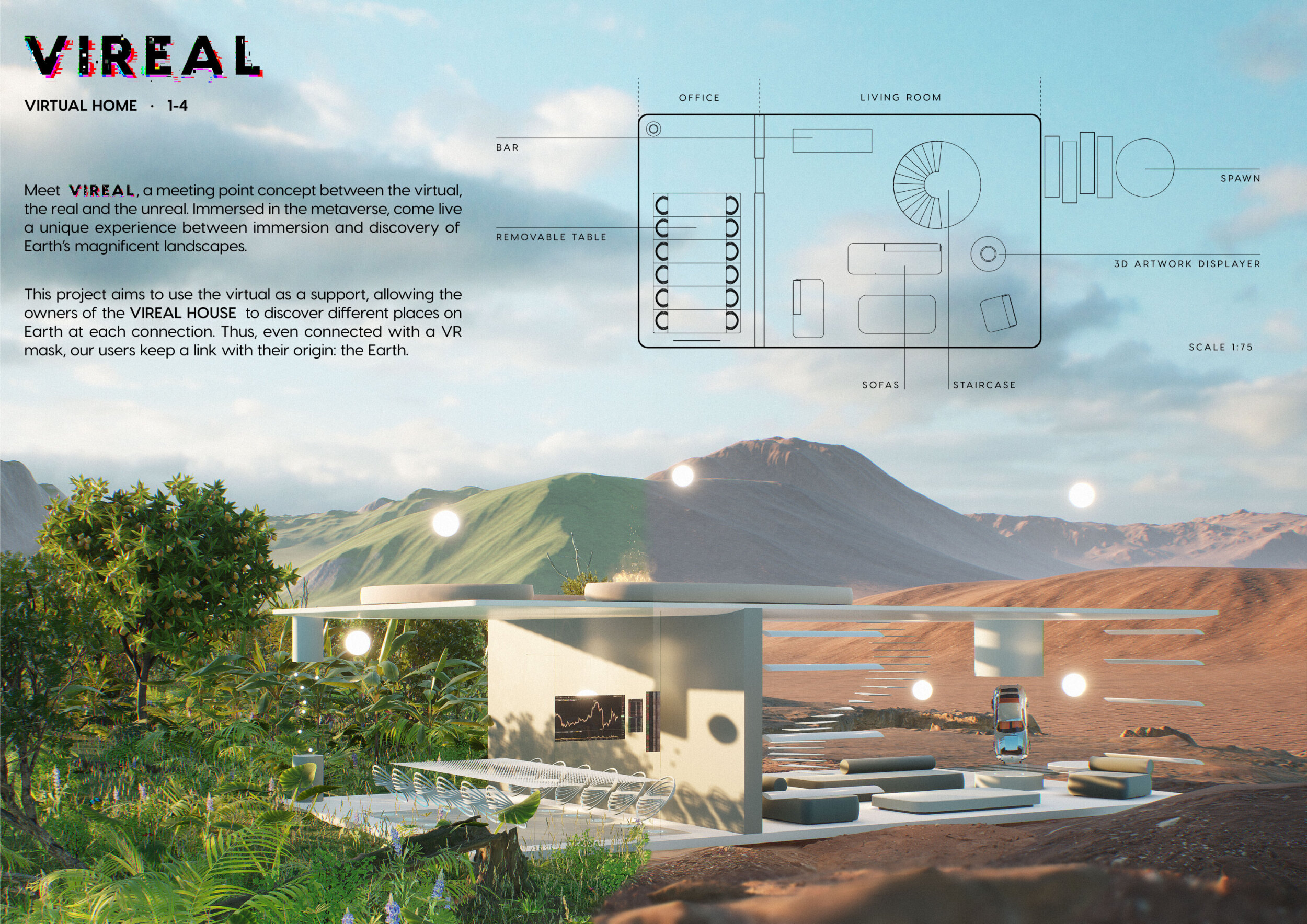 The Neo-Dimension references the film Inception, and proposes a “loop” that creates a dreamscape cubic home, with mystical vistas, gravity-defying environments, and cozy interiors that float between reality and fantasy. It considers the 6 interior and 6 exterior faces of a geometrical cube as hosts, to 12 “active spaces”. Read more The jury writes: “The subversion of the sense of orientation and gravity is a blow to other projects that depict the cliche of a house in the cliff or the mountain or any idyllic landscape. This is a very strong project because it invents rules on how a digital real estate realm may be constructed, defying the rules and constraints of the physical realm - gravity, physics. It does not transfer the ideal home in a digitized world, but instead constructs a new series of values. There are no illogical spaces like a bedroom, or bathroom - all the rooms are instead meaningful to a virtual space. It studies varying levels of security and privacy. It explores the limits of the virtual world, where none of our physical laws are applicable. The concept is elaborate and gives room to imagination and adventure. The chosen graphic language is very appropriate for the family of ideas at stake.”
