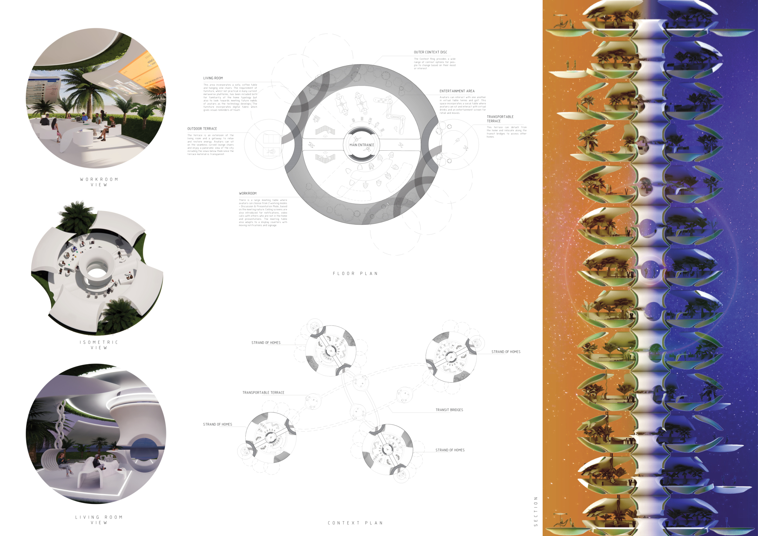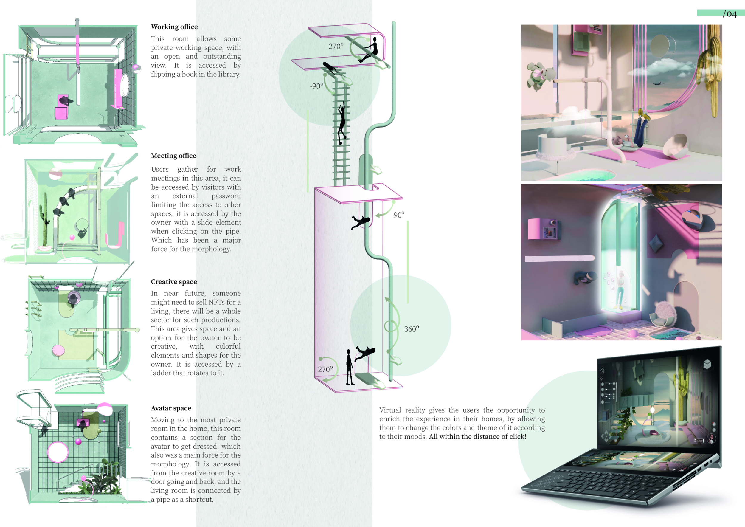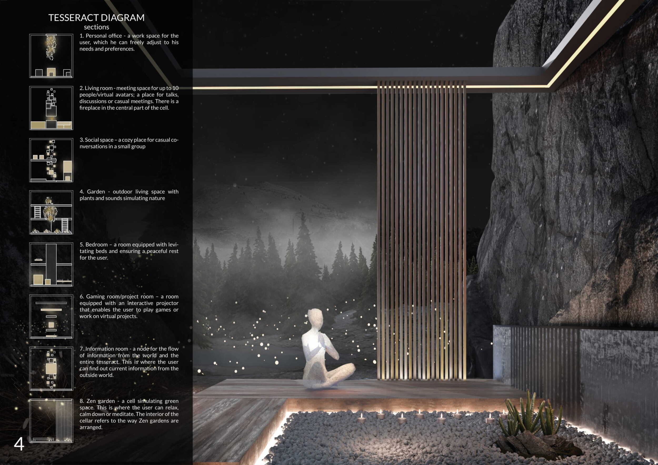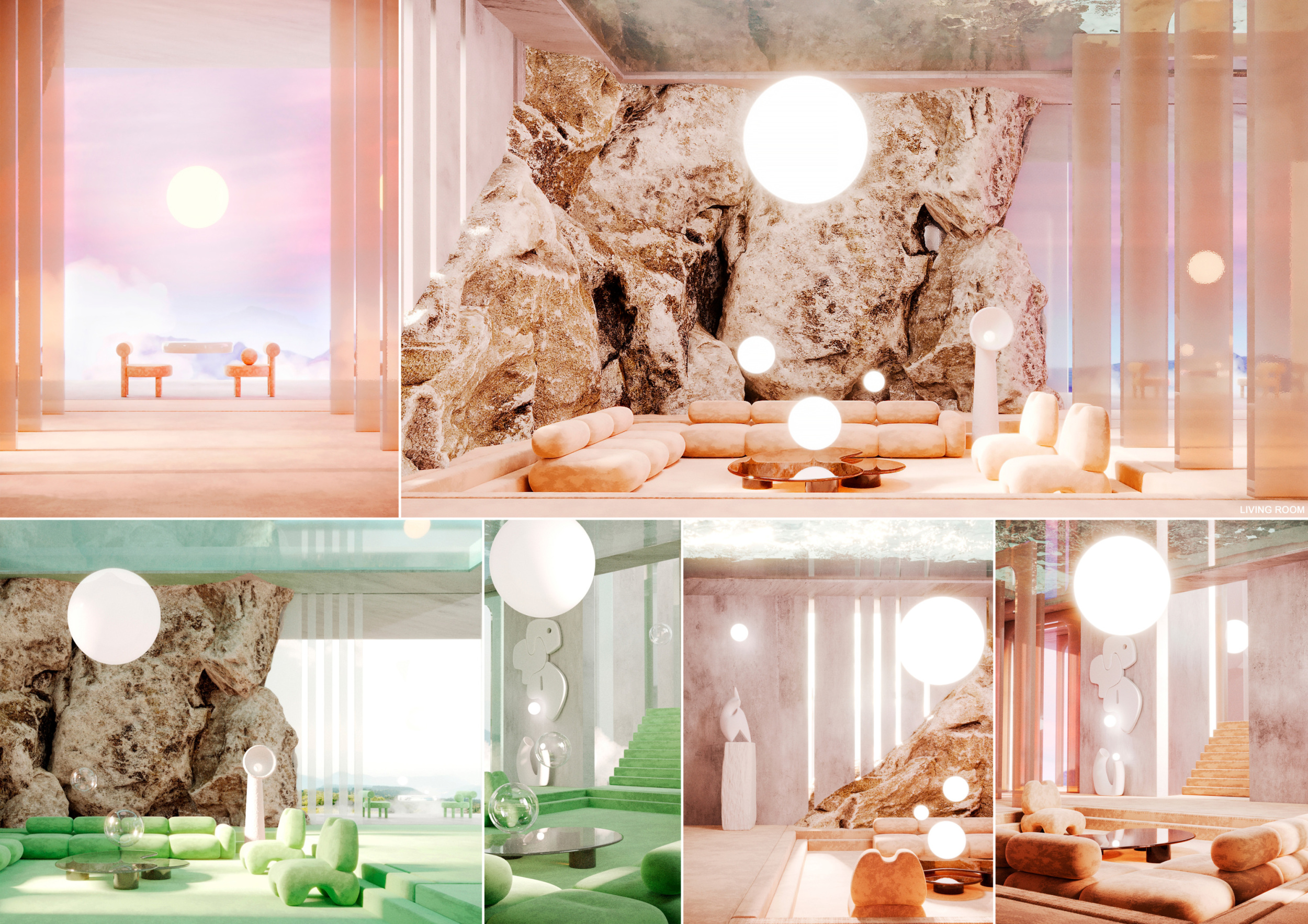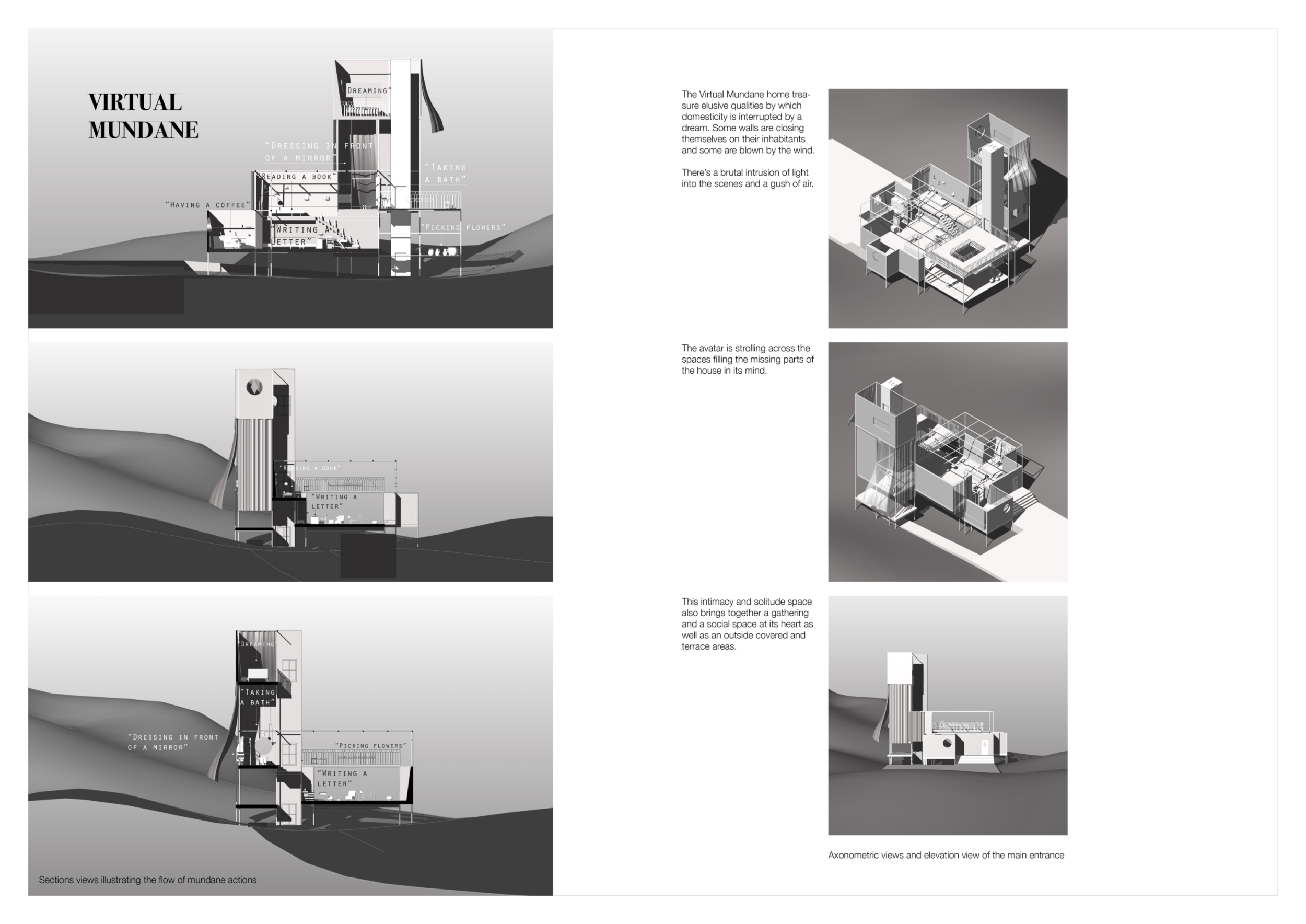 The Neo-Dimension references the film Inception, and proposes a “loop” that creates a dreamscape cubic home, with mystical vistas, gravity-defying environments, and cozy interiors that float between reality and fantasy. It considers the 6 interior and 6 exterior faces of a geometrical cube as hosts, to 12 “active spaces”. Read more The jury writes: “The subversion of the sense of orientation and gravity is a blow to other projects that depict the cliche of a house in the cliff or the mountain or any idyllic landscape. This is a very strong project because it invents rules on how a digital real estate realm may be constructed, defying the rules and constraints of the physical realm - gravity, physics. It does not transfer the ideal home in a digitized world, but instead constructs a new series of values. There are no illogical spaces like a bedroom, or bathroom - all the rooms are instead meaningful to a virtual space. It studies varying levels of security and privacy. It explores the limits of the virtual world, where none of our physical laws are applicable. The concept is elaborate and gives room to imagination and adventure. The chosen graphic language is very appropriate for the family of ideas at stake.”