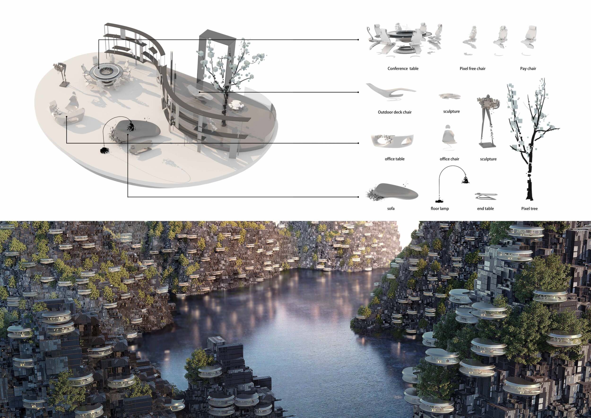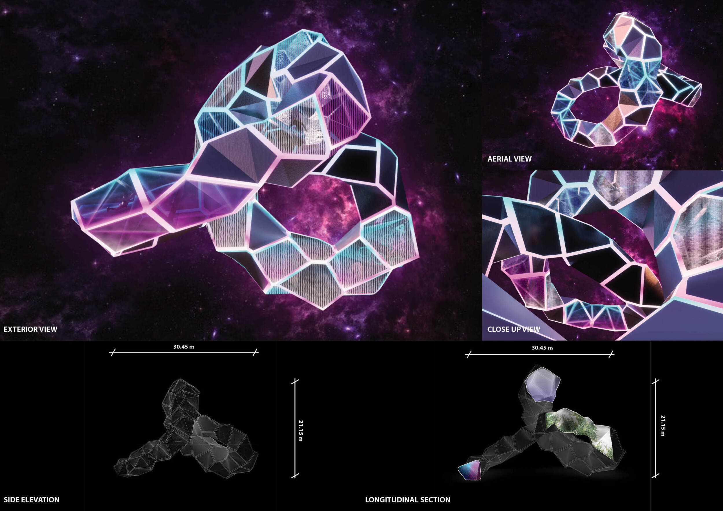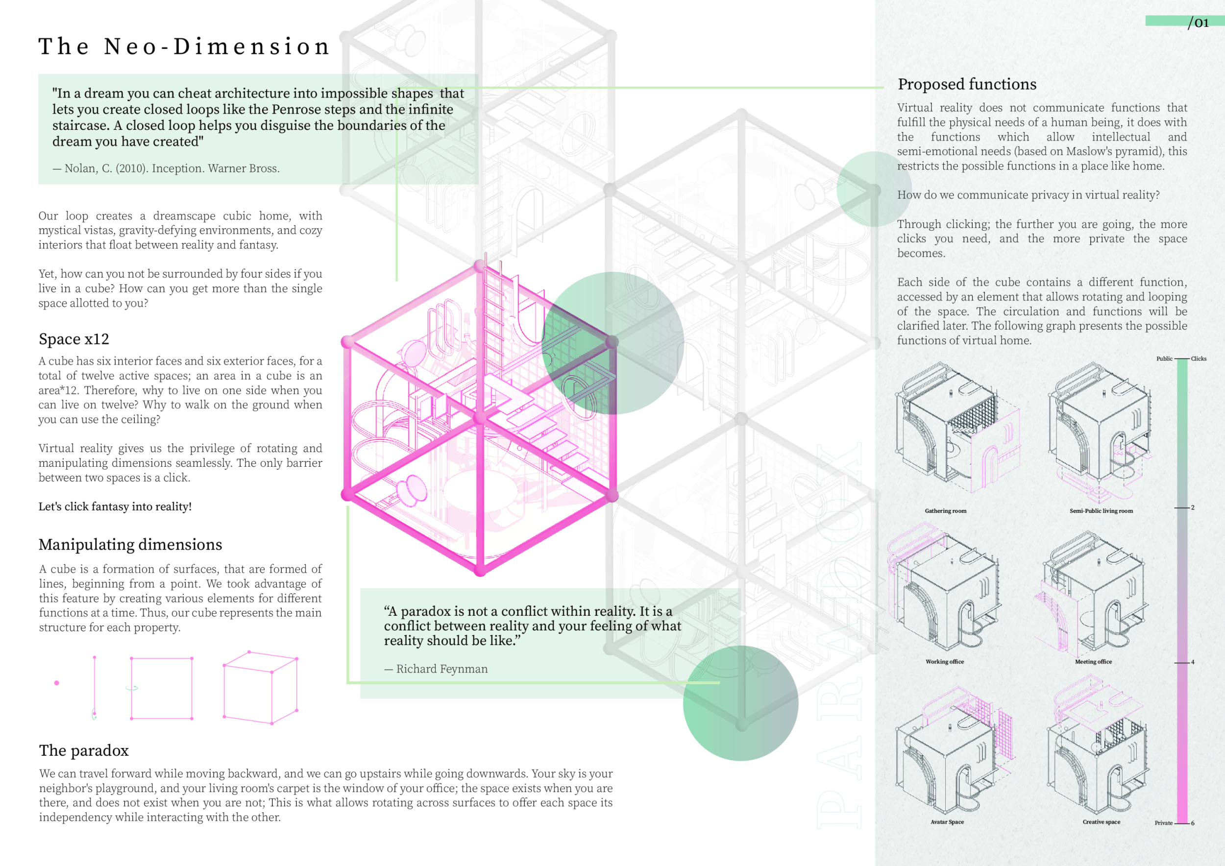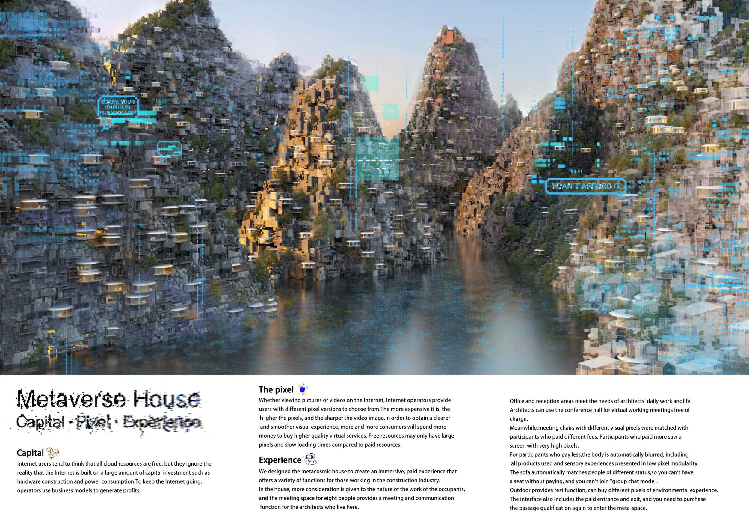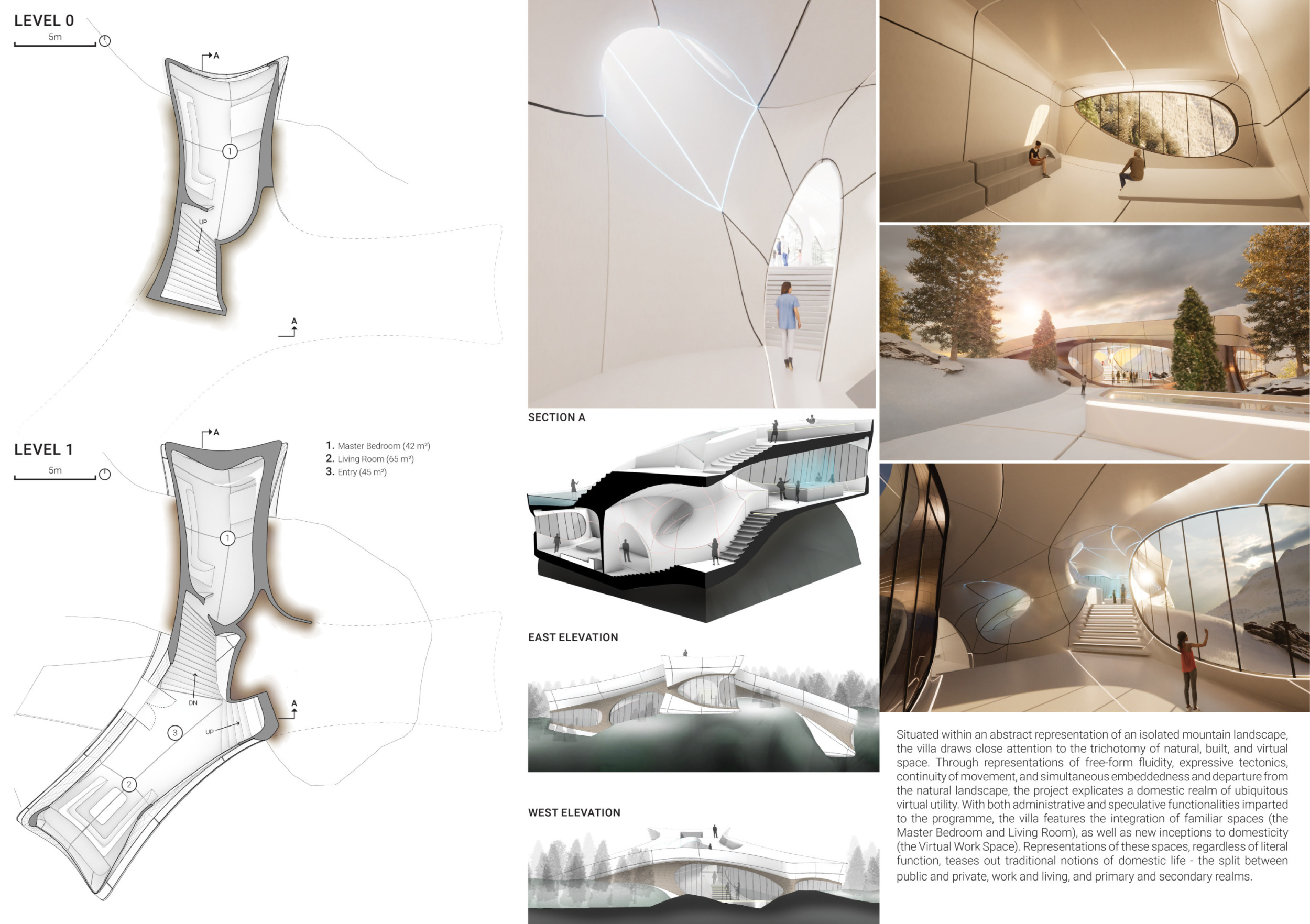 The Neo-Dimension references the film Inception, and proposes a “loop” that creates a dreamscape cubic home, with mystical vistas, gravity-defying environments, and cozy interiors that float between reality and fantasy. It considers the 6 interior and 6 exterior faces of a geometrical cube as hosts, to 12 “active spaces”. Read more The jury writes: “The subversion of the sense of orientation and gravity is a blow to other projects that depict the cliche of a house in the cliff or the mountain or any idyllic landscape. This is a very strong project because it invents rules on how a digital real estate realm may be constructed, defying the rules and constraints of the physical realm - gravity, physics. It does not transfer the ideal home in a digitized world, but instead constructs a new series of values. There are no illogical spaces like a bedroom, or bathroom - all the rooms are instead meaningful to a virtual space. It studies varying levels of security and privacy. It explores the limits of the virtual world, where none of our physical laws are applicable. The concept is elaborate and gives room to imagination and adventure. The chosen graphic language is very appropriate for the family of ideas at stake.”