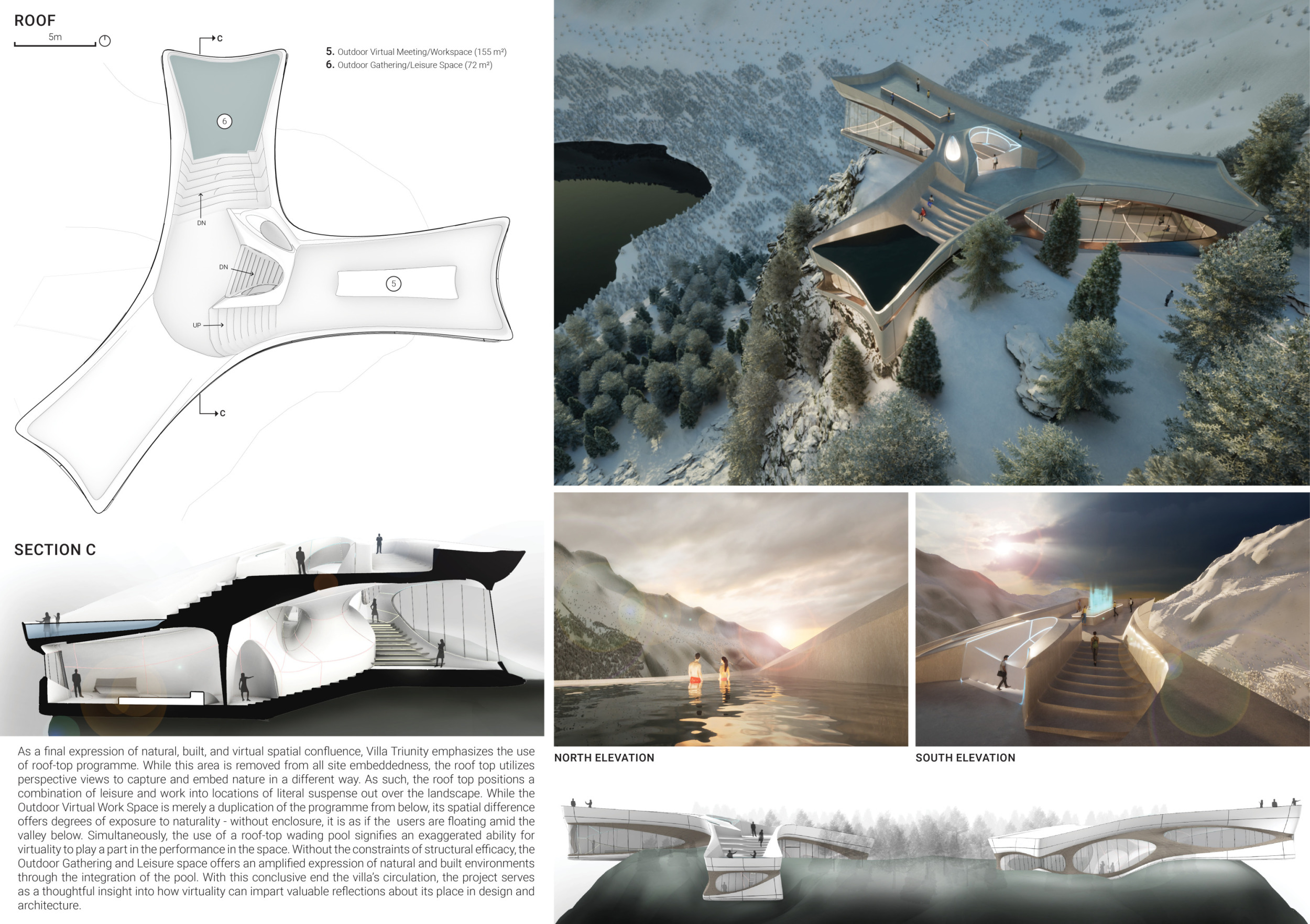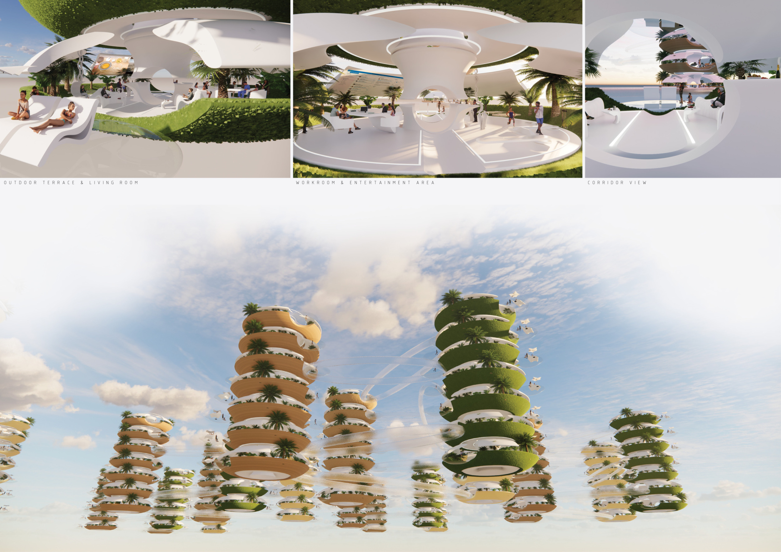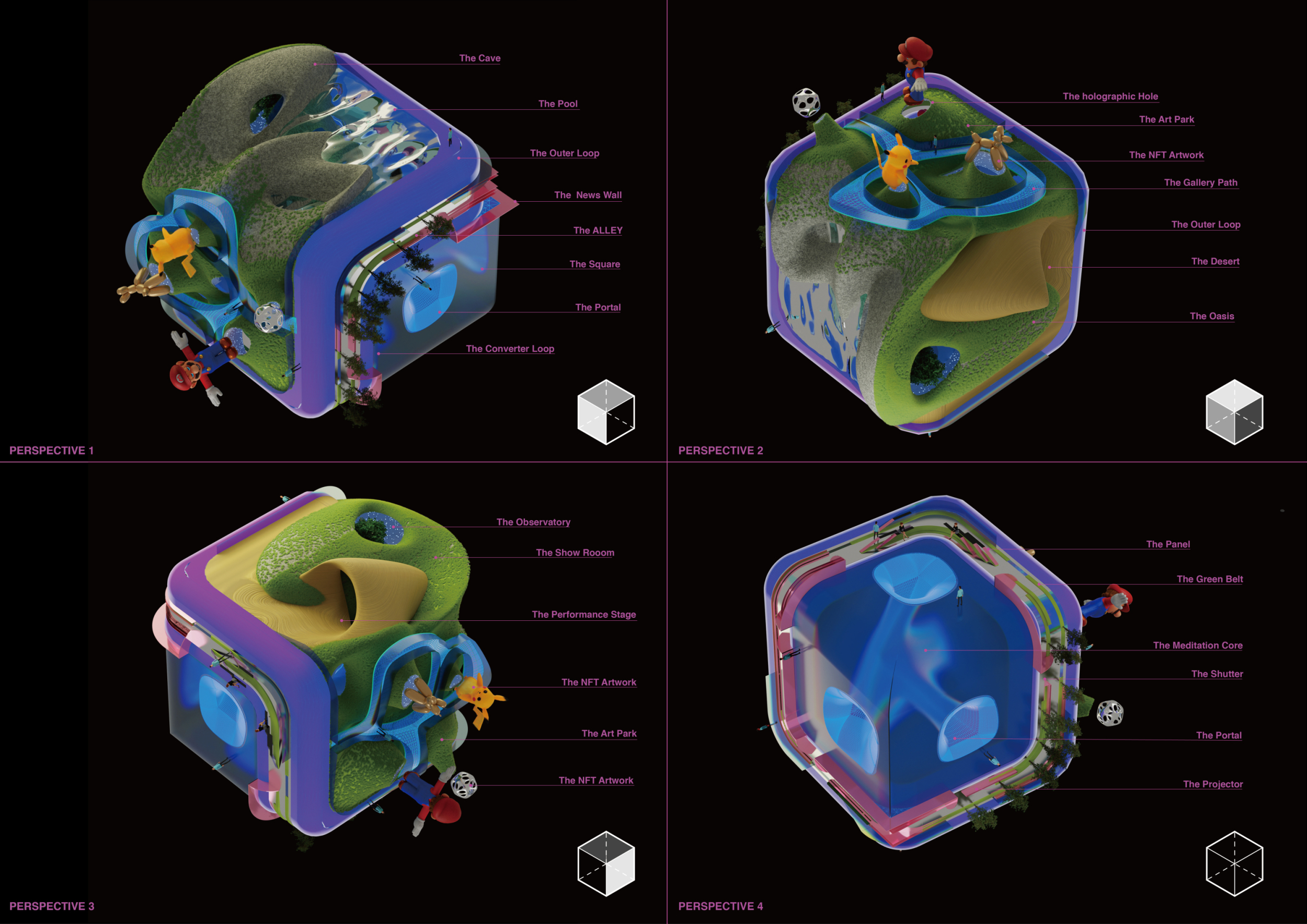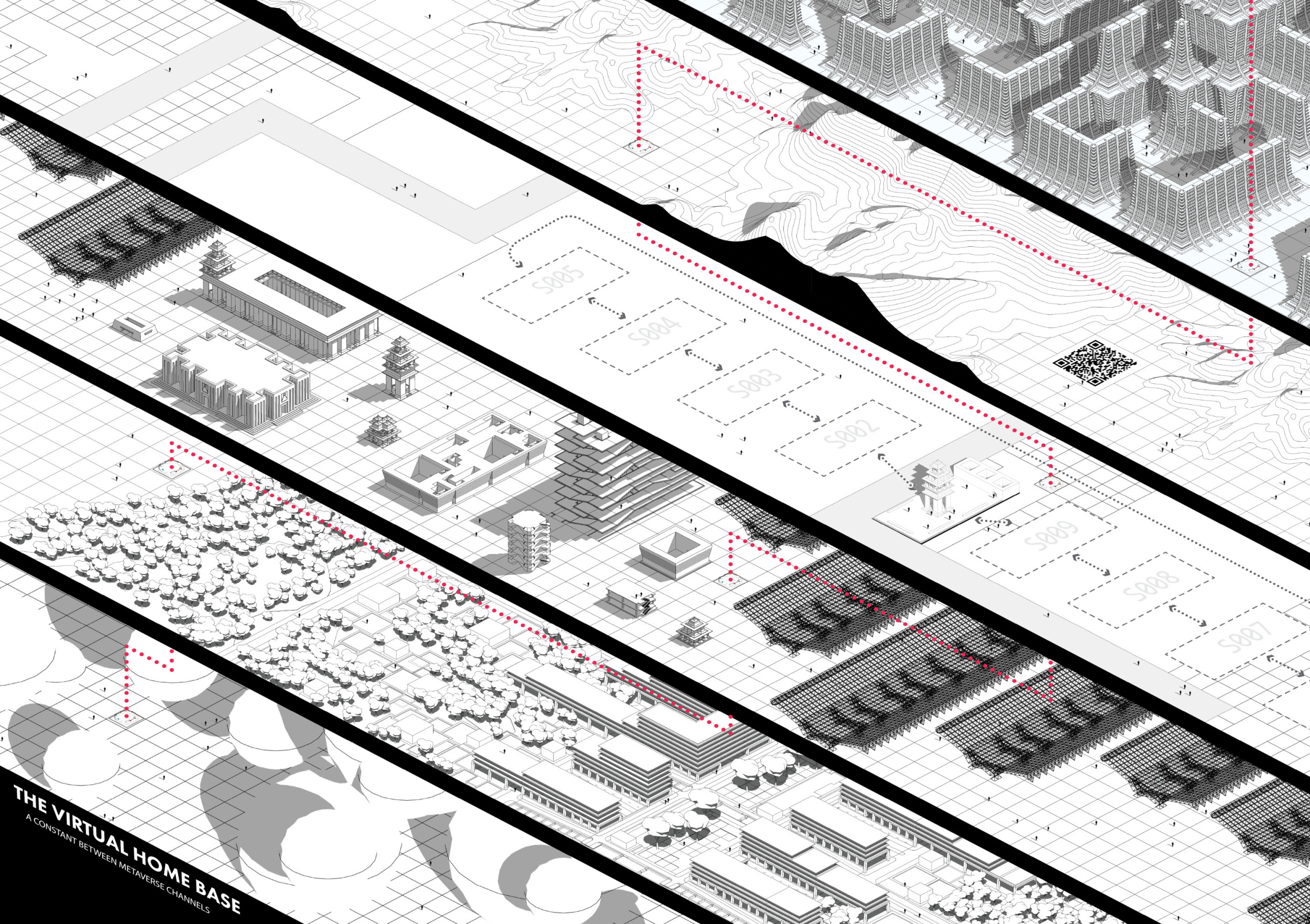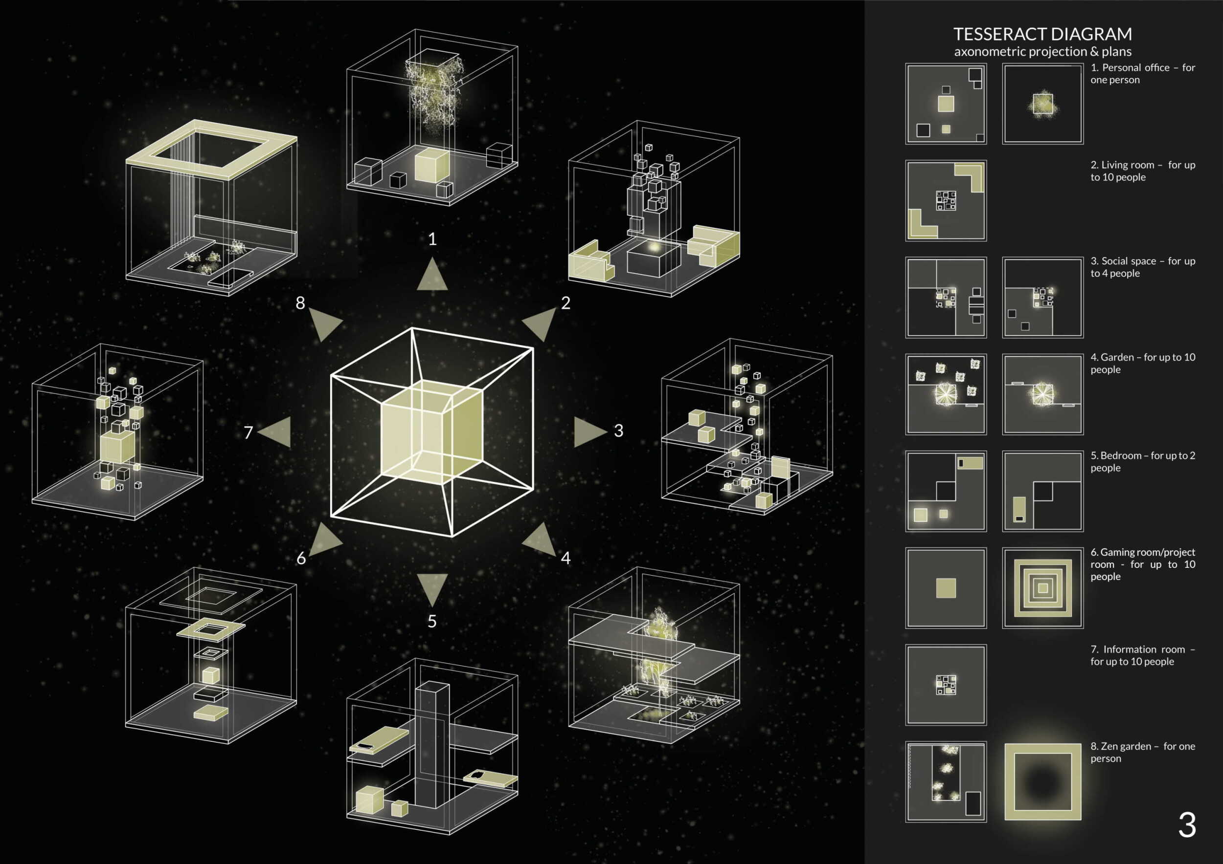 The Neo-Dimension references the film Inception, and proposes a “loop” that creates a dreamscape cubic home, with mystical vistas, gravity-defying environments, and cozy interiors that float between reality and fantasy. It considers the 6 interior and 6 exterior faces of a geometrical cube as hosts, to 12 “active spaces”. Read more The jury writes: “The subversion of the sense of orientation and gravity is a blow to other projects that depict the cliche of a house in the cliff or the mountain or any idyllic landscape. This is a very strong project because it invents rules on how a digital real estate realm may be constructed, defying the rules and constraints of the physical realm - gravity, physics. It does not transfer the ideal home in a digitized world, but instead constructs a new series of values. There are no illogical spaces like a bedroom, or bathroom - all the rooms are instead meaningful to a virtual space. It studies varying levels of security and privacy. It explores the limits of the virtual world, where none of our physical laws are applicable. The concept is elaborate and gives room to imagination and adventure. The chosen graphic language is very appropriate for the family of ideas at stake.”