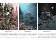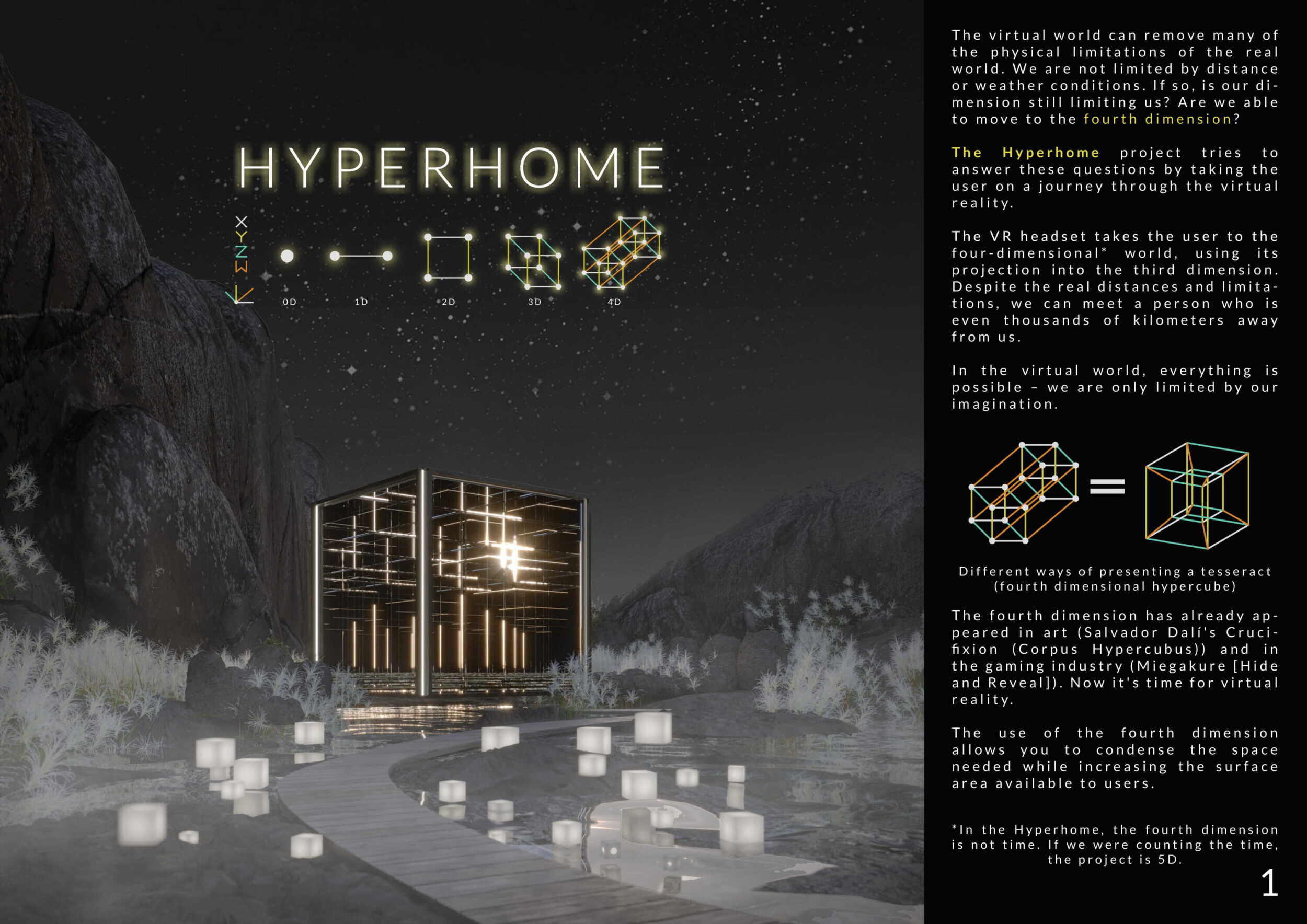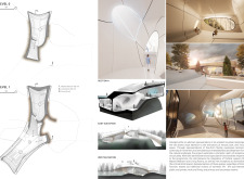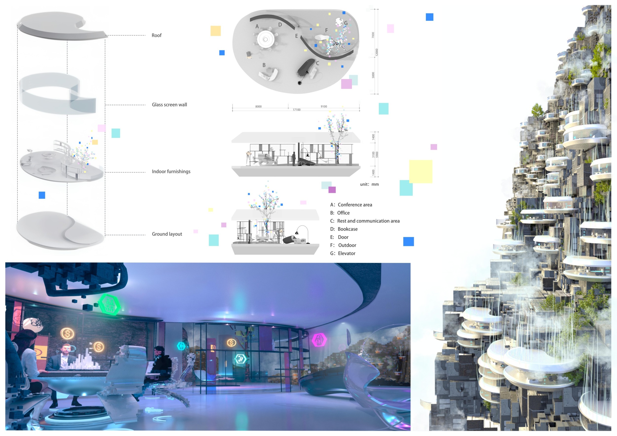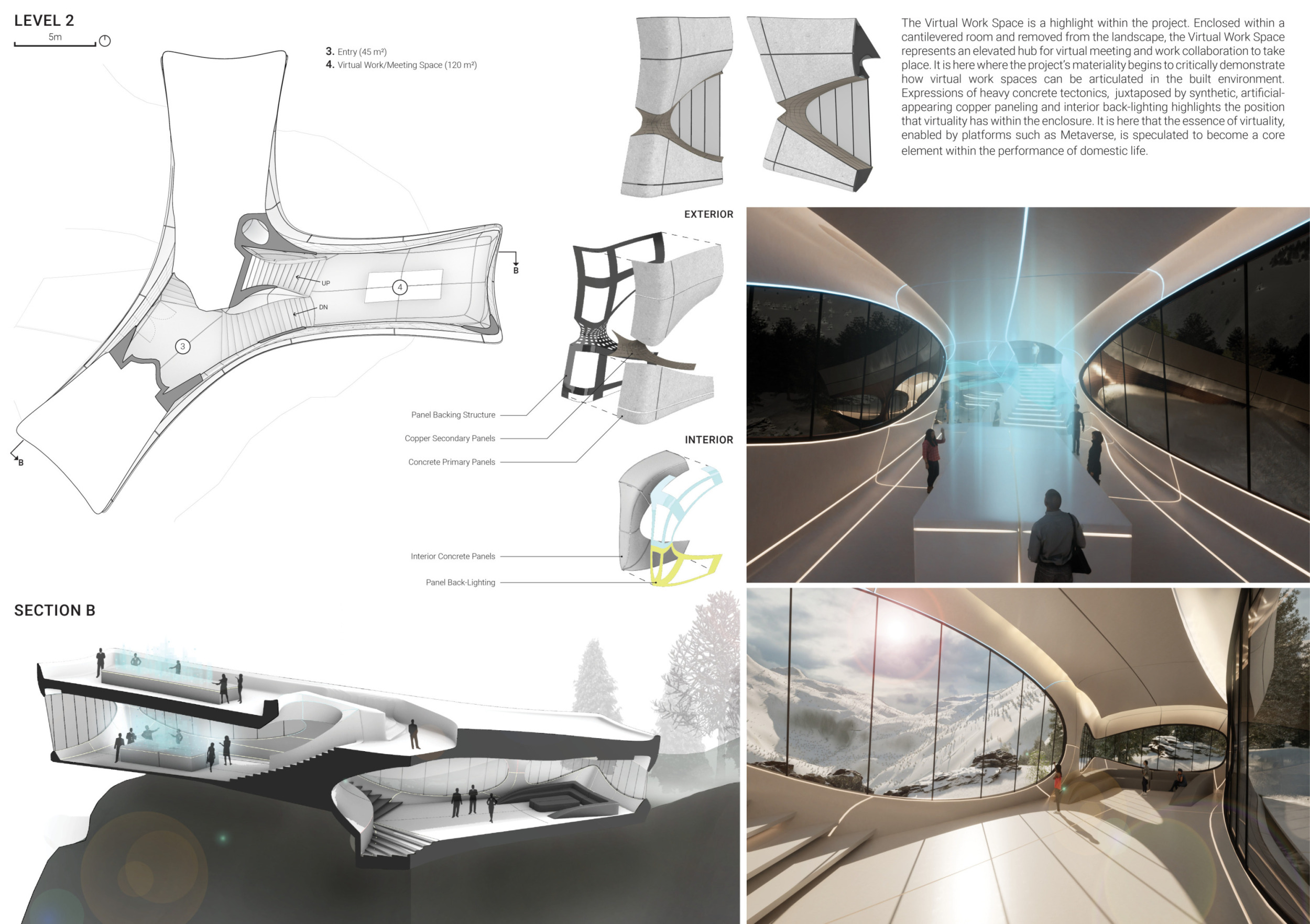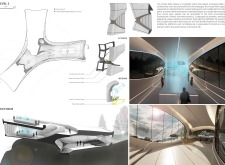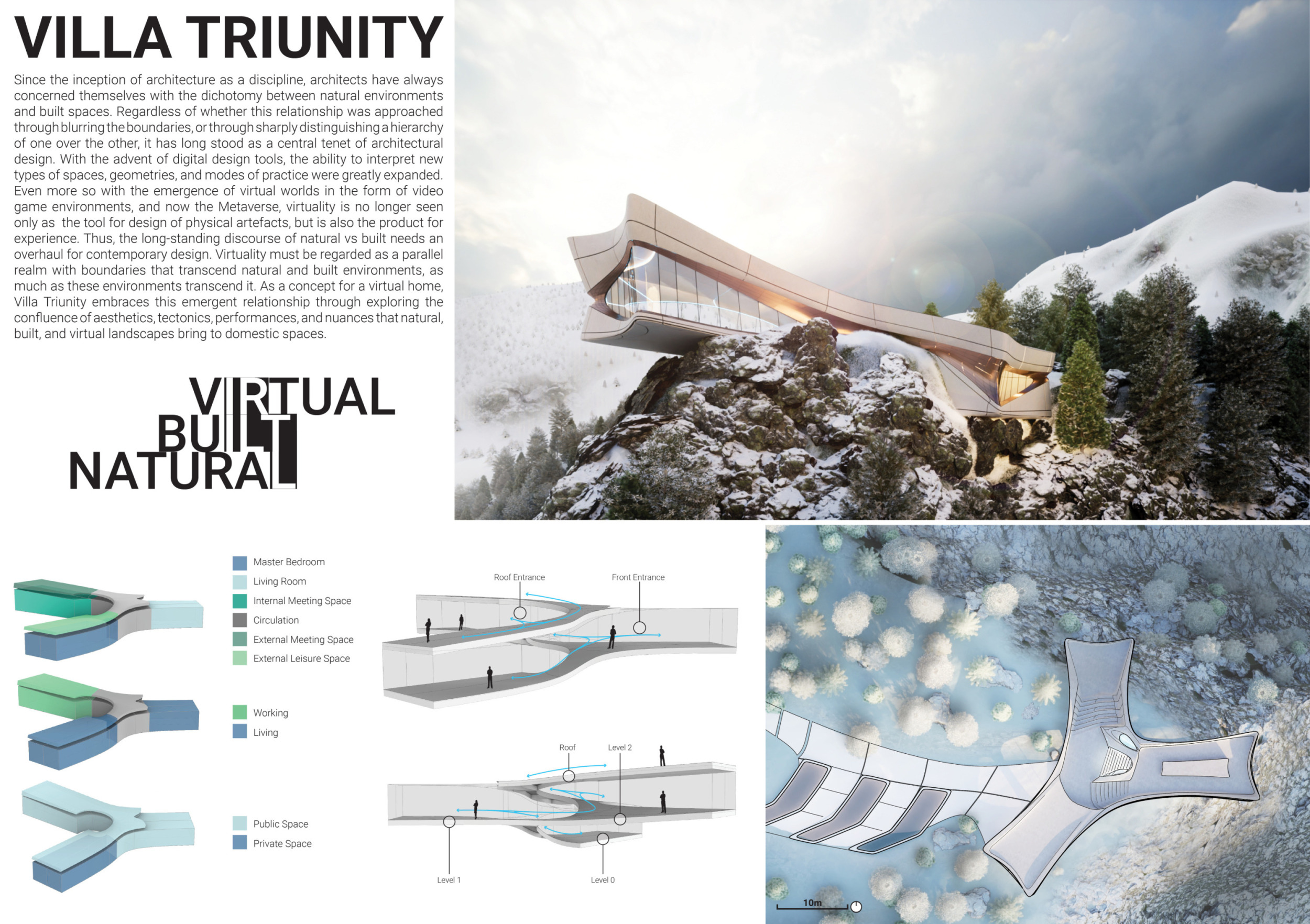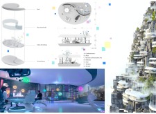 The Neo-Dimension references the film Inception, and proposes a “loop” that creates a dreamscape cubic home, with mystical vistas, gravity-defying environments, and cozy interiors that float between reality and fantasy. It considers the 6 interior and 6 exterior faces of a geometrical cube as hosts, to 12 “active spaces”. Read more The jury writes: “The subversion of the sense of orientation and gravity is a blow to other projects that depict the cliche of a house in the cliff or the mountain or any idyllic landscape. This is a very strong project because it invents rules on how a digital real estate realm may be constructed, defying the rules and constraints of the physical realm - gravity, physics. It does not transfer the ideal home in a digitized world, but instead constructs a new series of values. There are no illogical spaces like a bedroom, or bathroom - all the rooms are instead meaningful to a virtual space. It studies varying levels of security and privacy. It explores the limits of the virtual world, where none of our physical laws are applicable. The concept is elaborate and gives room to imagination and adventure. The chosen graphic language is very appropriate for the family of ideas at stake.”