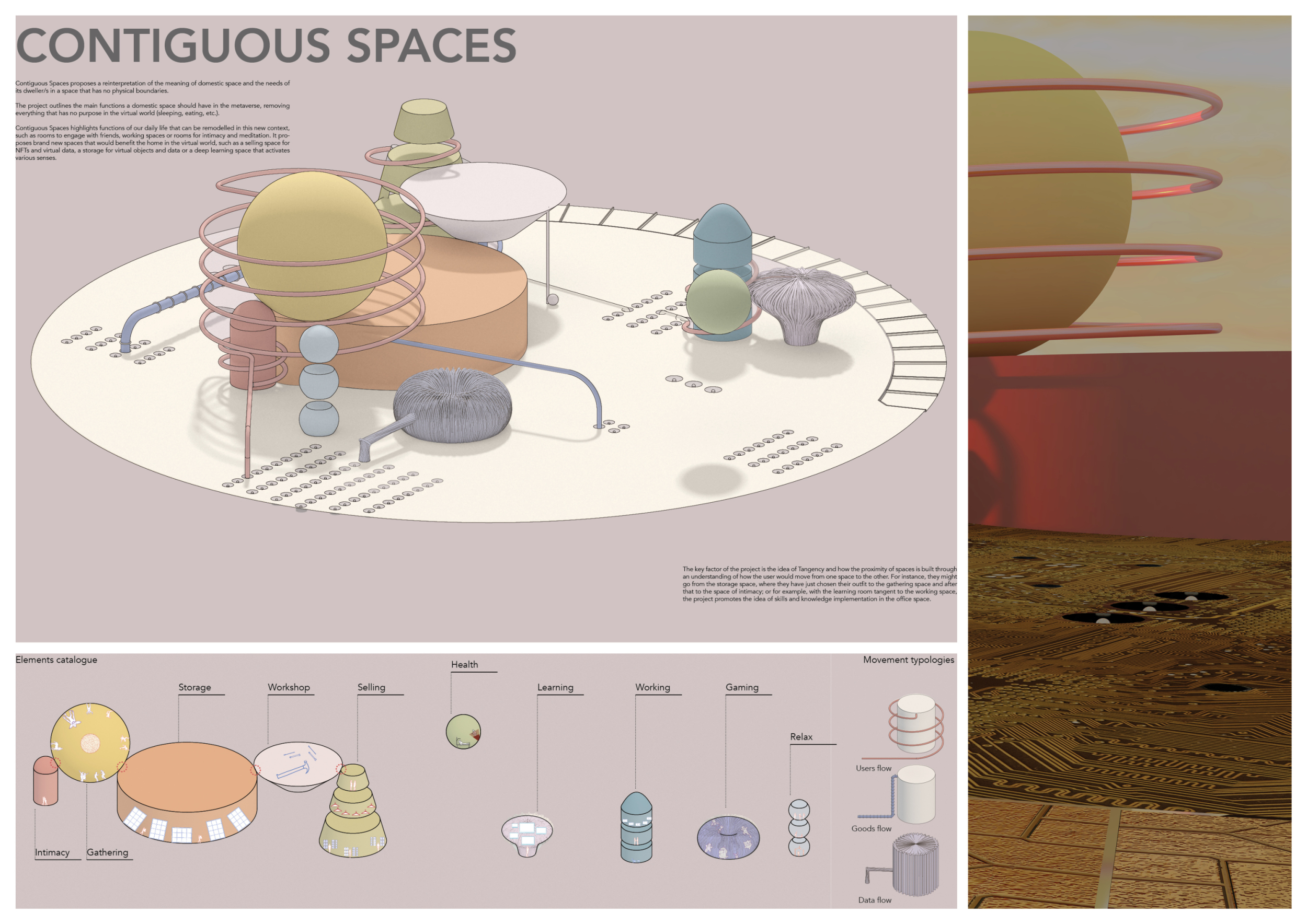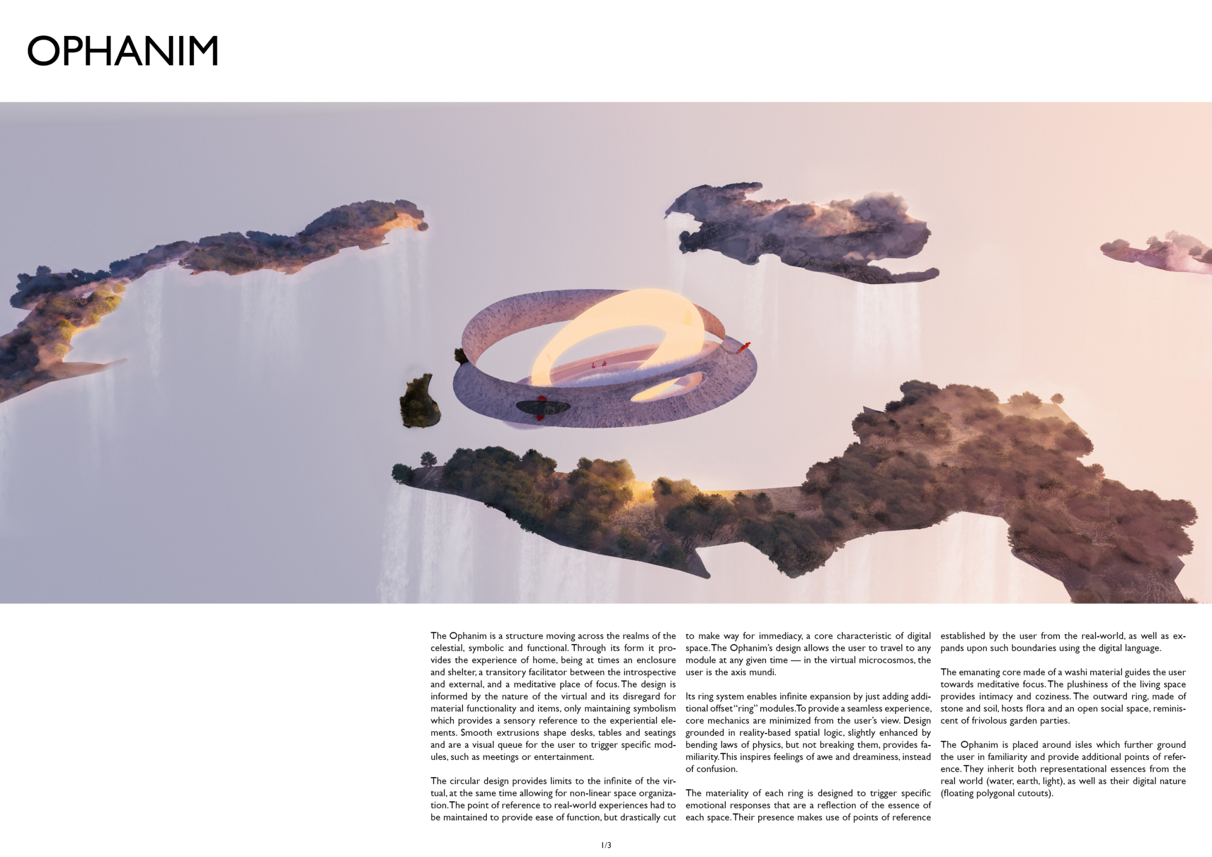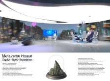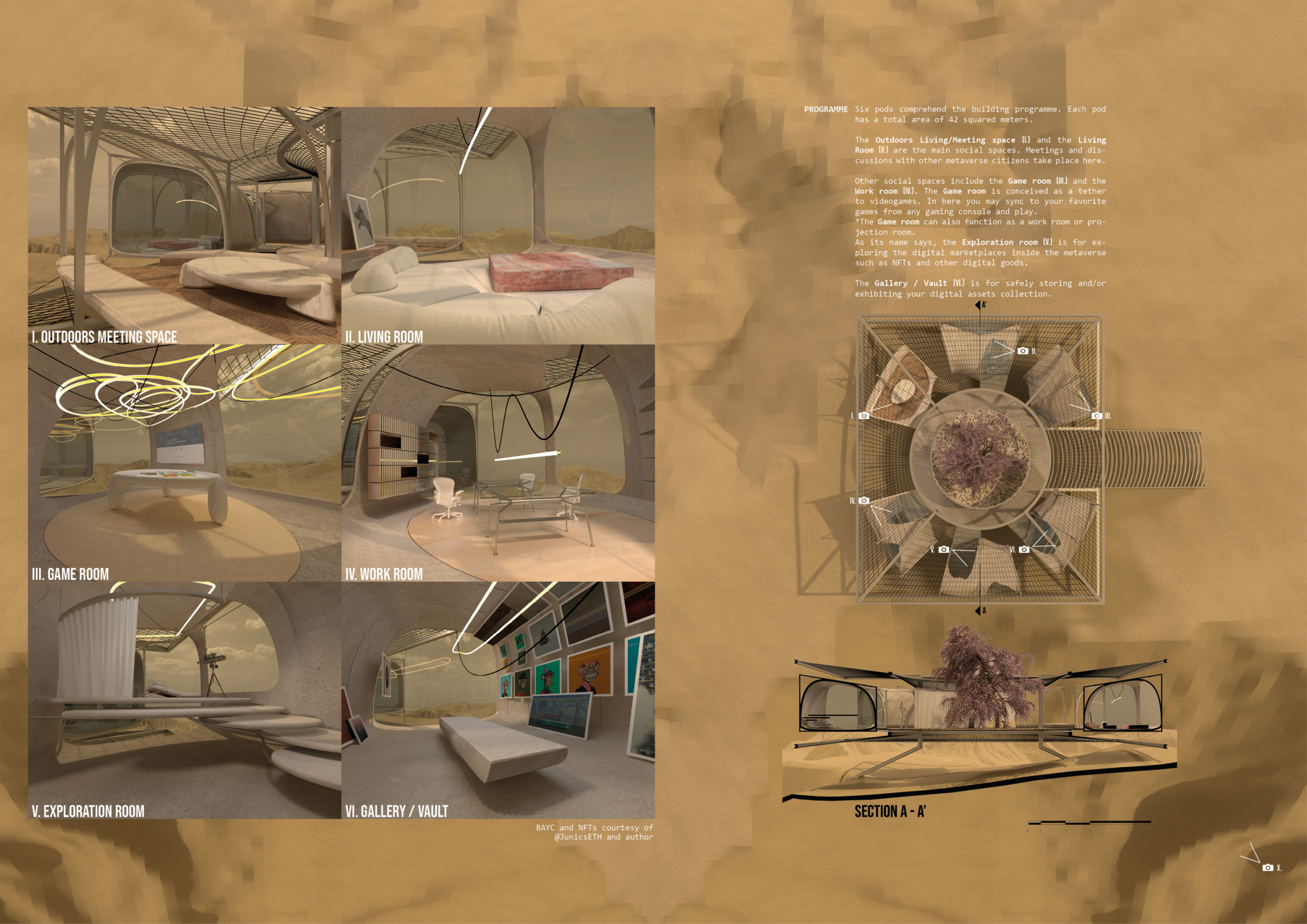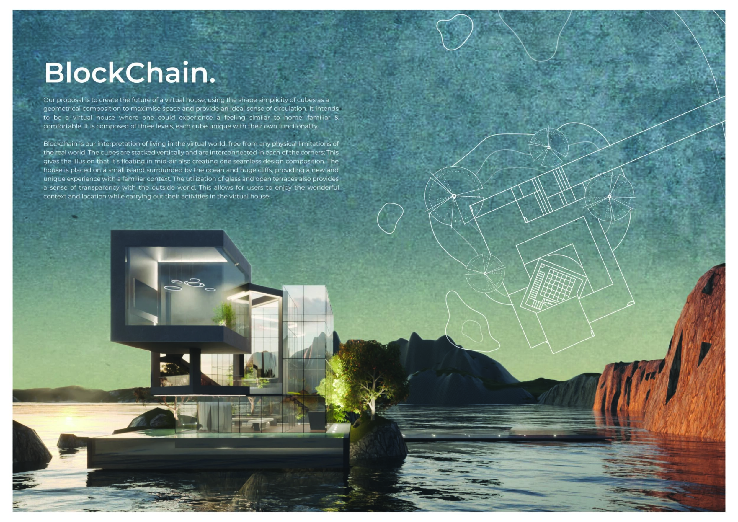 The designer of VH#10210 includes a deep analysis of background and reasoning for designing a virtual home. It states: “When moving into a real home, we ask ourselves, ‘What furniture would we use?’. Read more The same applies in the virtual realm, however in a Virtual Home we ask ourselves, ‘What is furniture for?’” The proposal is for a virtually immersive web3 application, based on the character of its users, built in a 3D environment and used for work, organization, leisure, entertainment and connecting with other users. The jury writes: “The project is a complex and wide vision of a virtual housing system that shows a deep understanding of the possibilities that might come with technological development, The forward-thinking nature of the author, and the well-thought-out scenario of the future that is grounded in the current shift in thinking about virtual living, is appreciated. The vision shows a universal approach. It has a strong conceptual basis materialized in an extremely delicate environment that invites users to stay and recreate their own demands. The outcome blended the realistic idea of space and architecture into the unrealistic setting of digital space. The representation is sublime.”