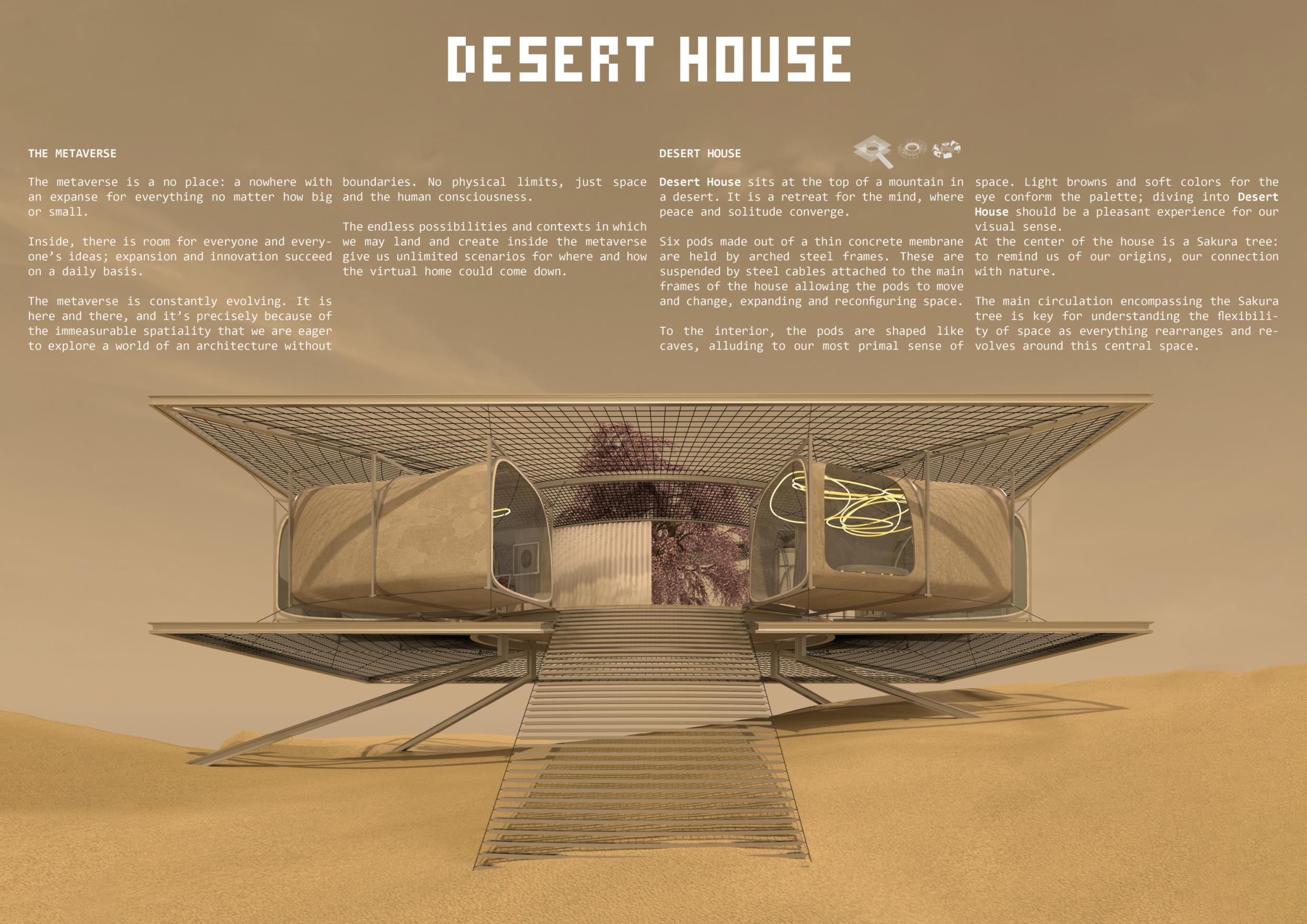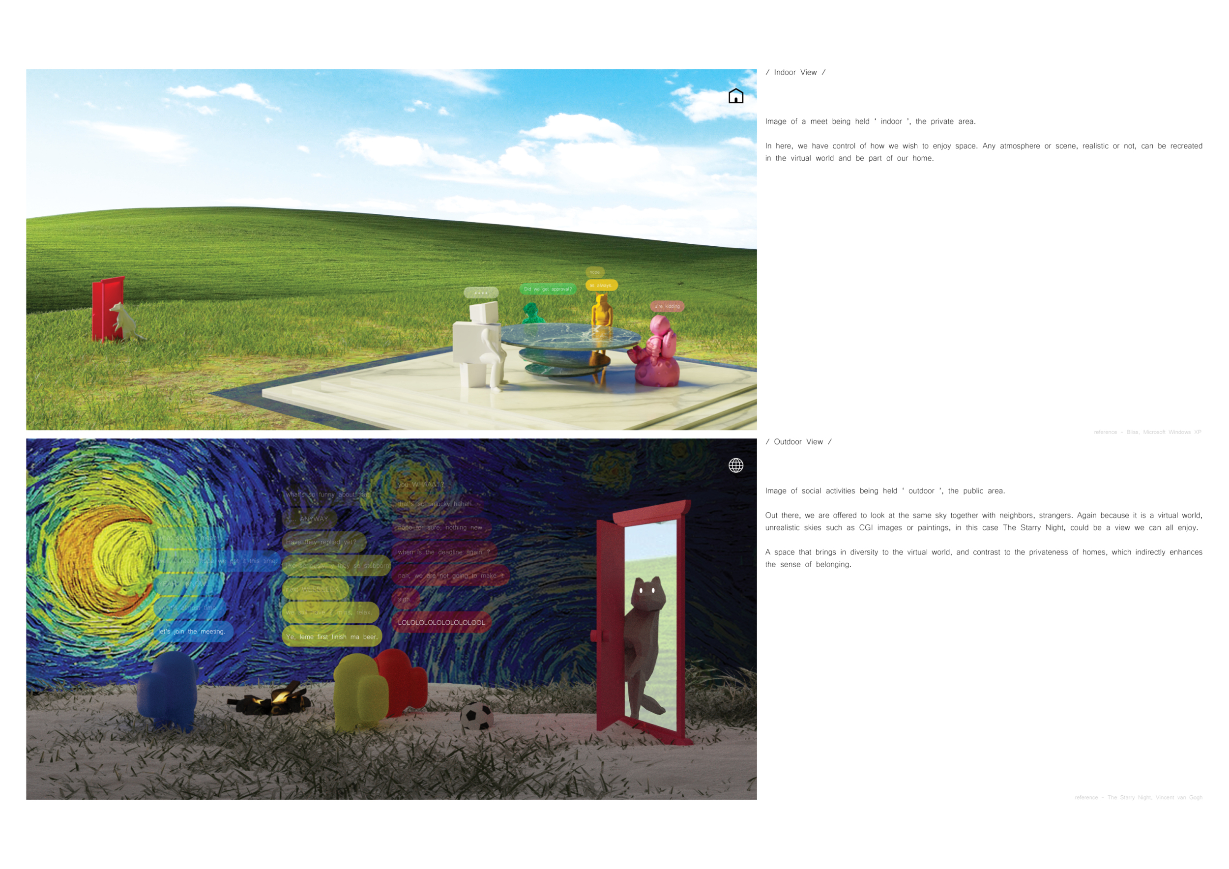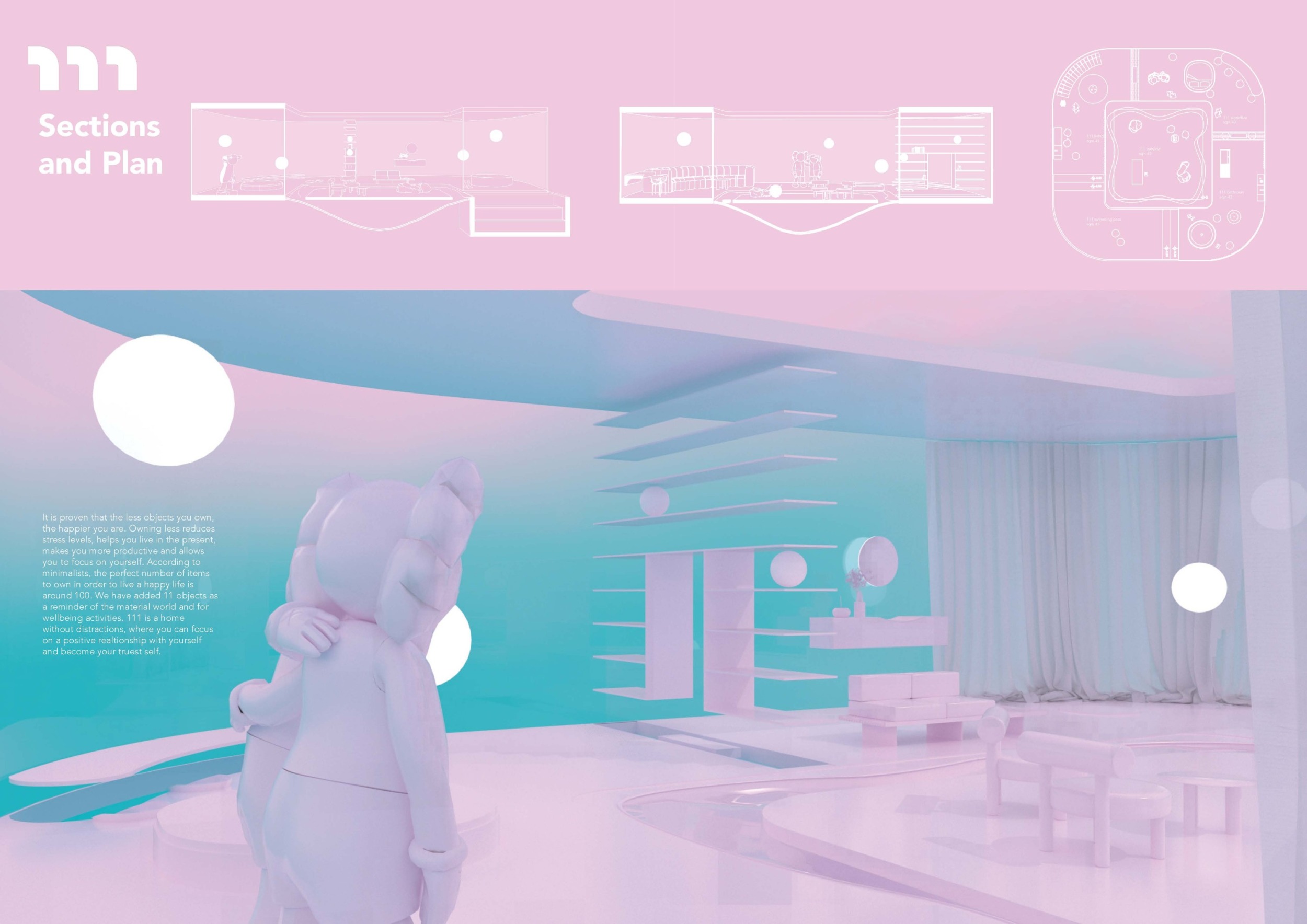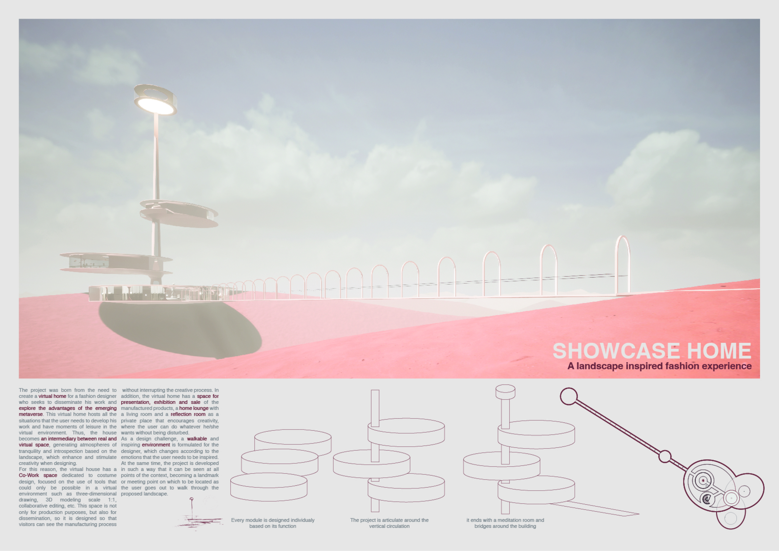 The designer of VH#10210 includes a deep analysis of background and reasoning for designing a virtual home. It states: “When moving into a real home, we ask ourselves, ‘What furniture would we use?’. Read more The same applies in the virtual realm, however in a Virtual Home we ask ourselves, ‘What is furniture for?’” The proposal is for a virtually immersive web3 application, based on the character of its users, built in a 3D environment and used for work, organization, leisure, entertainment and connecting with other users. The jury writes: “The project is a complex and wide vision of a virtual housing system that shows a deep understanding of the possibilities that might come with technological development, The forward-thinking nature of the author, and the well-thought-out scenario of the future that is grounded in the current shift in thinking about virtual living, is appreciated. The vision shows a universal approach. It has a strong conceptual basis materialized in an extremely delicate environment that invites users to stay and recreate their own demands. The outcome blended the realistic idea of space and architecture into the unrealistic setting of digital space. The representation is sublime.”