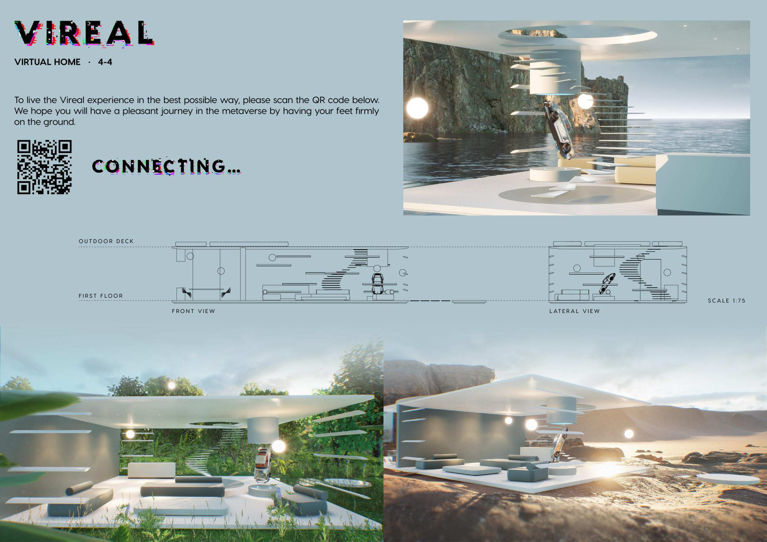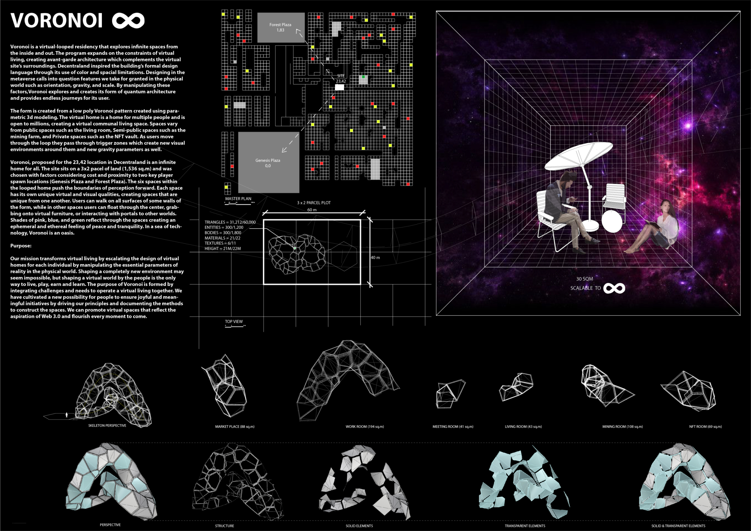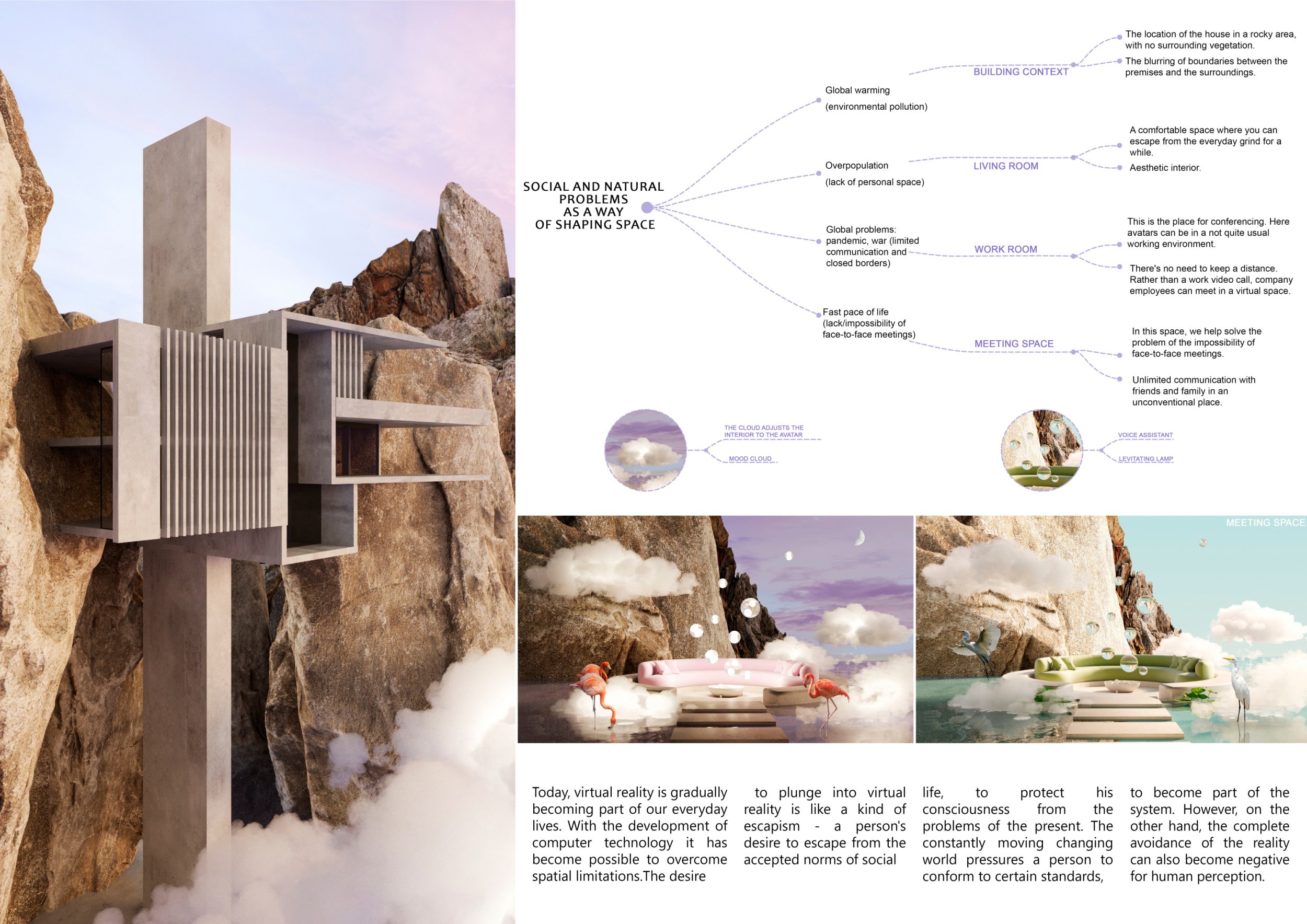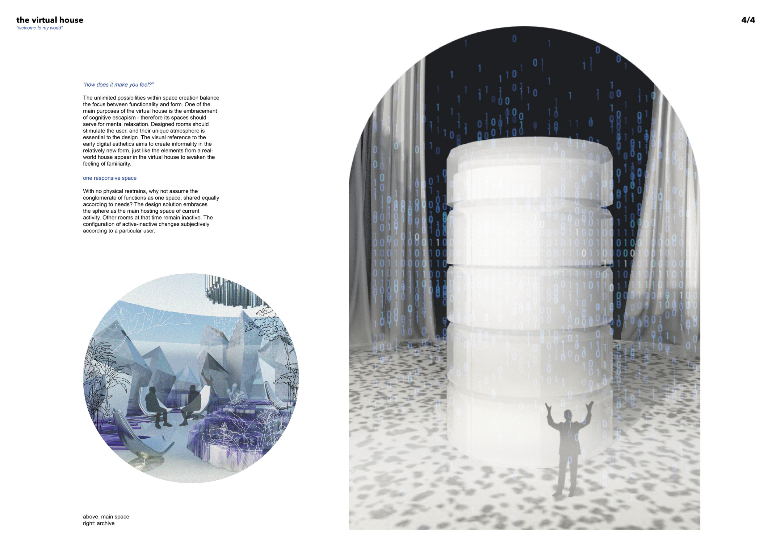 The designer of VH#10210 includes a deep analysis of background and reasoning for designing a virtual home. It states: “When moving into a real home, we ask ourselves, ‘What furniture would we use?’. Read more The same applies in the virtual realm, however in a Virtual Home we ask ourselves, ‘What is furniture for?’” The proposal is for a virtually immersive web3 application, based on the character of its users, built in a 3D environment and used for work, organization, leisure, entertainment and connecting with other users. The jury writes: “The project is a complex and wide vision of a virtual housing system that shows a deep understanding of the possibilities that might come with technological development, The forward-thinking nature of the author, and the well-thought-out scenario of the future that is grounded in the current shift in thinking about virtual living, is appreciated. The vision shows a universal approach. It has a strong conceptual basis materialized in an extremely delicate environment that invites users to stay and recreate their own demands. The outcome blended the realistic idea of space and architecture into the unrealistic setting of digital space. The representation is sublime.”