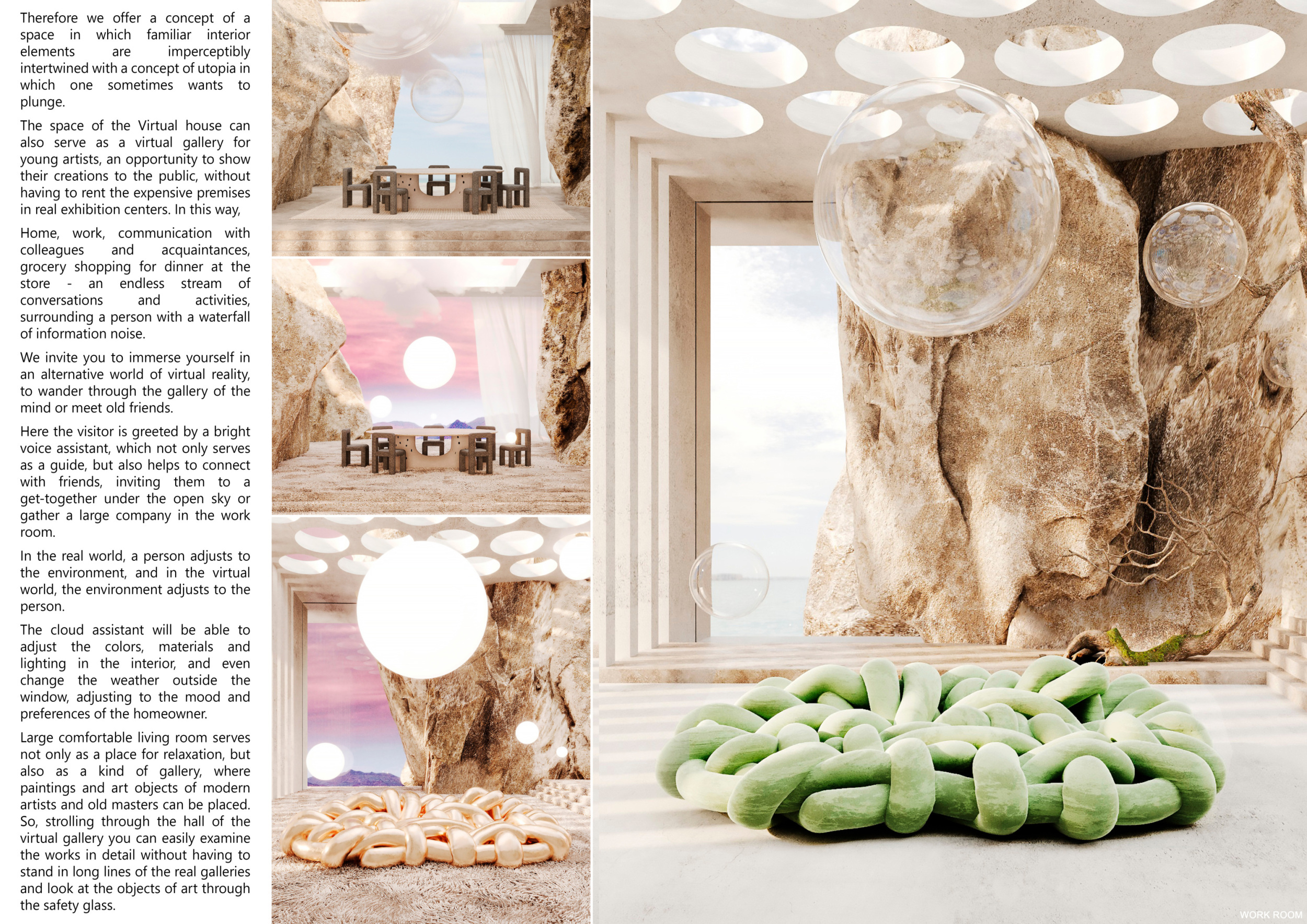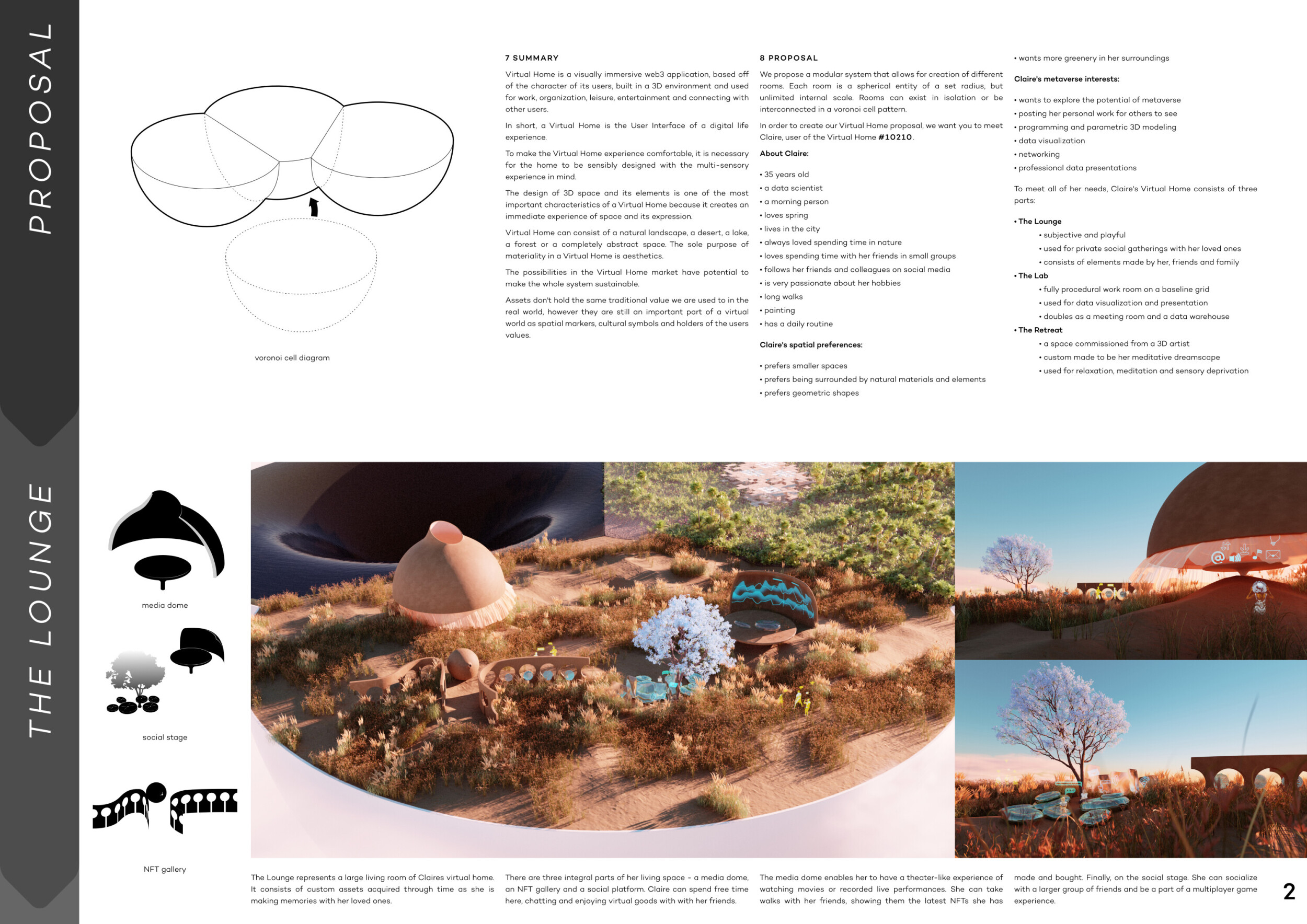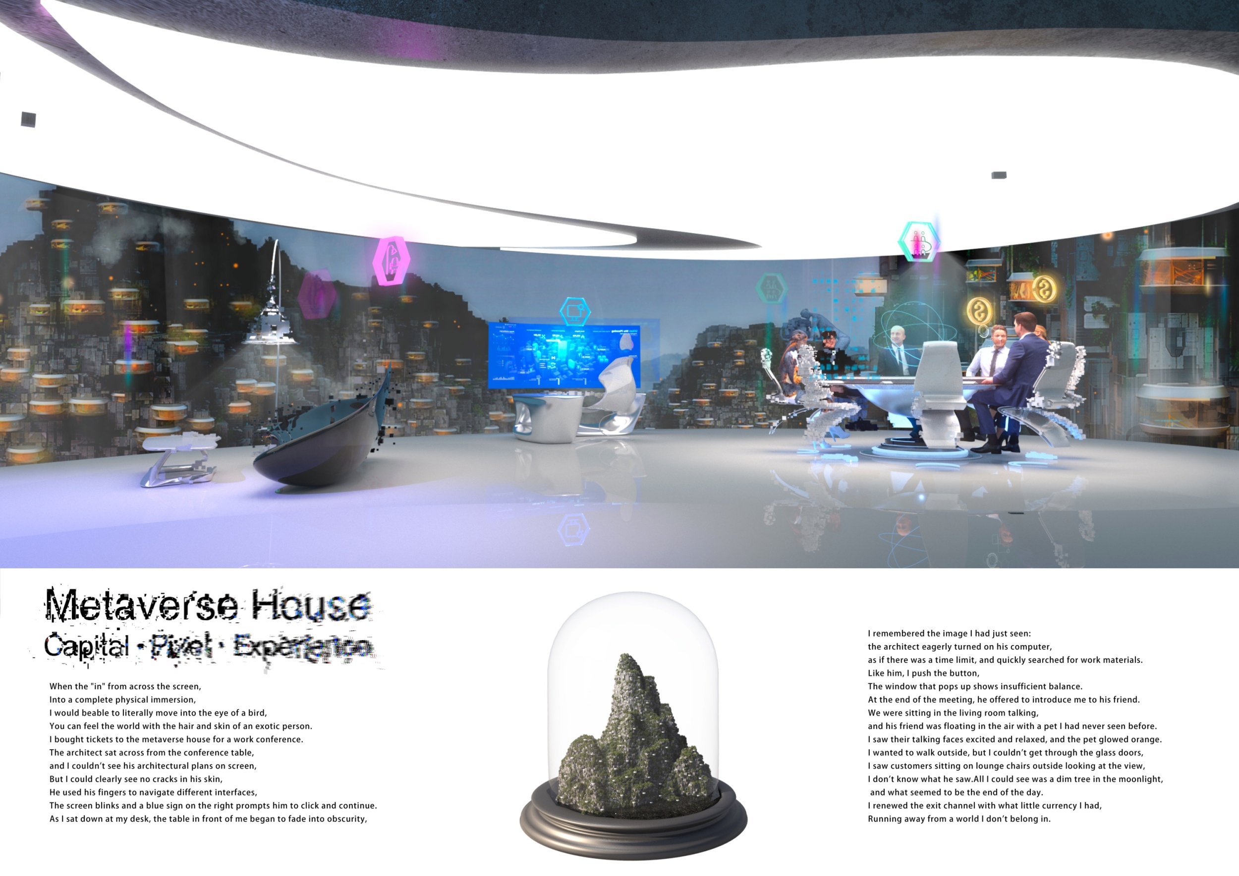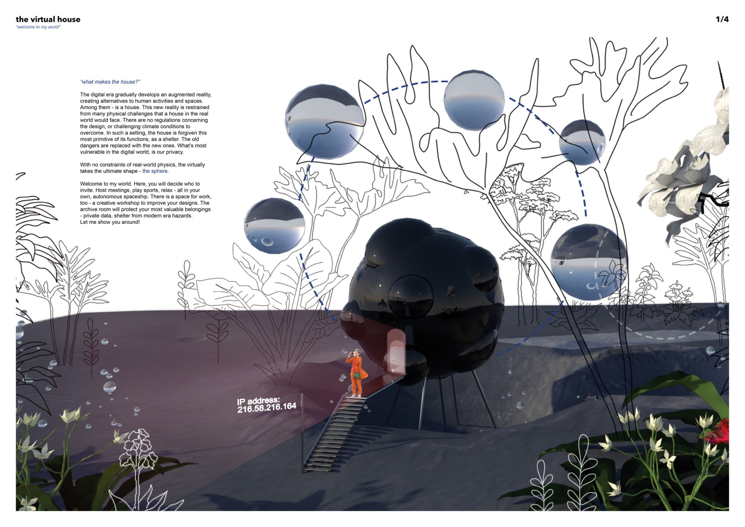 The designer of VH#10210 includes a deep analysis of background and reasoning for designing a virtual home. It states: “When moving into a real home, we ask ourselves, ‘What furniture would we use?’. Read more The same applies in the virtual realm, however in a Virtual Home we ask ourselves, ‘What is furniture for?’” The proposal is for a virtually immersive web3 application, based on the character of its users, built in a 3D environment and used for work, organization, leisure, entertainment and connecting with other users. The jury writes: “The project is a complex and wide vision of a virtual housing system that shows a deep understanding of the possibilities that might come with technological development, The forward-thinking nature of the author, and the well-thought-out scenario of the future that is grounded in the current shift in thinking about virtual living, is appreciated. The vision shows a universal approach. It has a strong conceptual basis materialized in an extremely delicate environment that invites users to stay and recreate their own demands. The outcome blended the realistic idea of space and architecture into the unrealistic setting of digital space. The representation is sublime.”