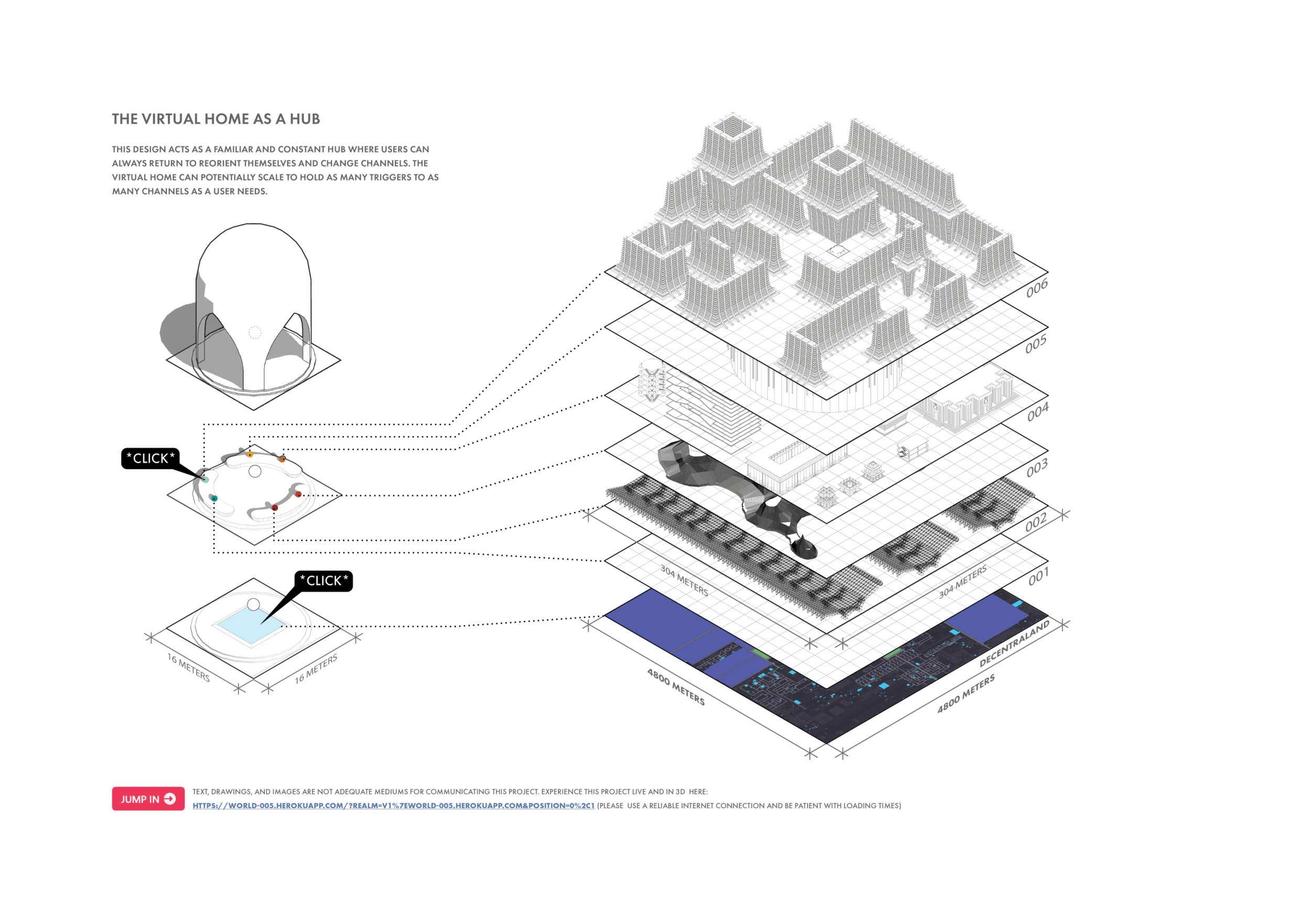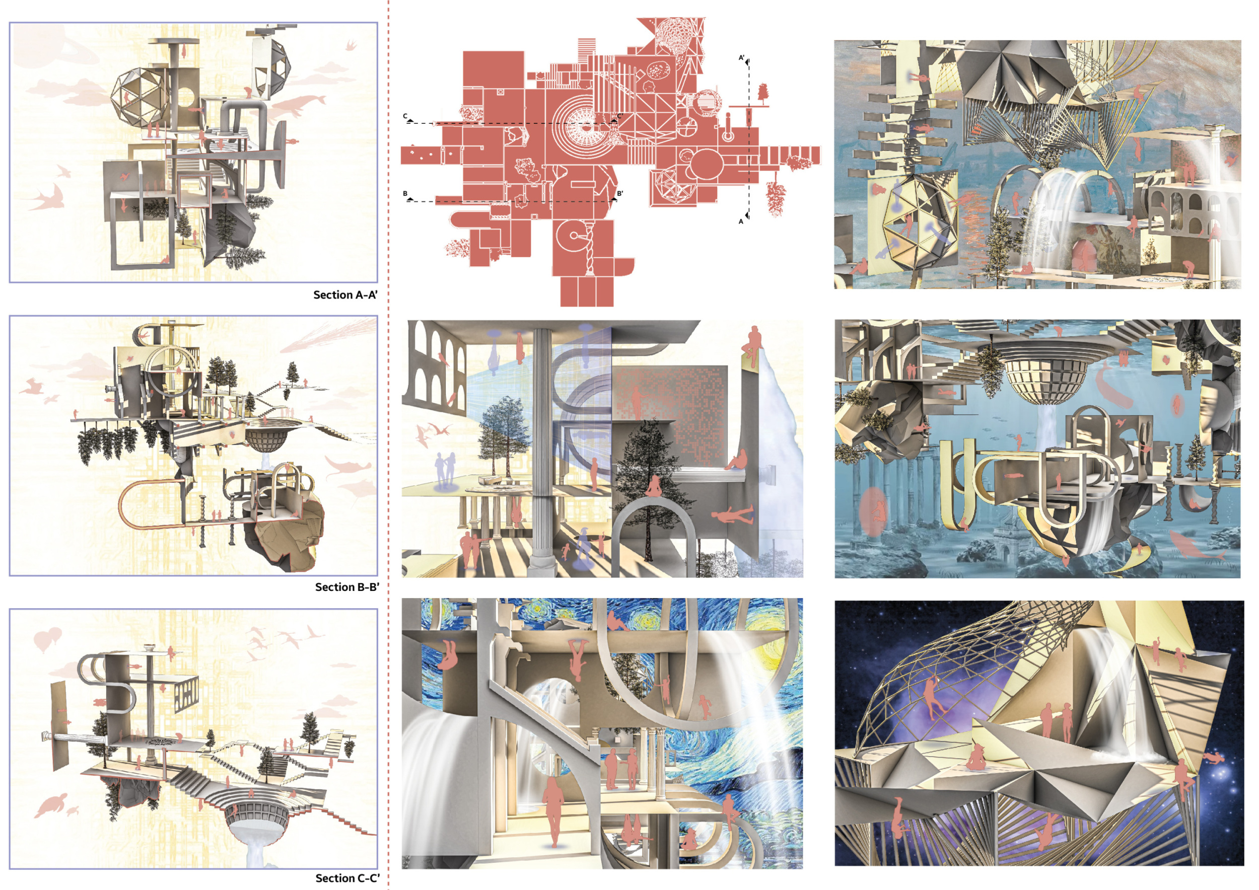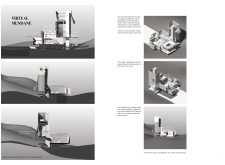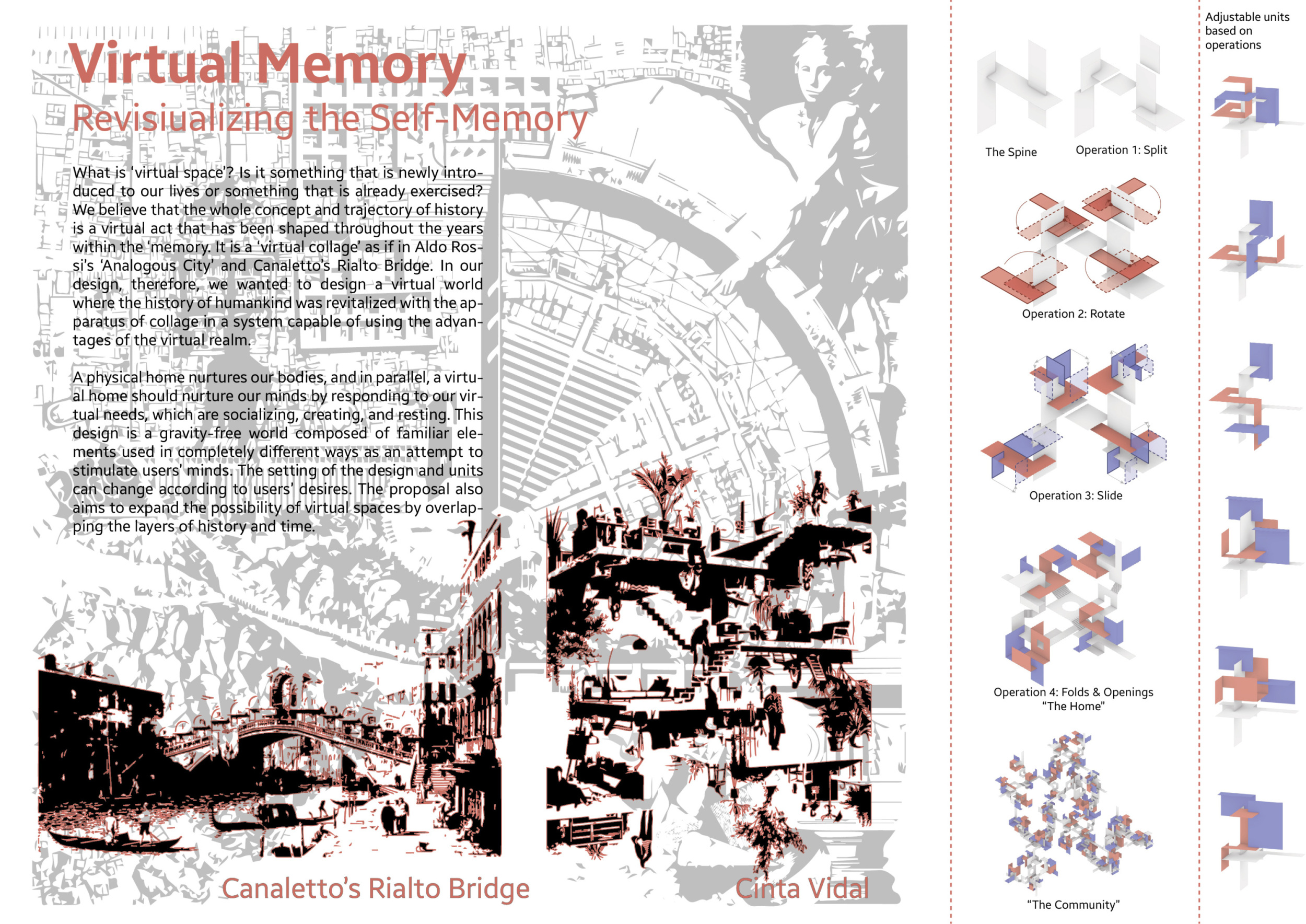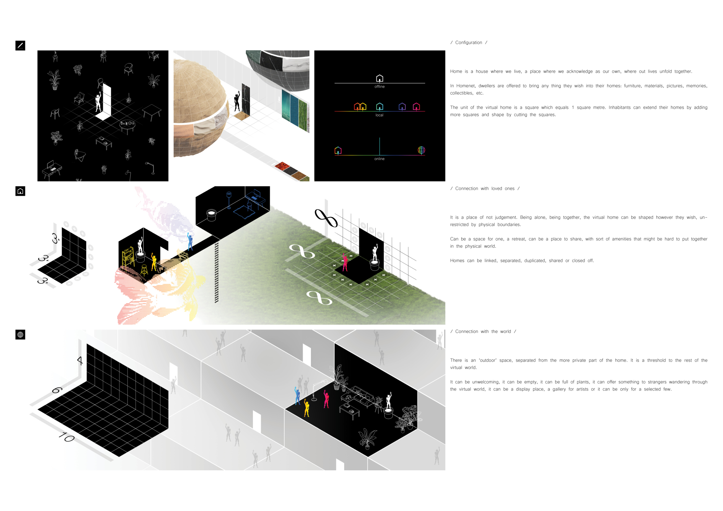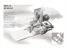 The proposal for Virtual Memory includes the statement: “A physical home nurtures our bodies….a virtual home should nurture our minds by responding to our virtual needs, which are: socializing, creating and resting.” The result is a collage of forms and connections that comprise an amalgamation of typologies and scenes. The jury writes: “The proposal has a Piranesi-esque quality to it, with interesting 3D spaces. Read more The journey around the house would be like playing Monument Valley. Adapting to modular structures by using familiar elements of architecture both keeps the user on a familiar ground and creates unimaginable layouts. It is an intriguing series of spaces reminiscent of Escher's paintings; but instead of skewing mathematical proportions and Cartesian space, the proposal skews time and history as evidenced in formal components. The spaces are constructed with a logical system of juxtapositions rendering absurd and estranged sensa. The madness of stacking and interlocking of those elements somehow echoed with the spirit of the digital space. Meanwhile, the rationale of organizing programs and space still worked well for the prototype presented.”
