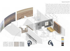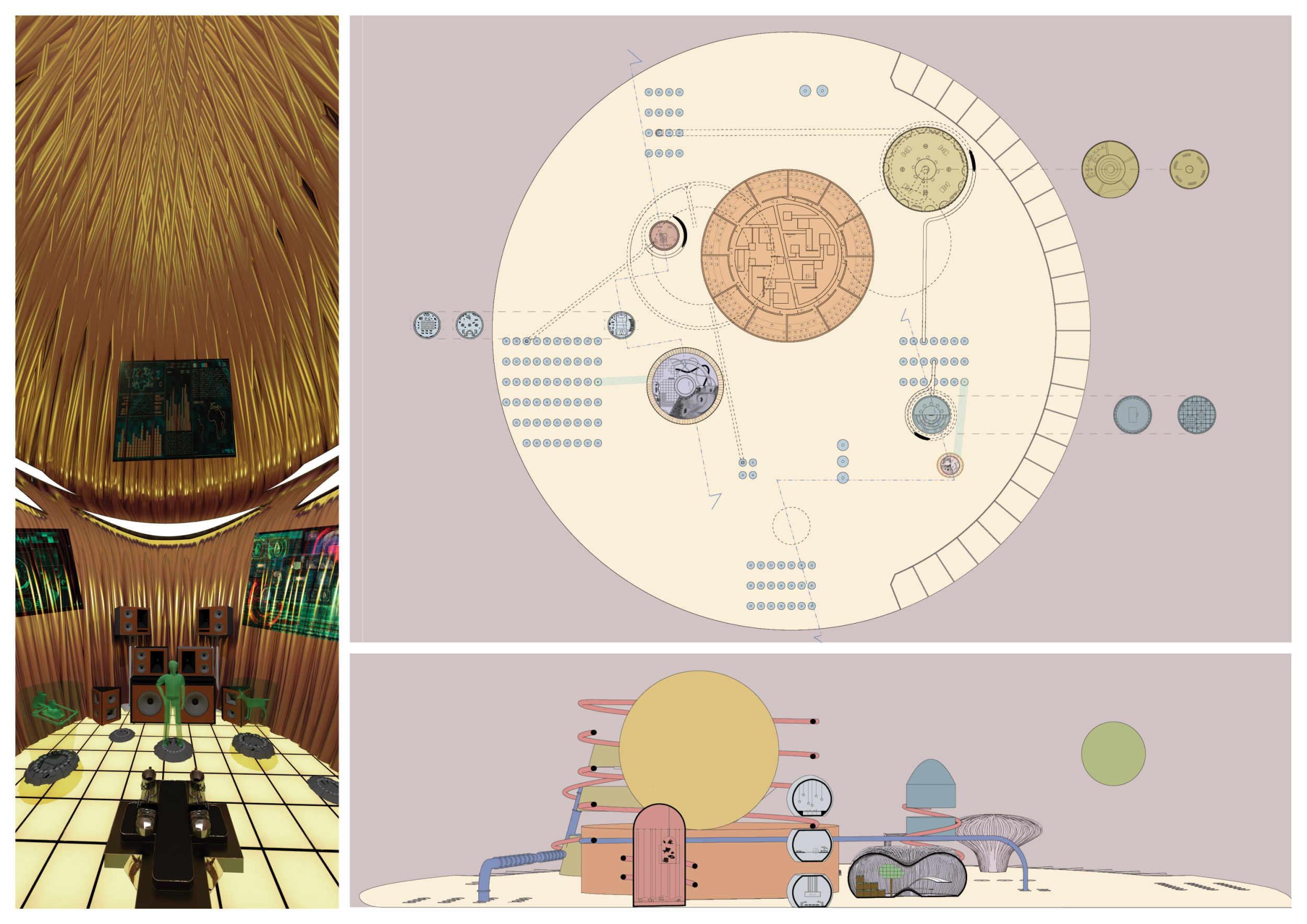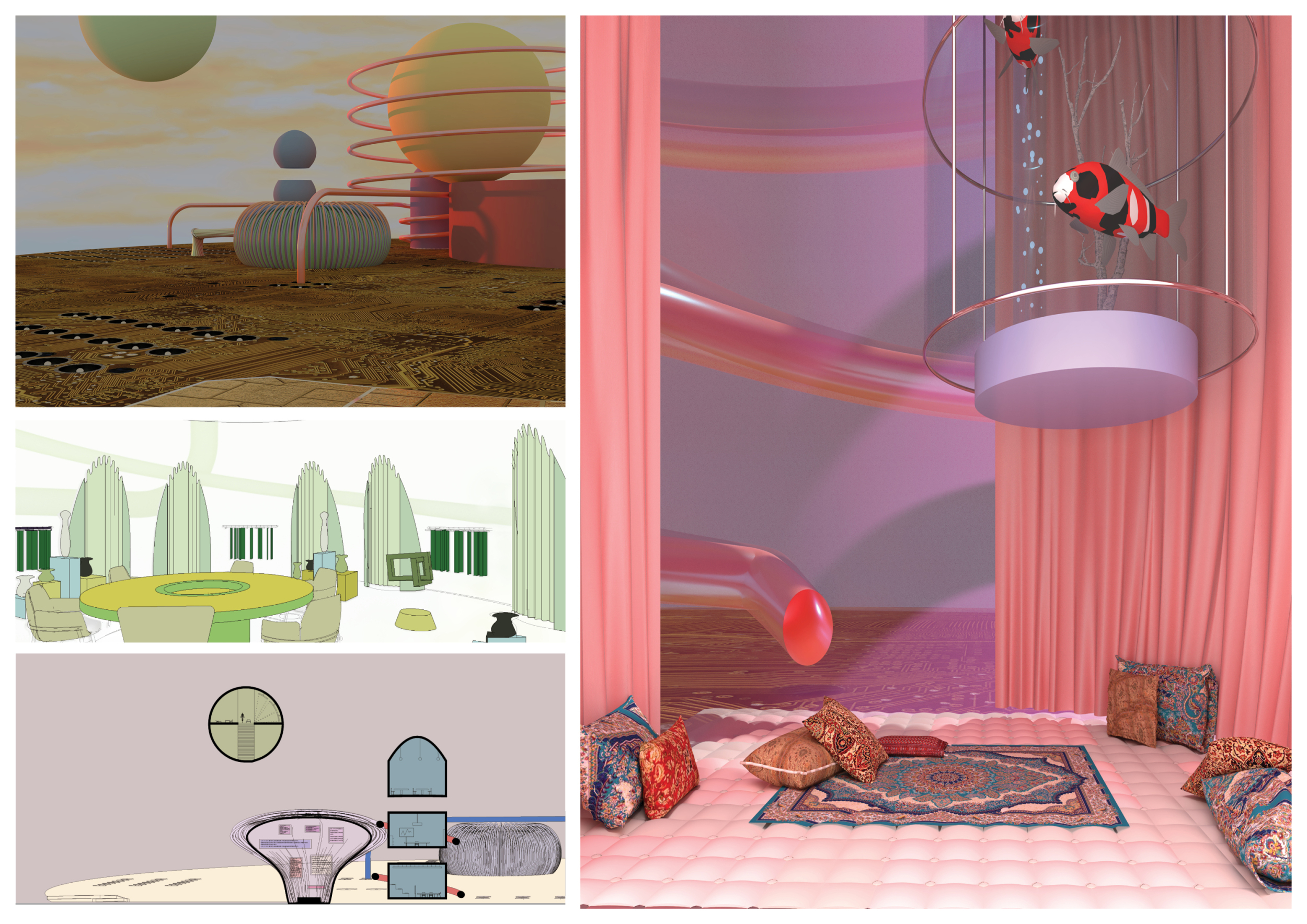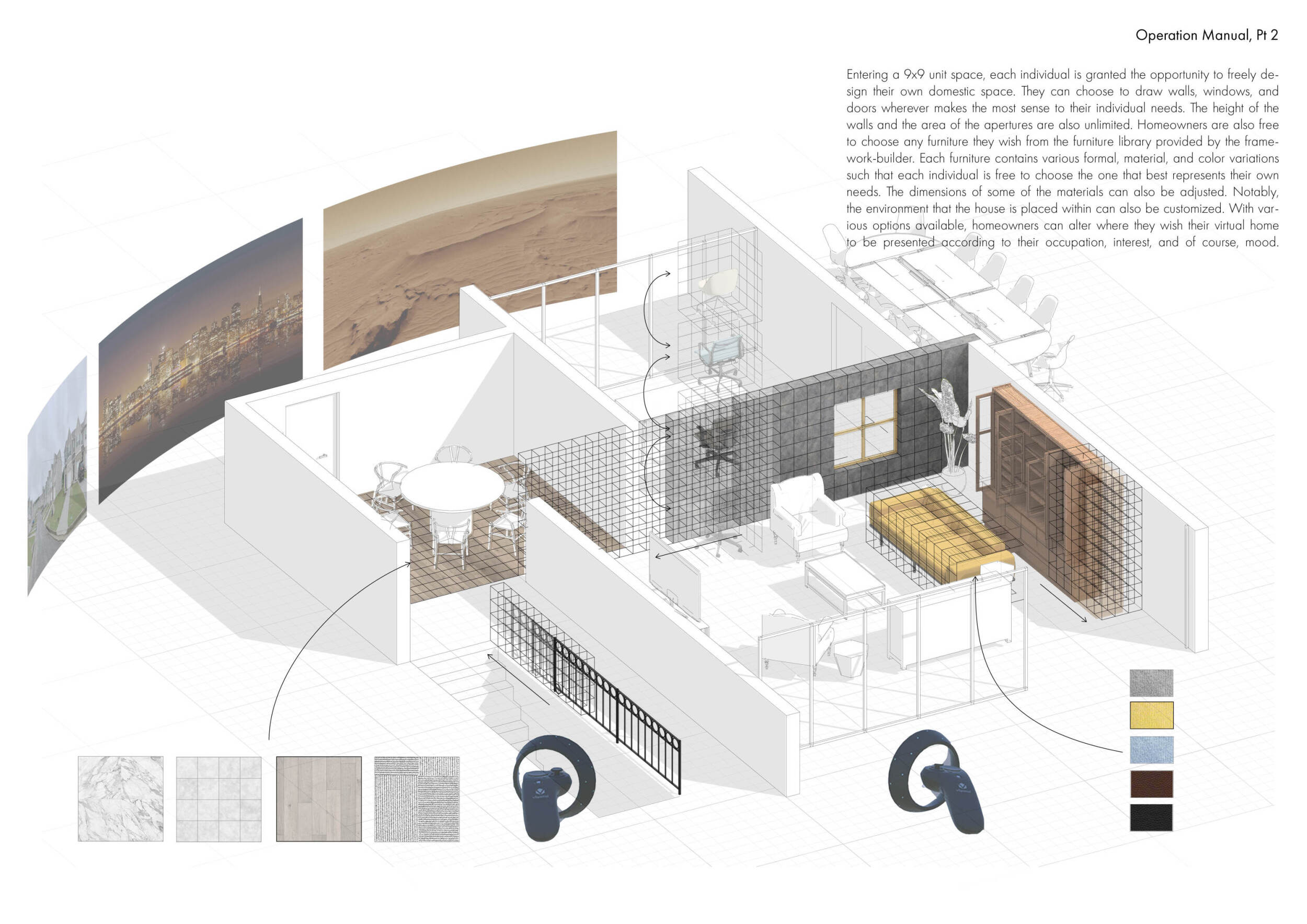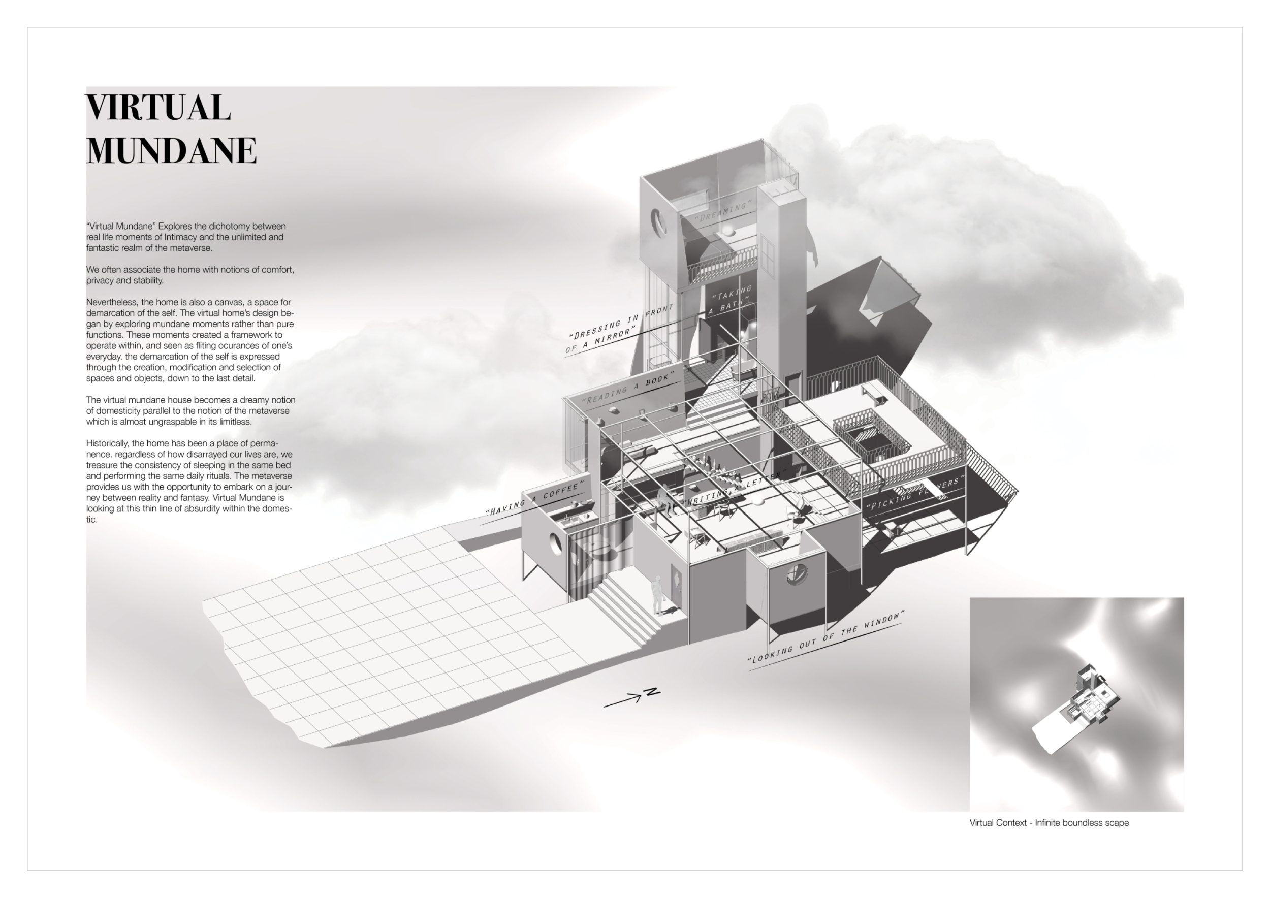 The proposal for Virtual Memory includes the statement: “A physical home nurtures our bodies….a virtual home should nurture our minds by responding to our virtual needs, which are: socializing, creating and resting.” The result is a collage of forms and connections that comprise an amalgamation of typologies and scenes. The jury writes: “The proposal has a Piranesi-esque quality to it, with interesting 3D spaces. Read more The journey around the house would be like playing Monument Valley. Adapting to modular structures by using familiar elements of architecture both keeps the user on a familiar ground and creates unimaginable layouts. It is an intriguing series of spaces reminiscent of Escher's paintings; but instead of skewing mathematical proportions and Cartesian space, the proposal skews time and history as evidenced in formal components. The spaces are constructed with a logical system of juxtapositions rendering absurd and estranged sensa. The madness of stacking and interlocking of those elements somehow echoed with the spirit of the digital space. Meanwhile, the rationale of organizing programs and space still worked well for the prototype presented.”
