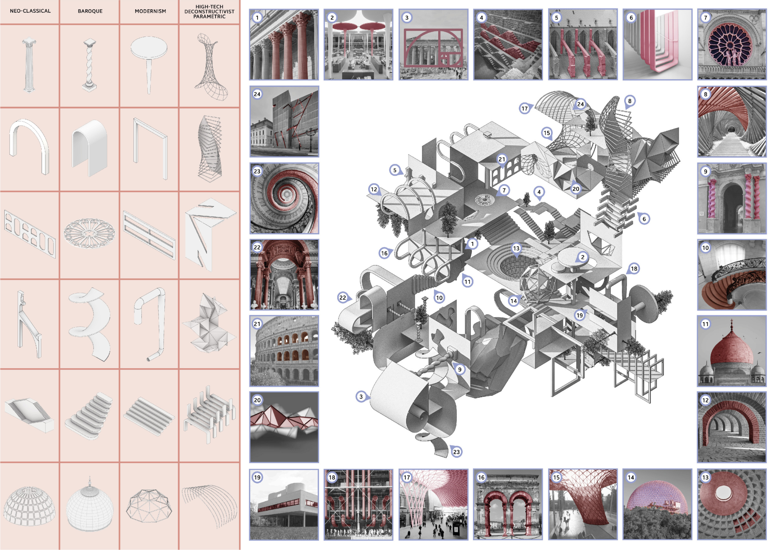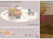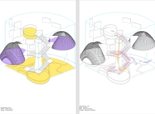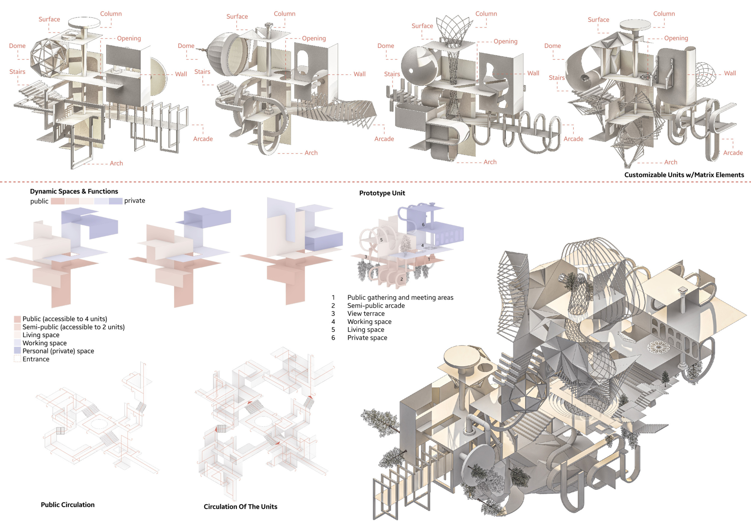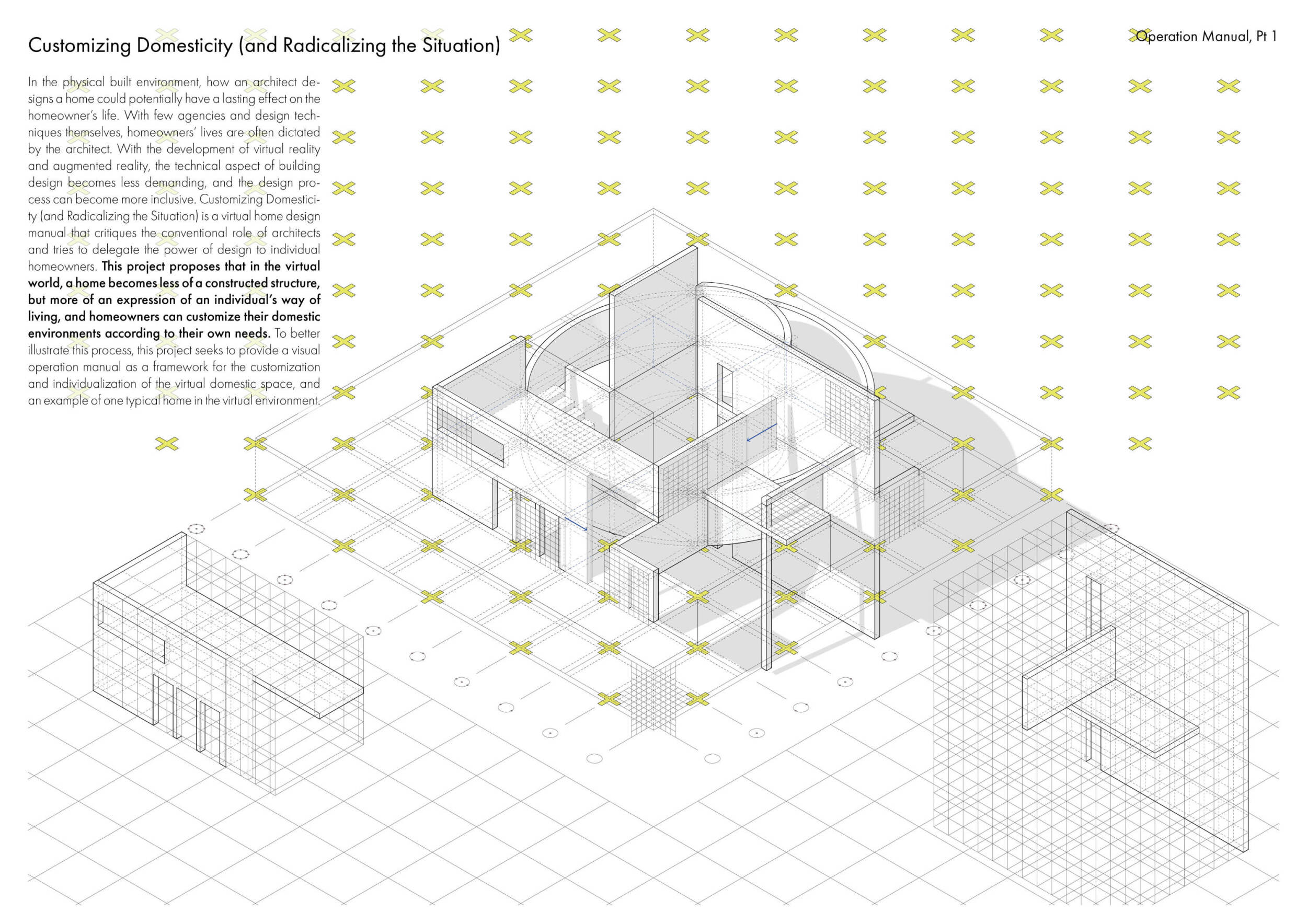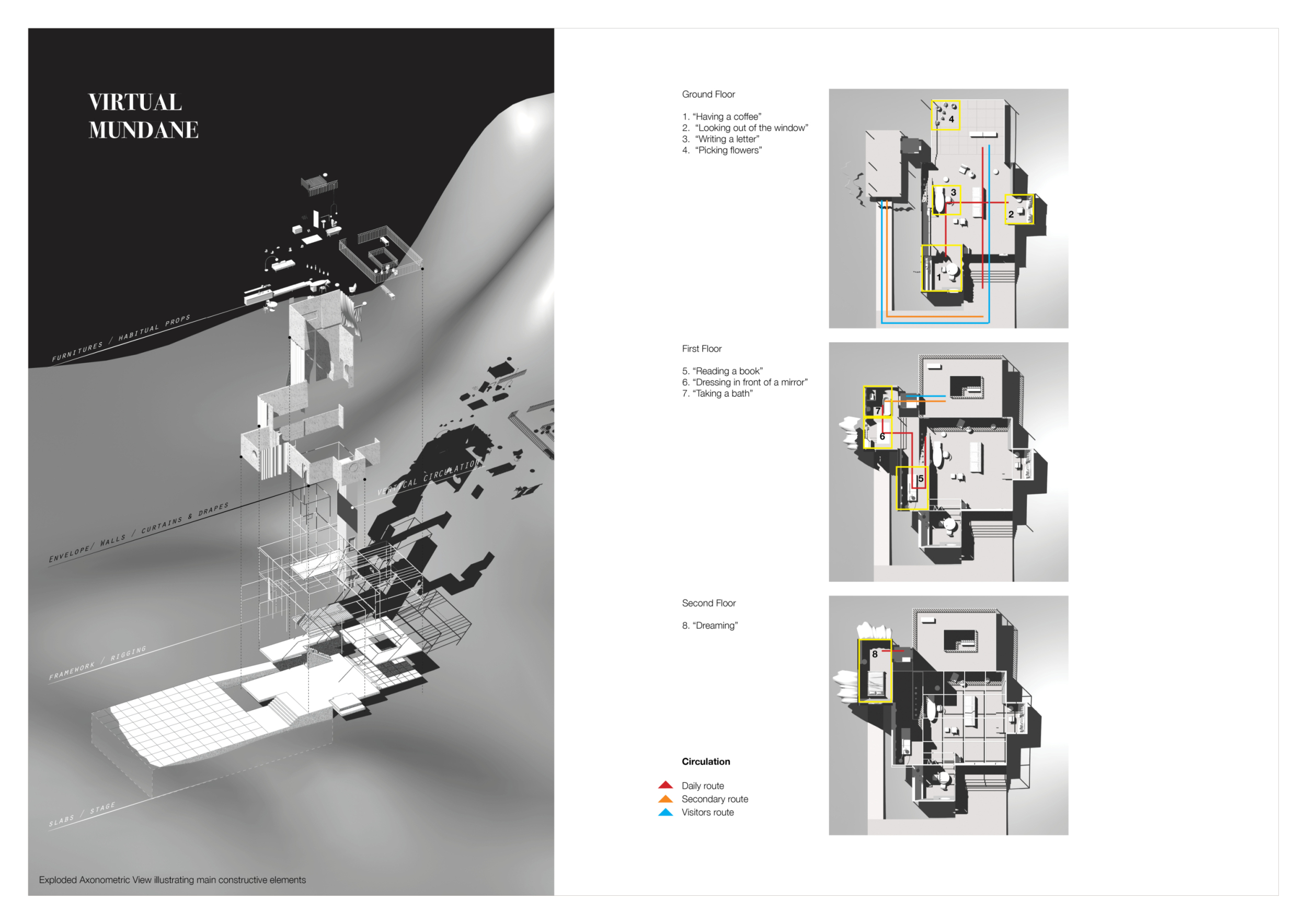 The proposal for Virtual Memory includes the statement: “A physical home nurtures our bodies….a virtual home should nurture our minds by responding to our virtual needs, which are: socializing, creating and resting.” The result is a collage of forms and connections that comprise an amalgamation of typologies and scenes. The jury writes: “The proposal has a Piranesi-esque quality to it, with interesting 3D spaces. Read more The journey around the house would be like playing Monument Valley. Adapting to modular structures by using familiar elements of architecture both keeps the user on a familiar ground and creates unimaginable layouts. It is an intriguing series of spaces reminiscent of Escher's paintings; but instead of skewing mathematical proportions and Cartesian space, the proposal skews time and history as evidenced in formal components. The spaces are constructed with a logical system of juxtapositions rendering absurd and estranged sensa. The madness of stacking and interlocking of those elements somehow echoed with the spirit of the digital space. Meanwhile, the rationale of organizing programs and space still worked well for the prototype presented.”