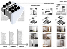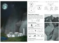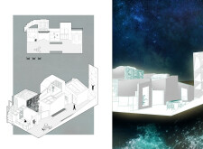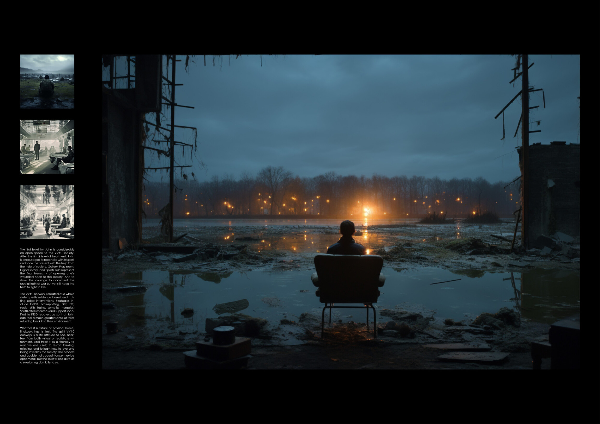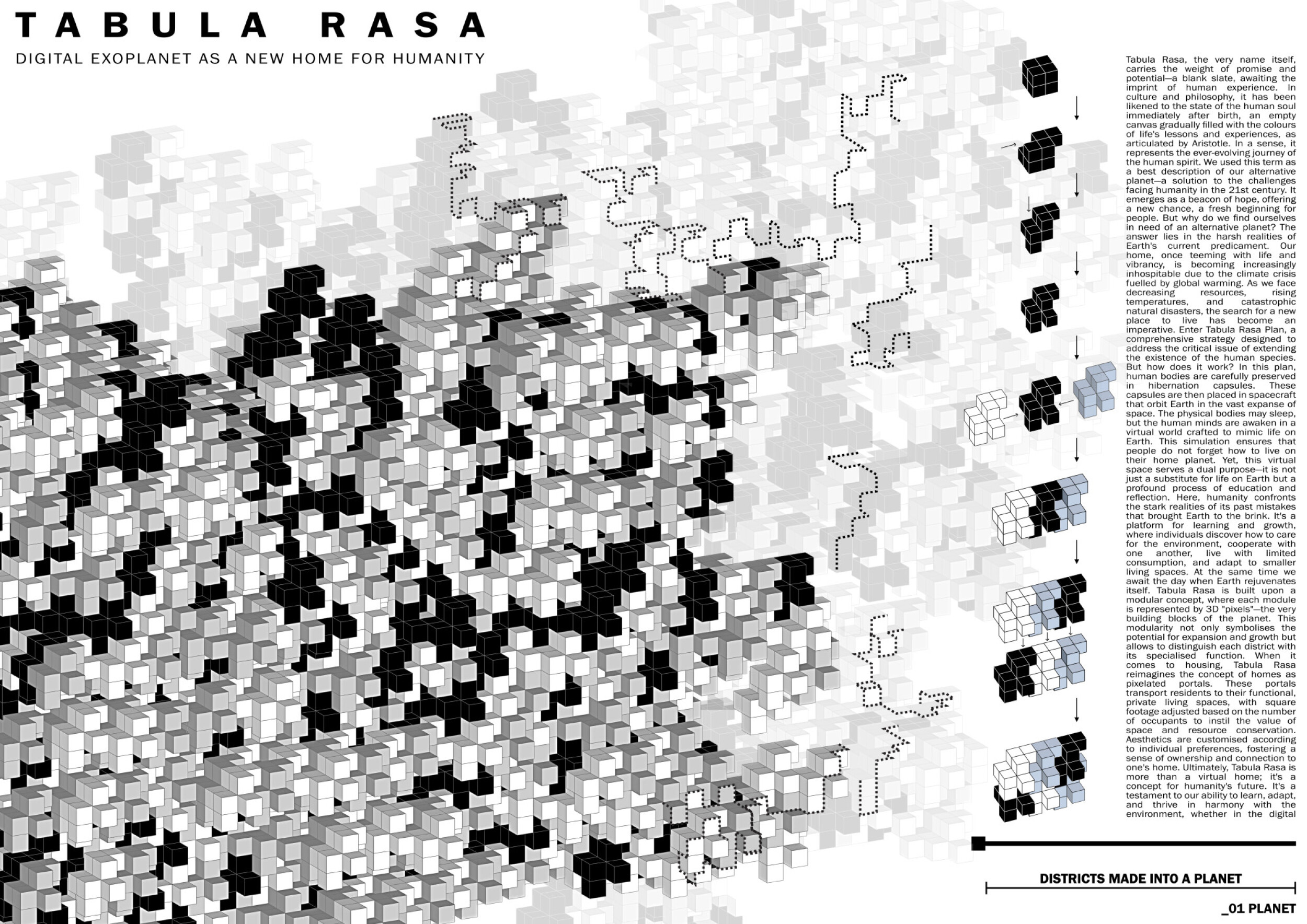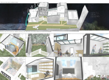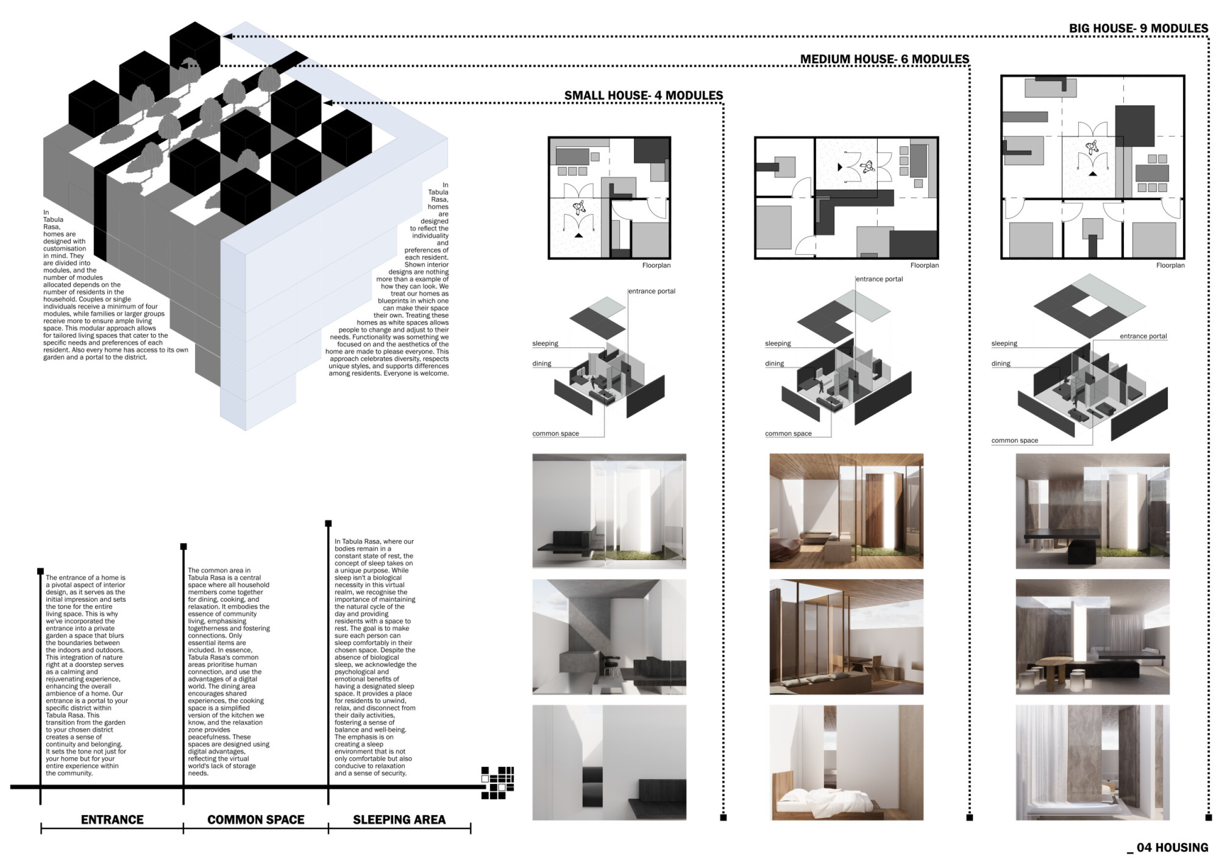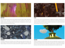 While the project is conceptually strong and offers a wide range of well-developed renderings, it would greatly benefit from more consistent layout and information conveyed across the four sheets. The varied layouts make it challenging for a viewer to simply navigate. The sheets are also overwhelmingly dark in color. Rather than blackness the author might explore the positive effects of lighter colors and daylight. The texts would benefit from reduced length and larger font sizes.