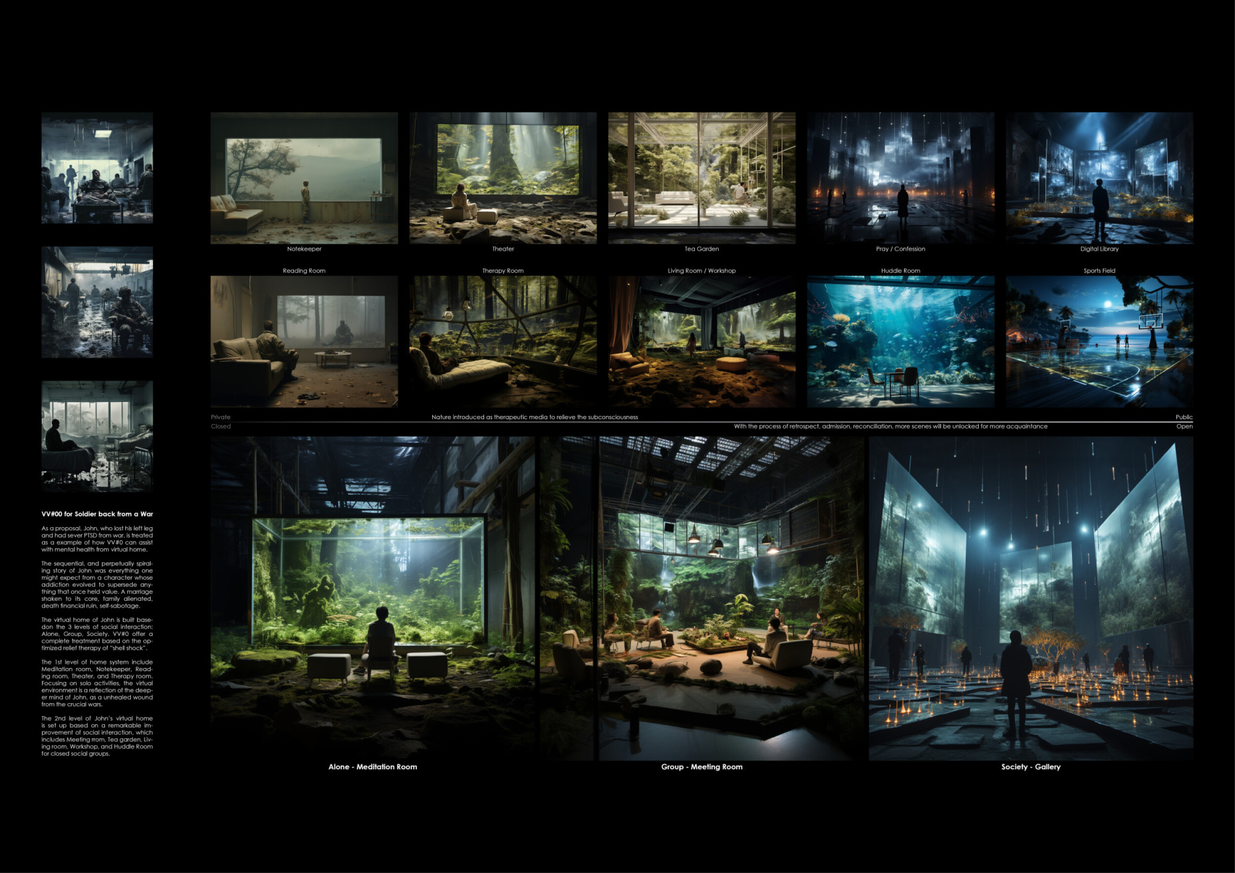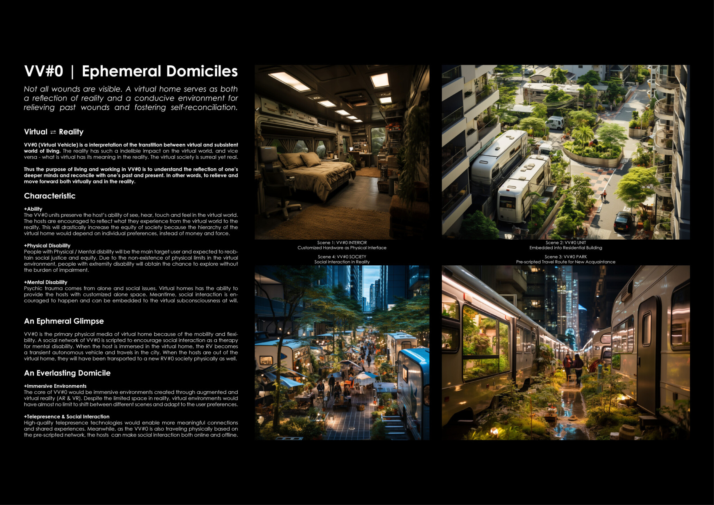 Ephemeral Domiciles posits: “Not all wounds are visible. A virtual home serves as both a reflection of reality and a conducive environment for relieving past wounds and fostering self-reconciliation.” It is targeted to be used in particular by individuals with physical and mental disabilities, allowing them to experience the world without physical constraints.