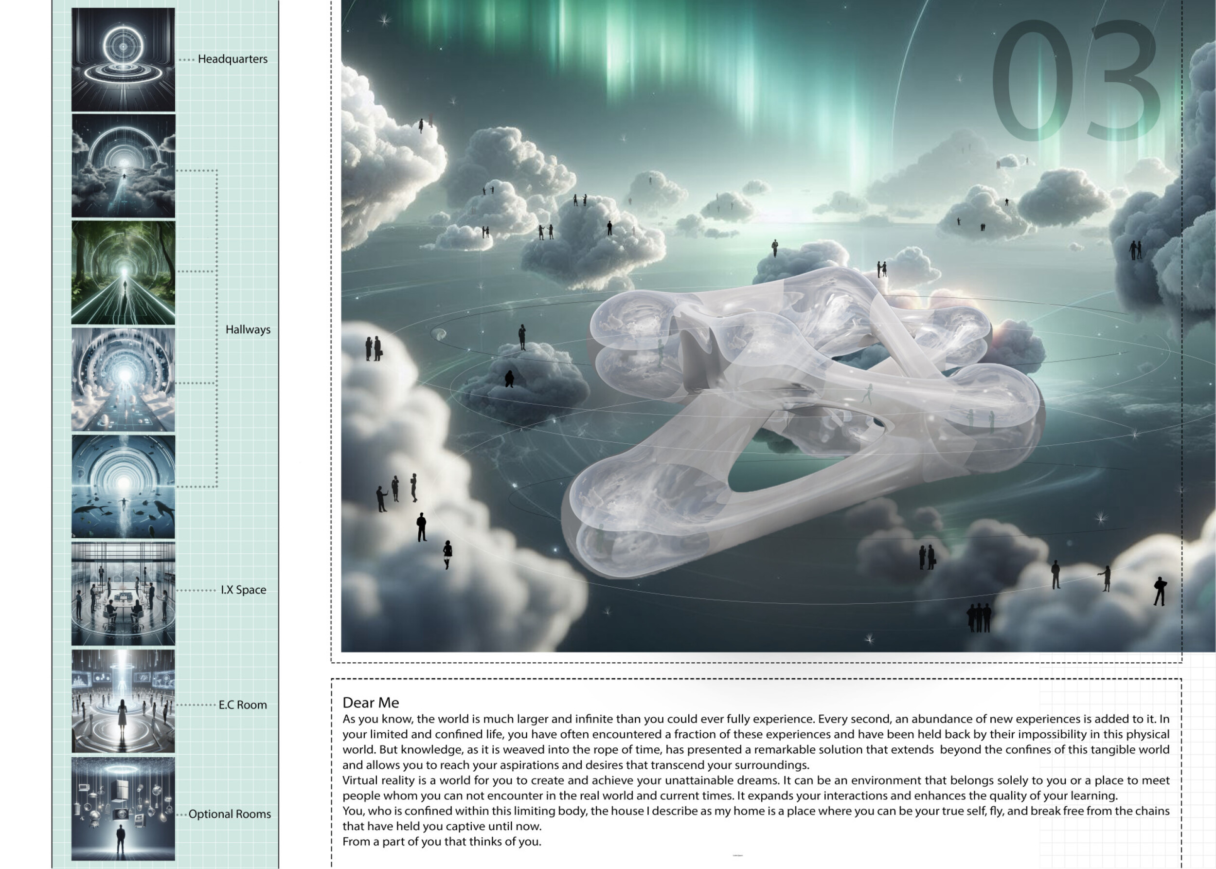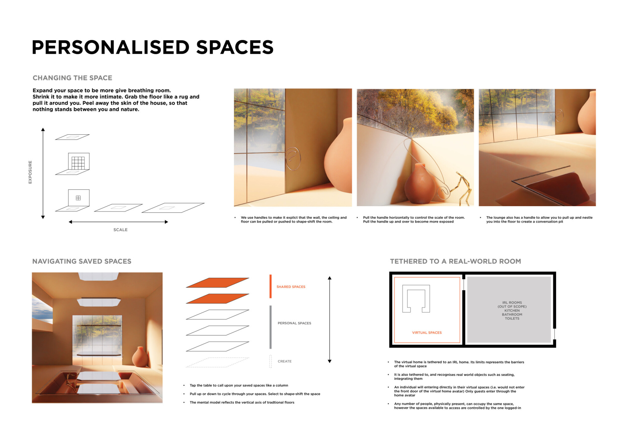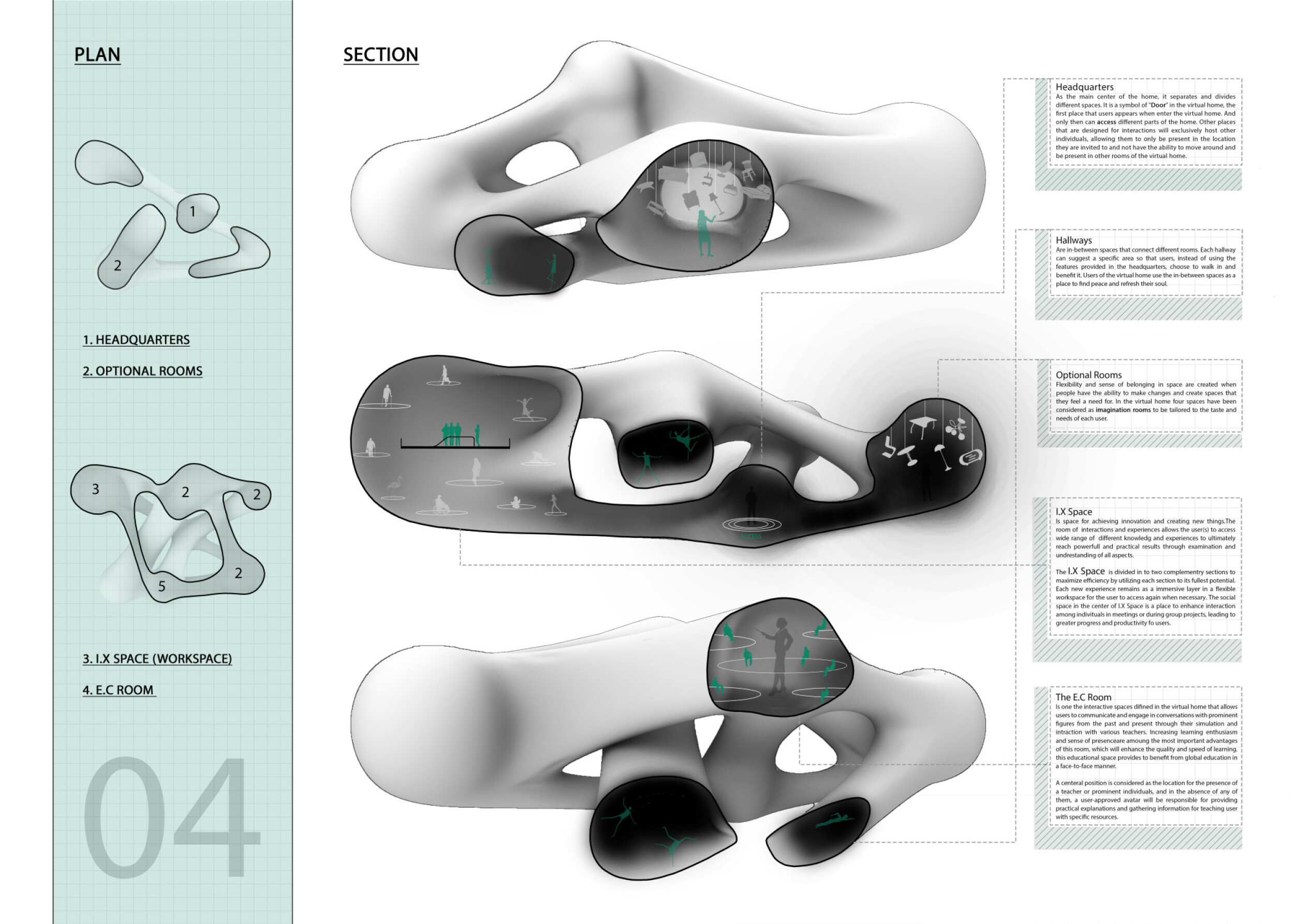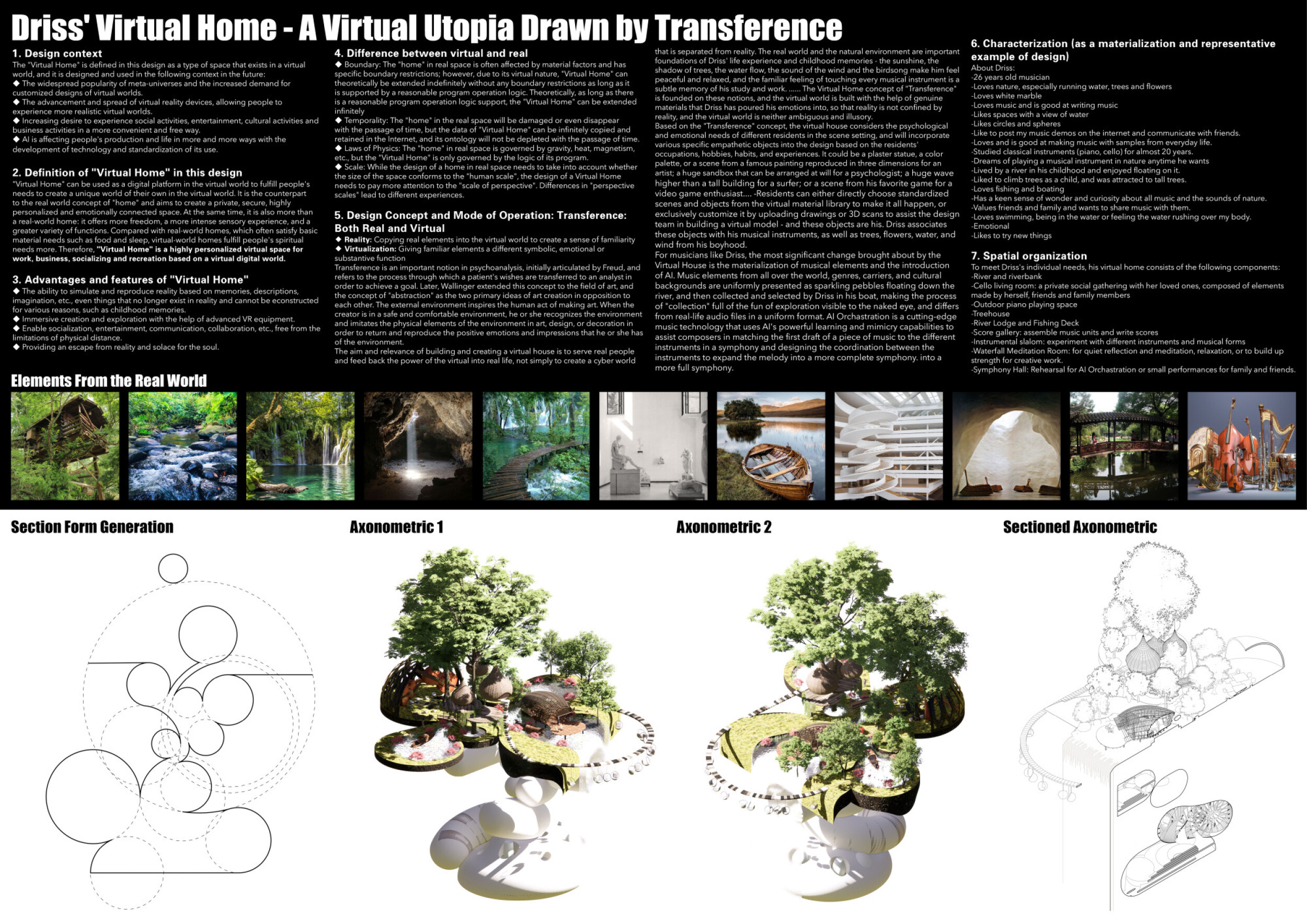 Driss' Virtual Home - A Virtual Utopia Drawn by Transference: the VR-augmented home offers a customized virtual space that is private and secure where one might come to connect emotionally through memory and sensory experience. It is a highly personalized home that one can also use for virtual work, business, socializing and recreation free from physical constraints.