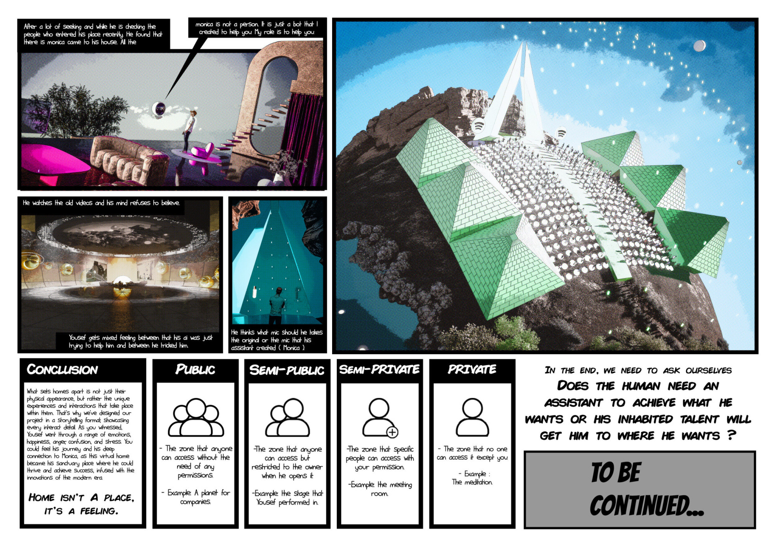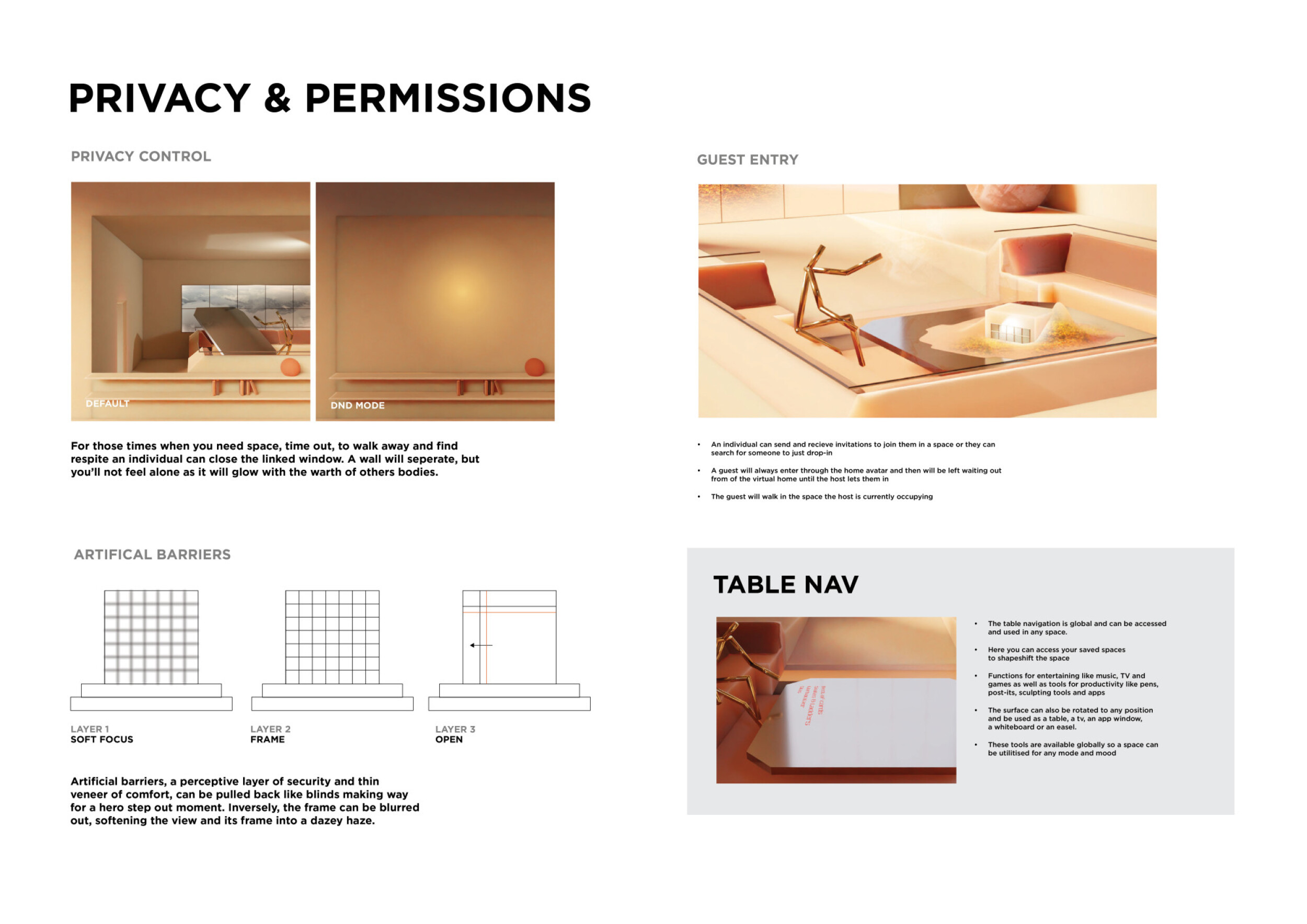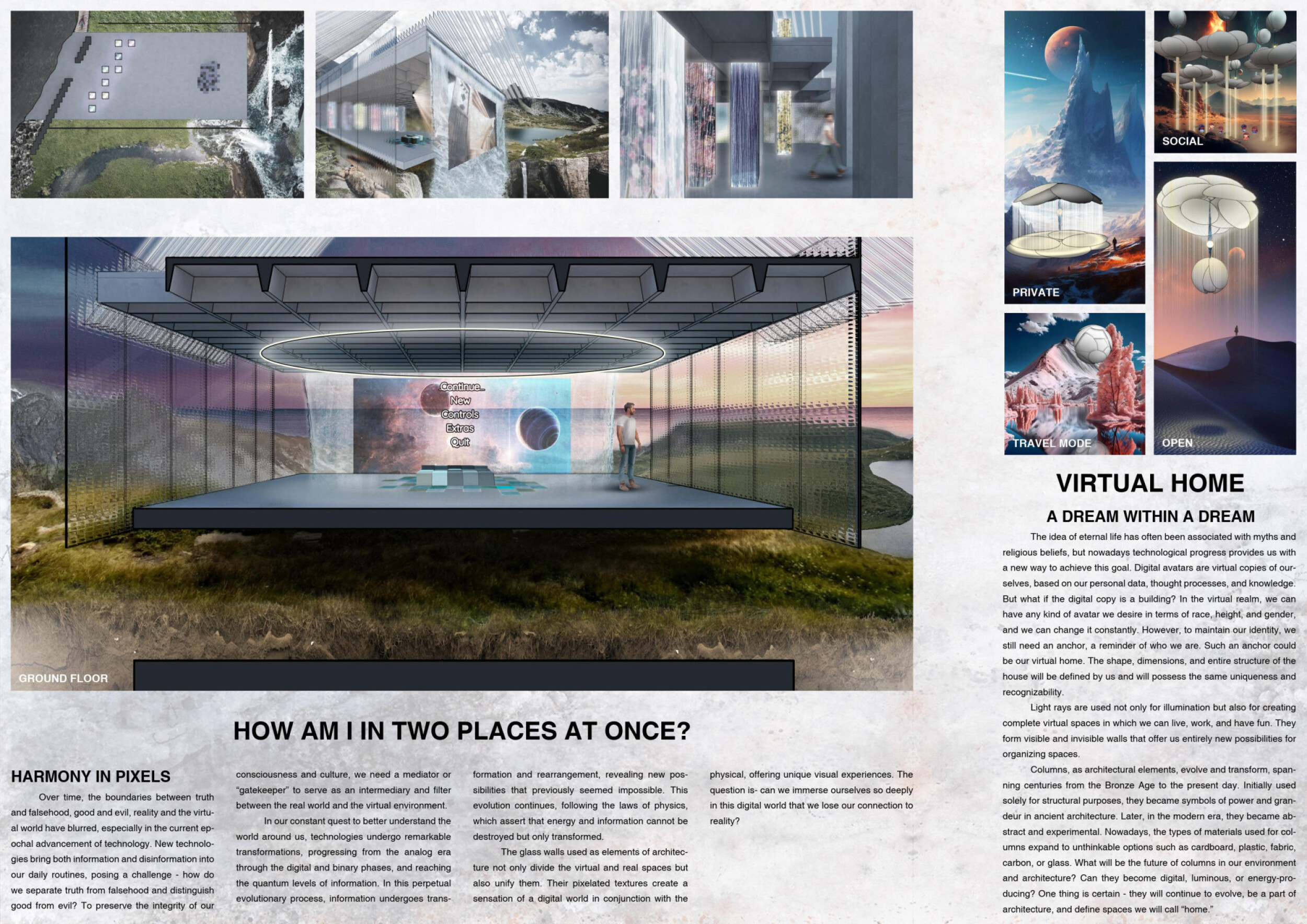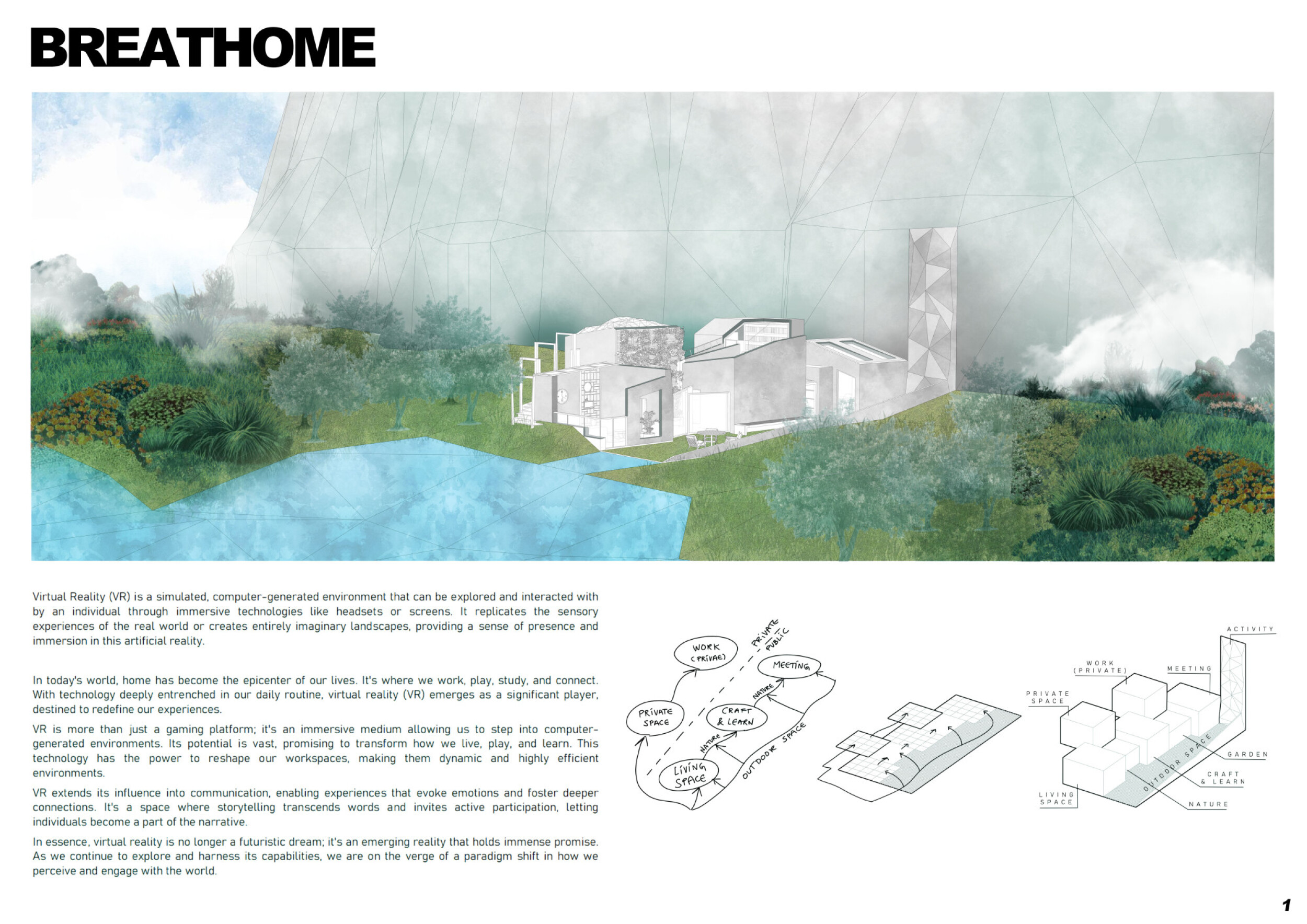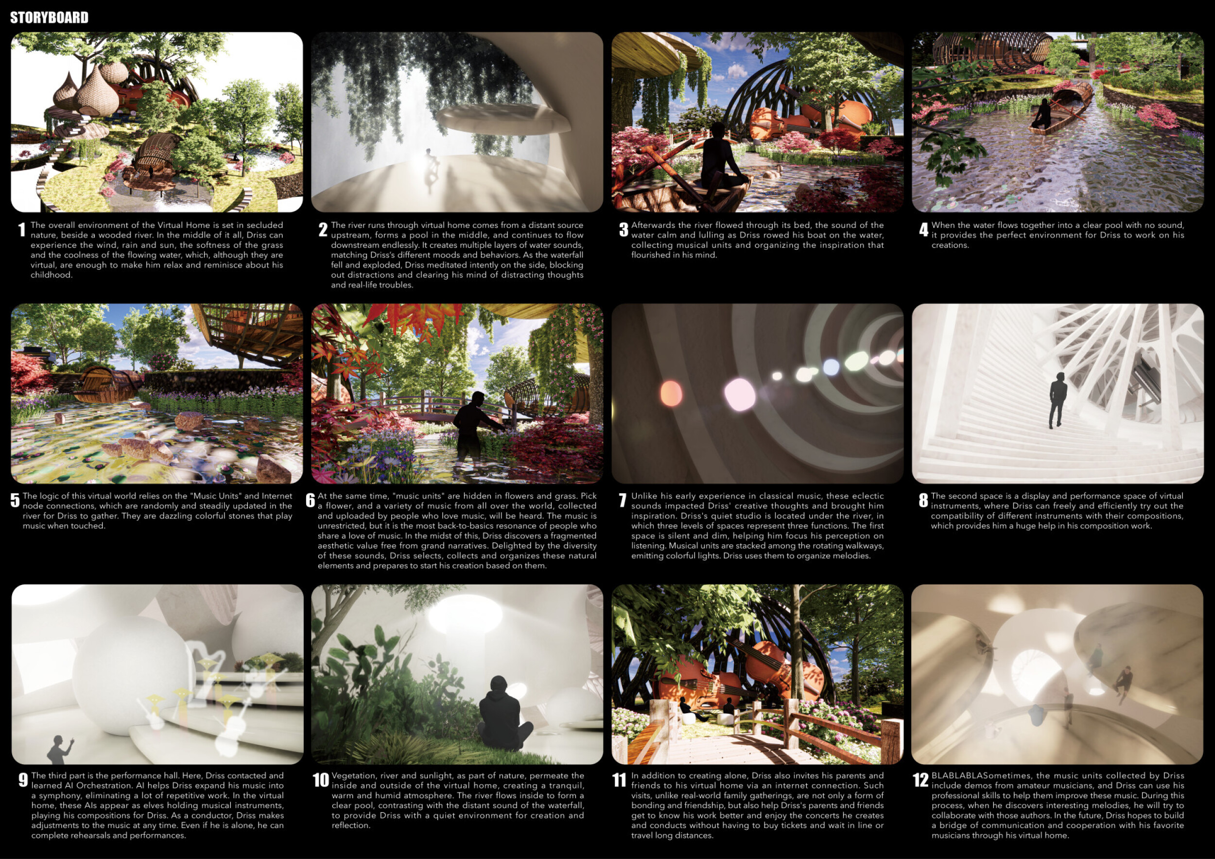 Driss' Virtual Home - A Virtual Utopia Drawn by Transference: the VR-augmented home offers a customized virtual space that is private and secure where one might come to connect emotionally through memory and sensory experience. It is a highly personalized home that one can also use for virtual work, business, socializing and recreation free from physical constraints.