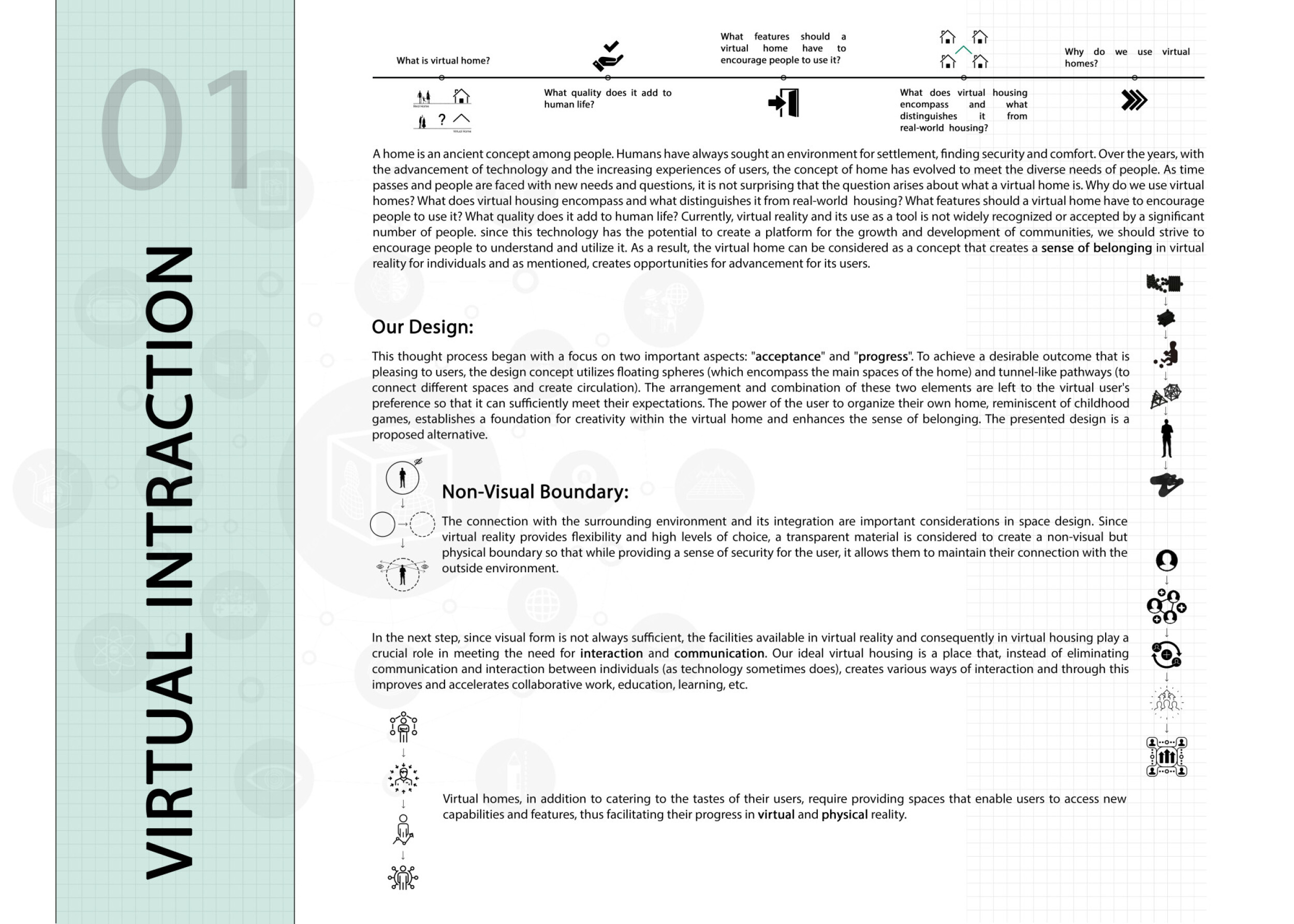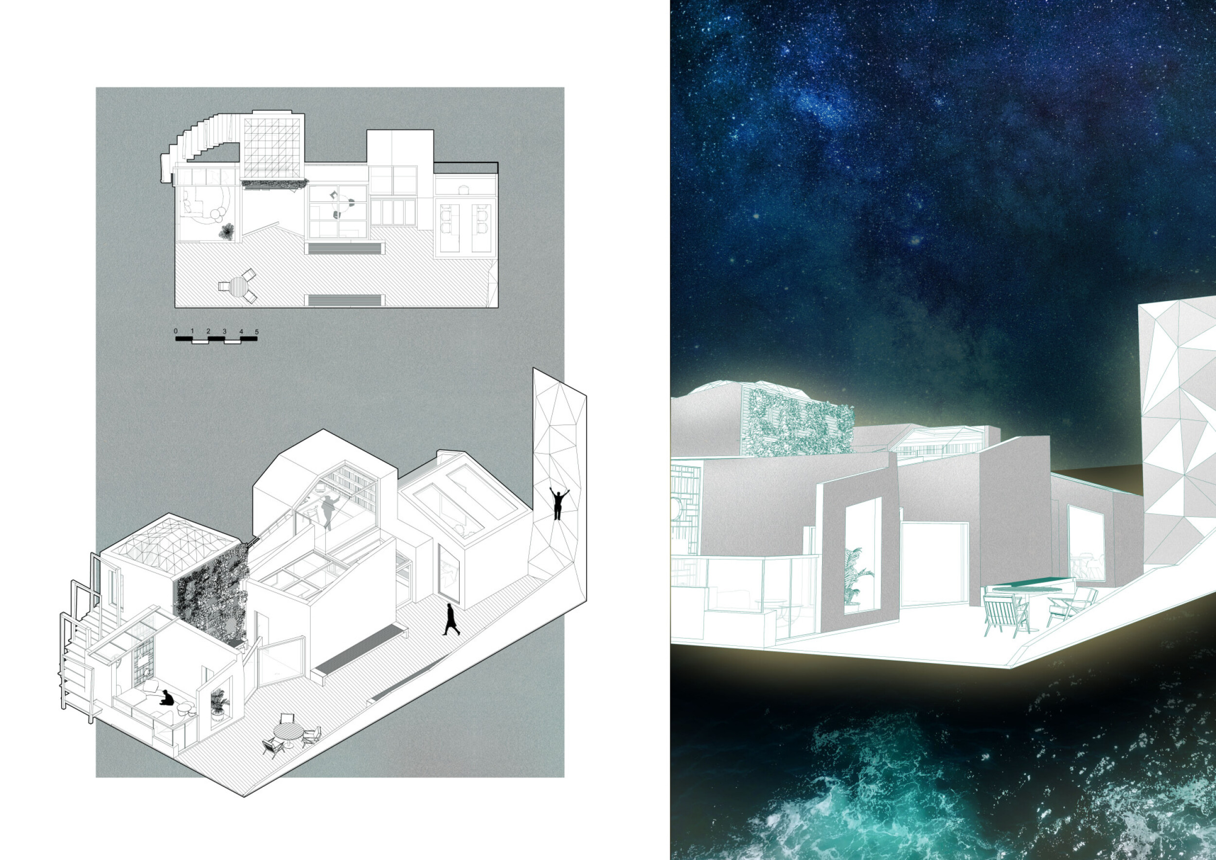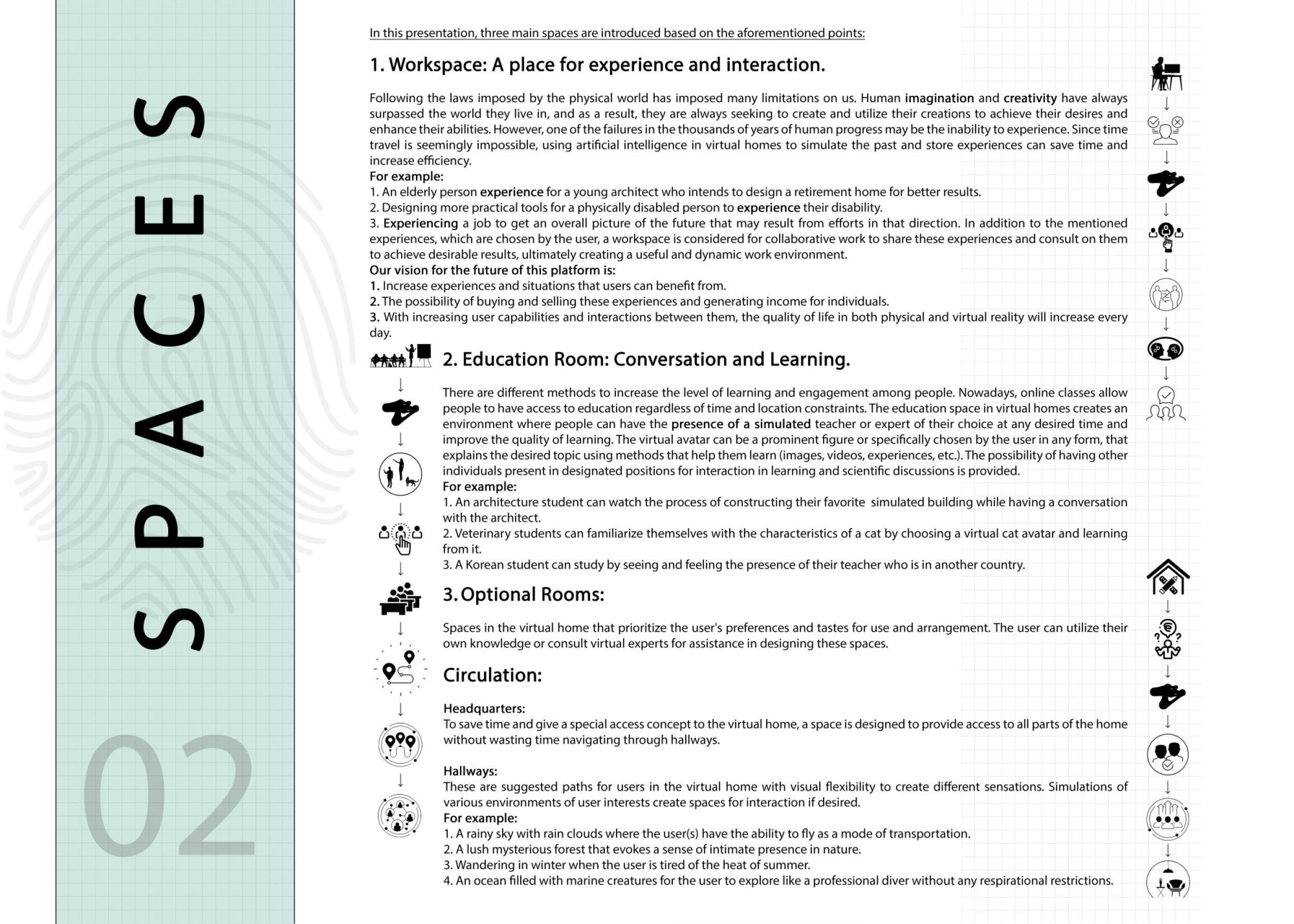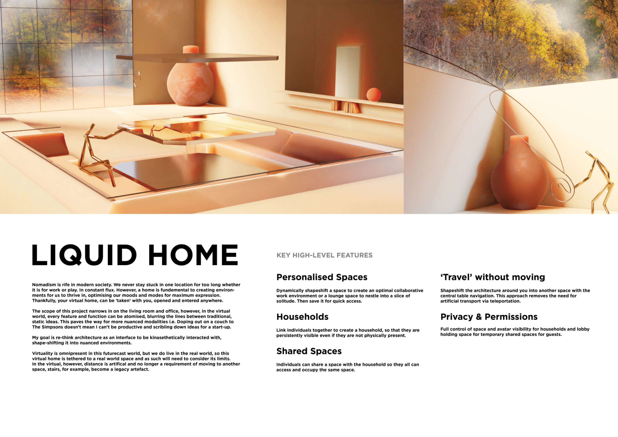 Driss' Virtual Home - A Virtual Utopia Drawn by Transference: the VR-augmented home offers a customized virtual space that is private and secure where one might come to connect emotionally through memory and sensory experience. It is a highly personalized home that one can also use for virtual work, business, socializing and recreation free from physical constraints.