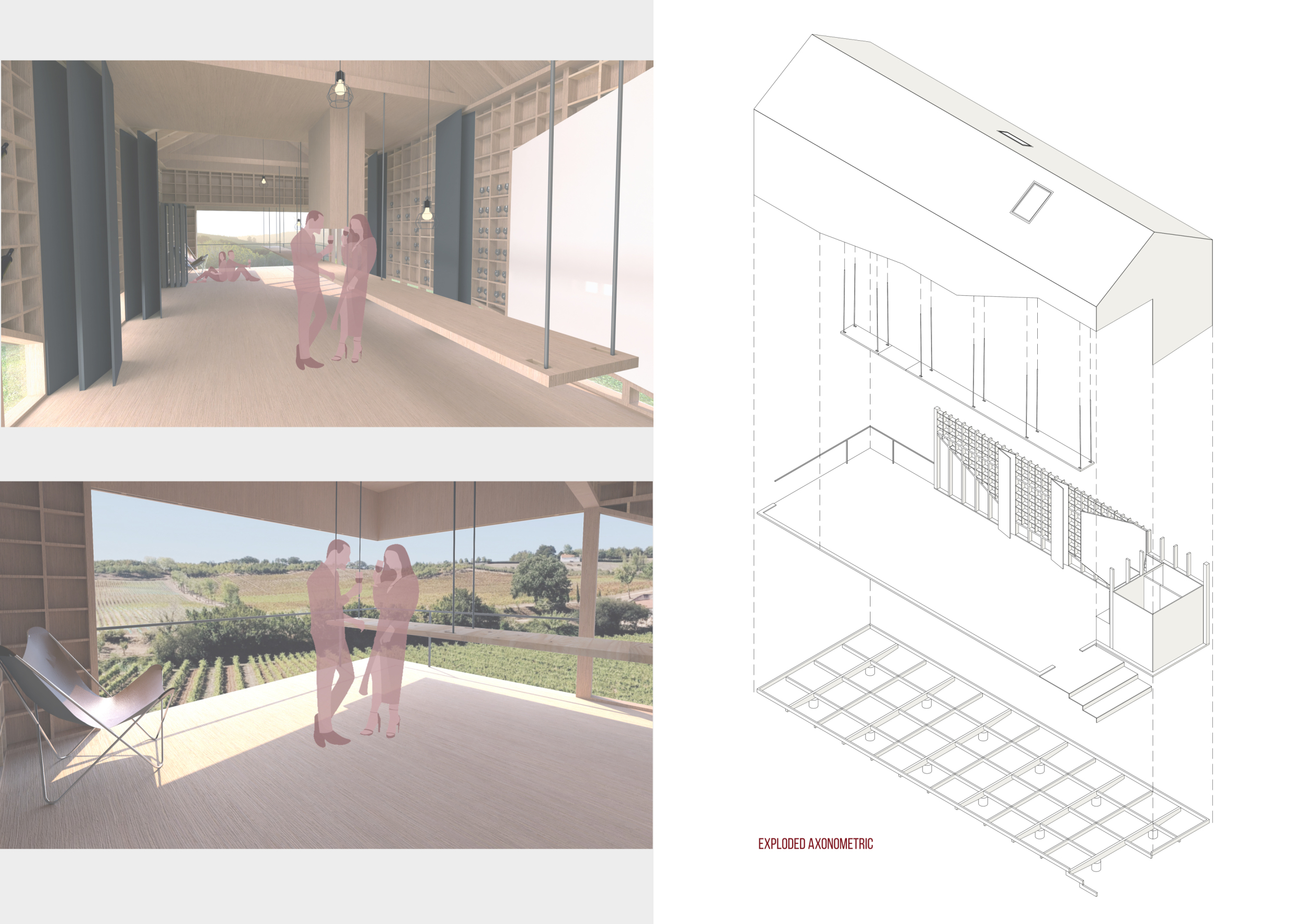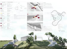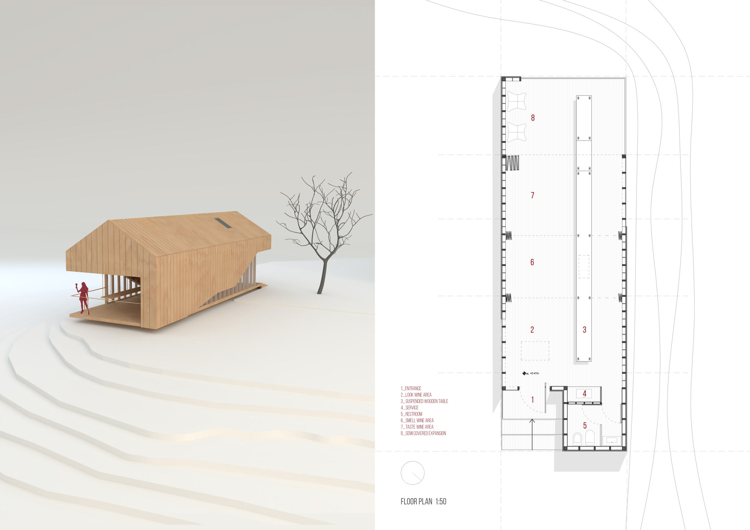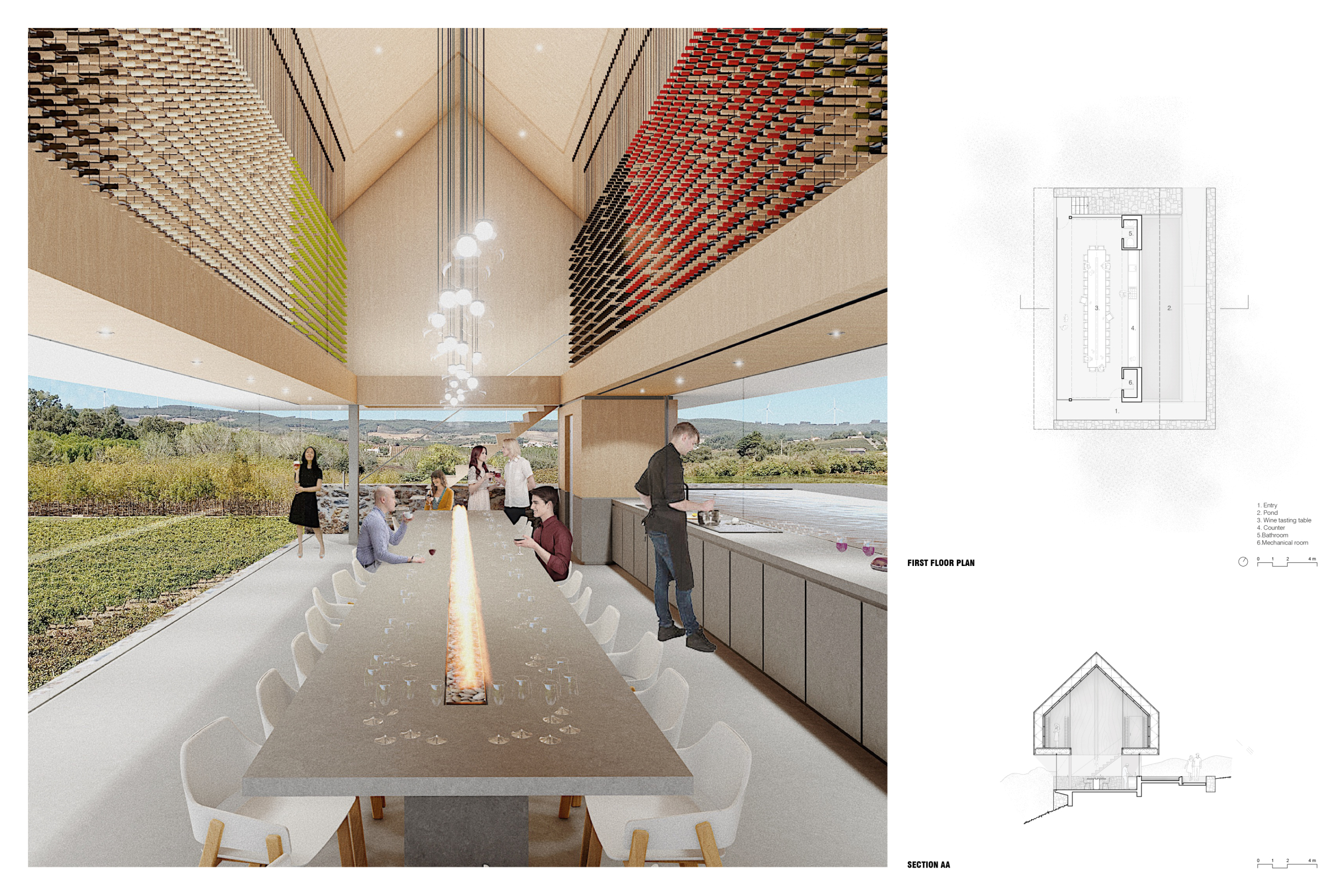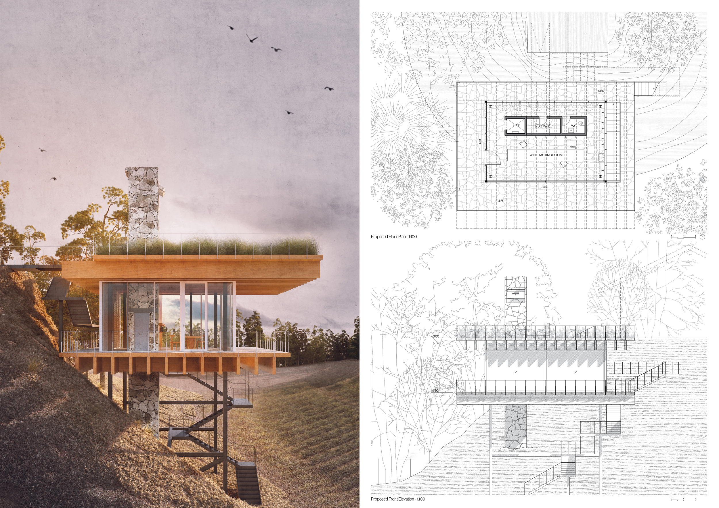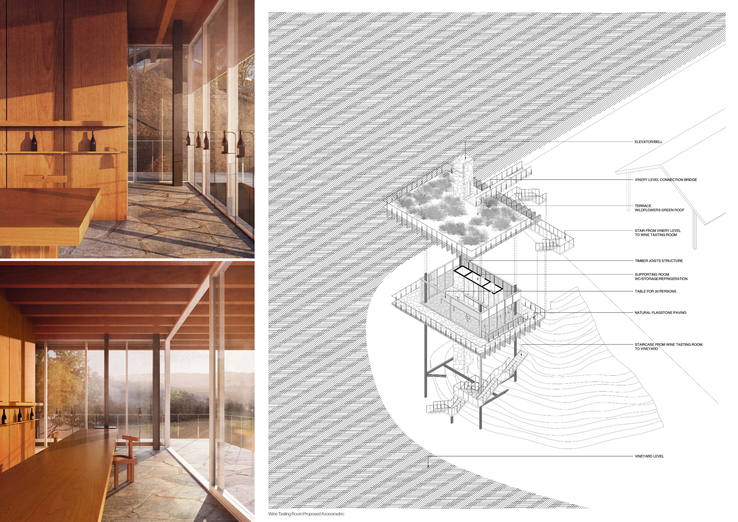 This bold proposal elevates a pitched-roof enclosure containing a ‘hanging wine cellar’ that floats above a wine tasting area semi-embedded into the hillside within a solid stone foundation. The two simple forms are divided horizontally by a glass shell that is set eye-level with the site, and a flat pond of water which visually enhances this effect of separation and levitation.