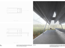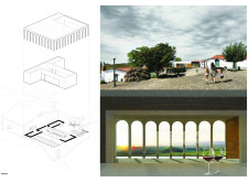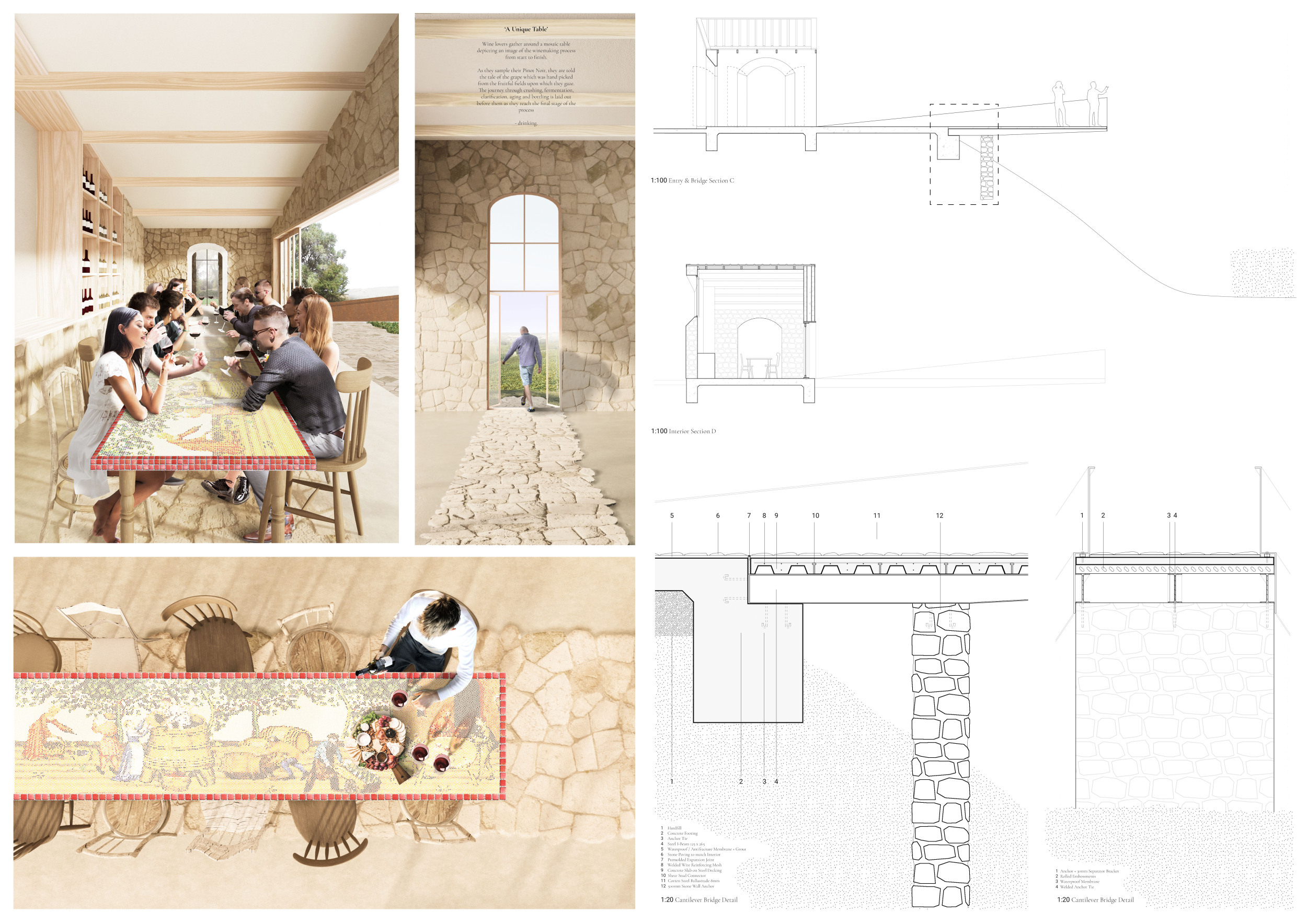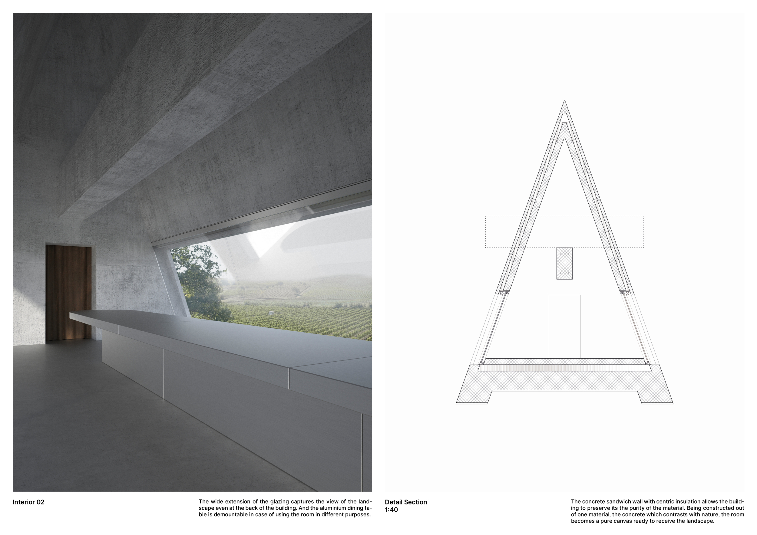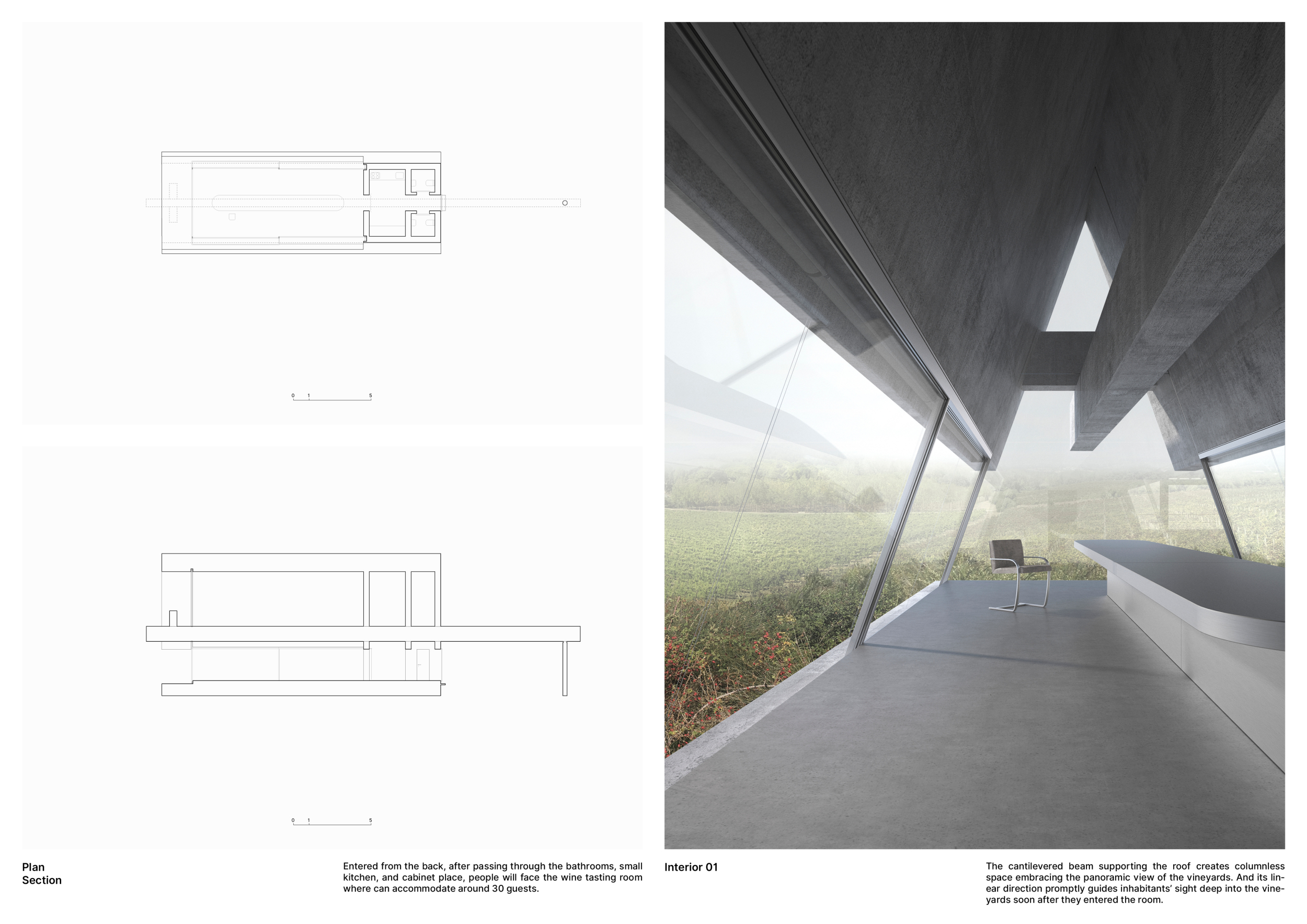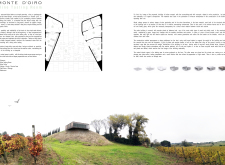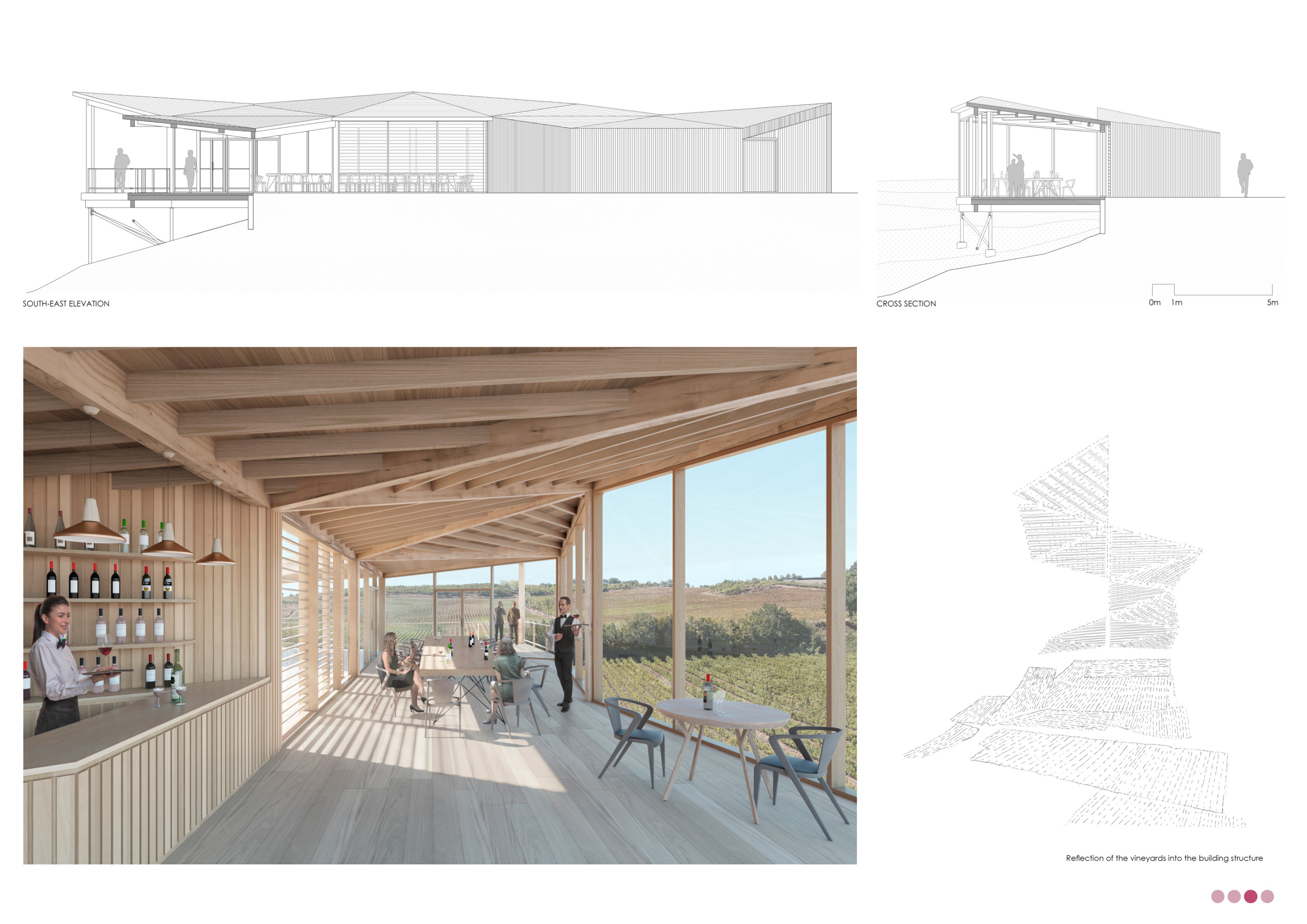 This bold proposal elevates a pitched-roof enclosure containing a ‘hanging wine cellar’ that floats above a wine tasting area semi-embedded into the hillside within a solid stone foundation. The two simple forms are divided horizontally by a glass shell that is set eye-level with the site, and a flat pond of water which visually enhances this effect of separation and levitation.