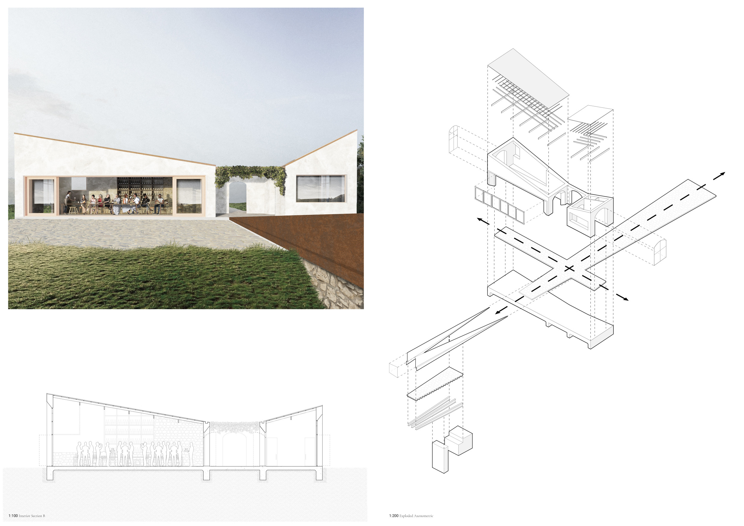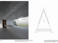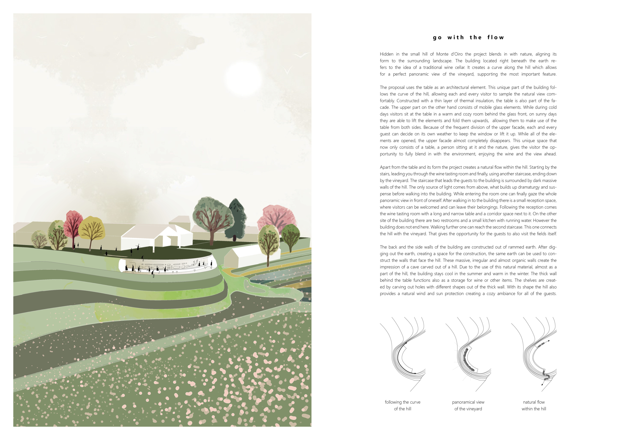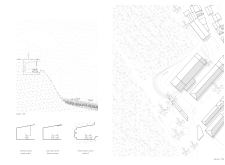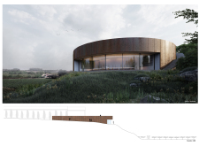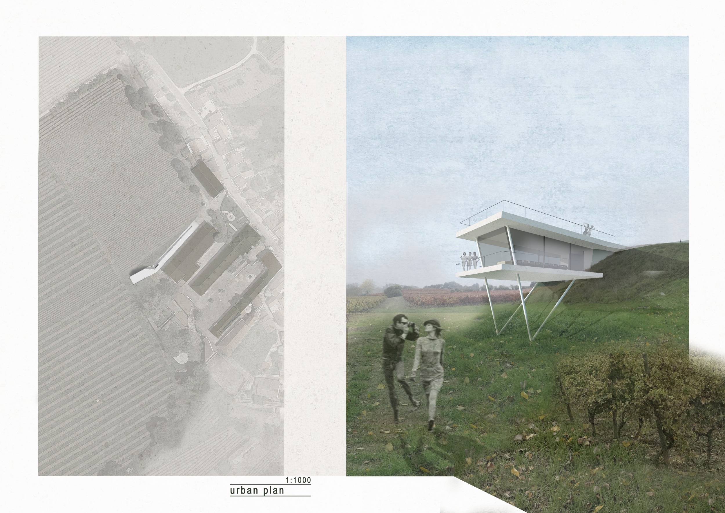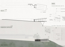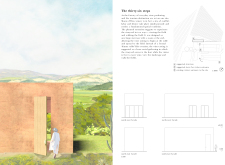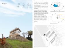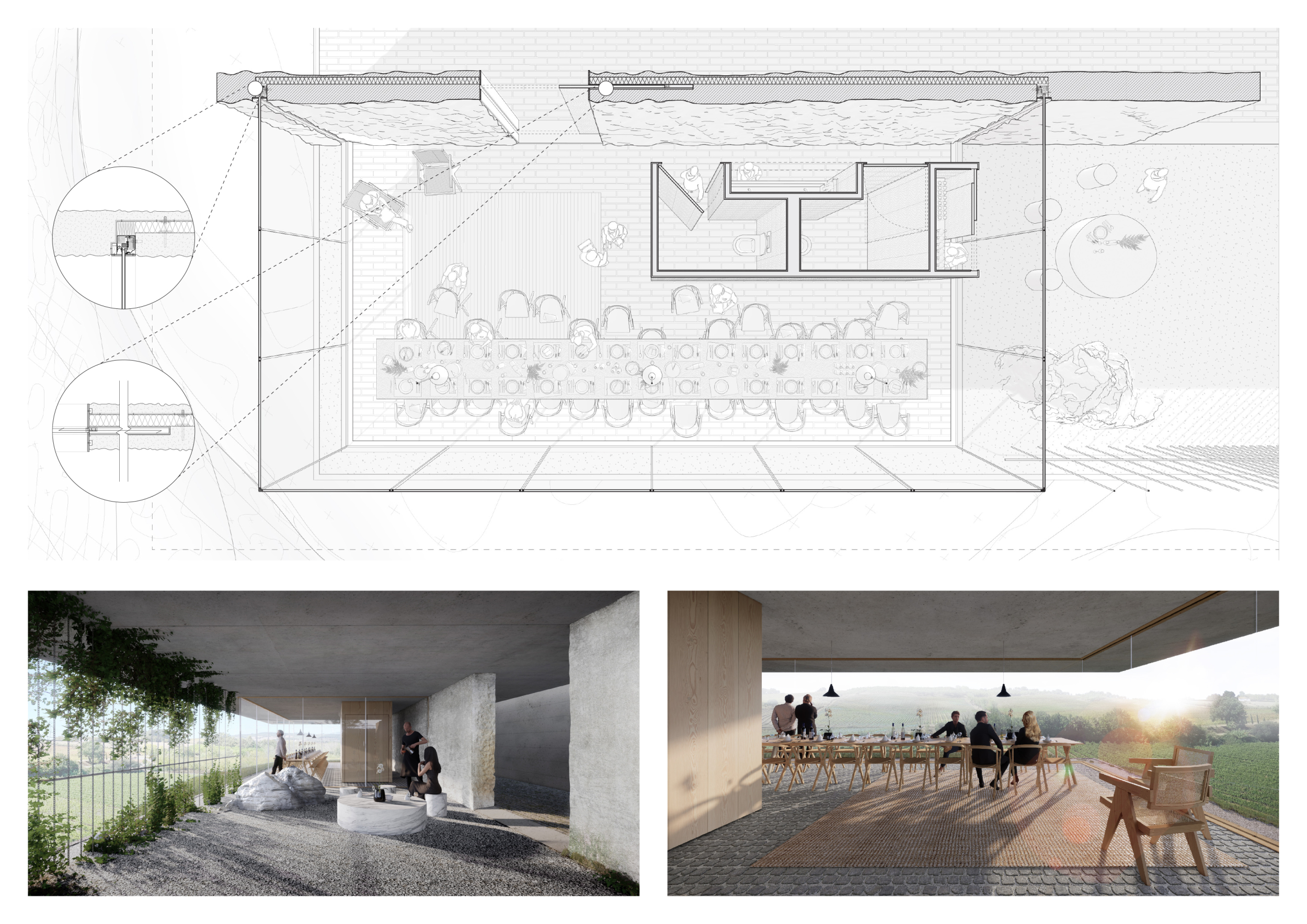 This bold proposal elevates a pitched-roof enclosure containing a ‘hanging wine cellar’ that floats above a wine tasting area semi-embedded into the hillside within a solid stone foundation. The two simple forms are divided horizontally by a glass shell that is set eye-level with the site, and a flat pond of water which visually enhances this effect of separation and levitation.