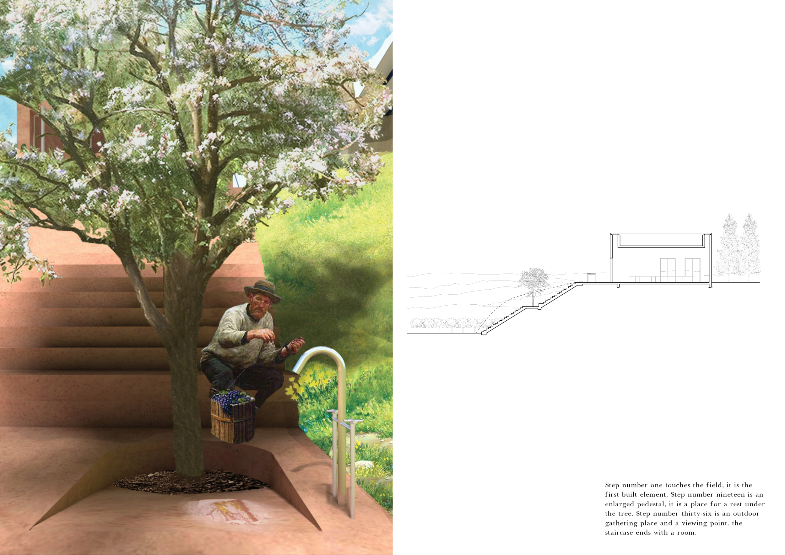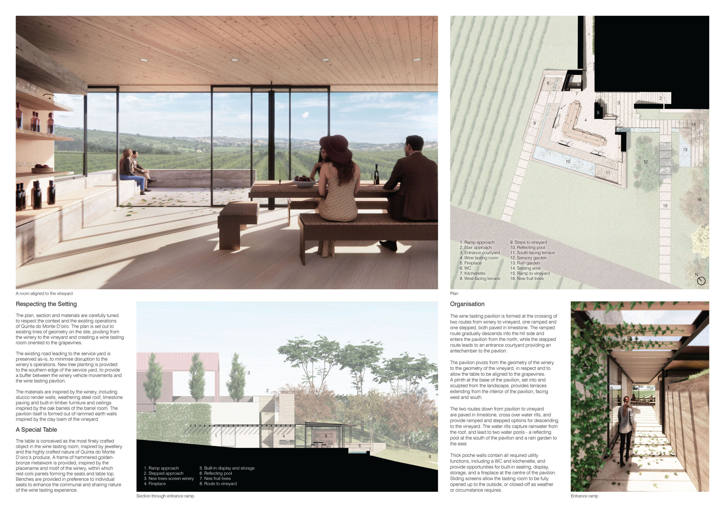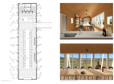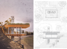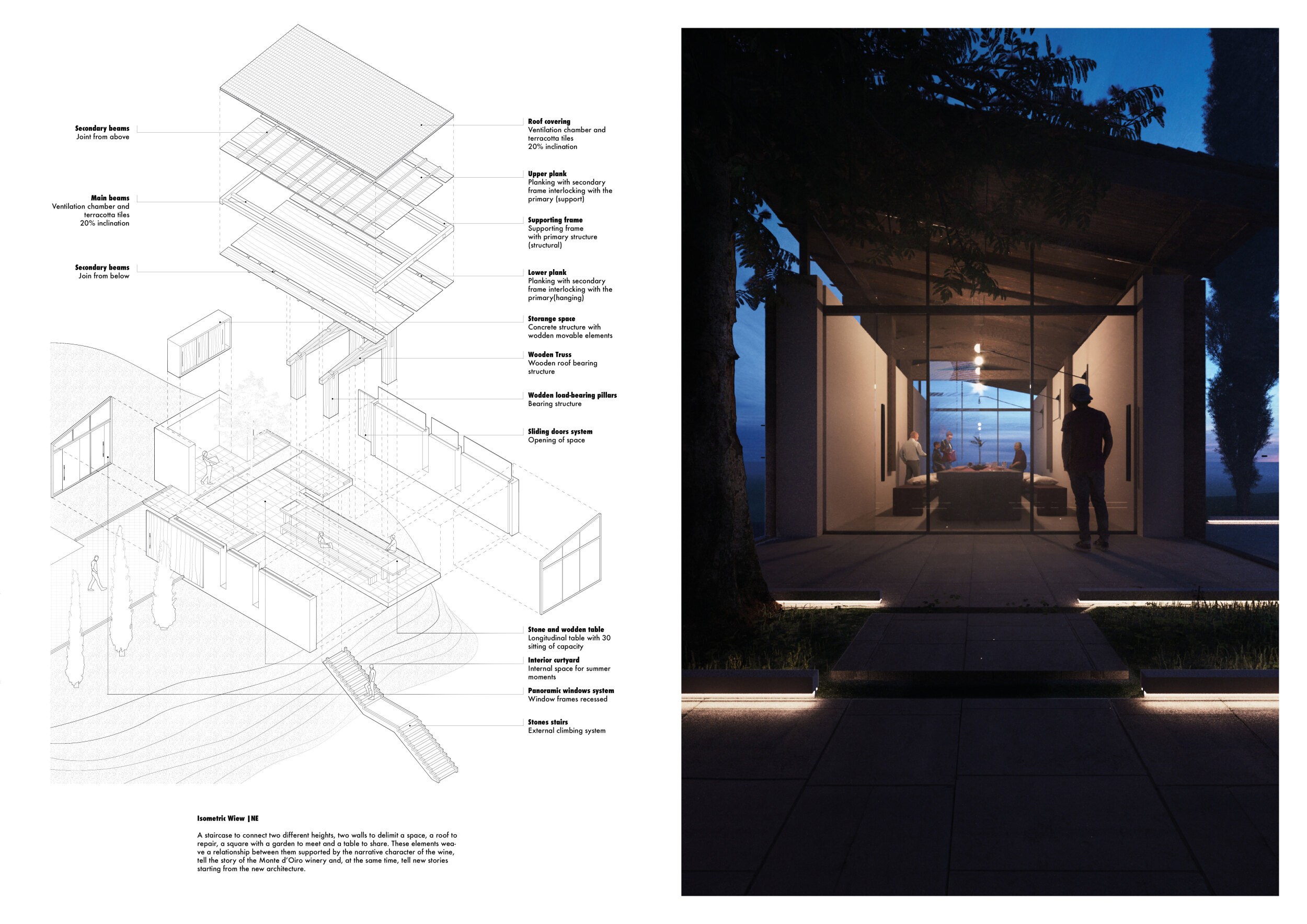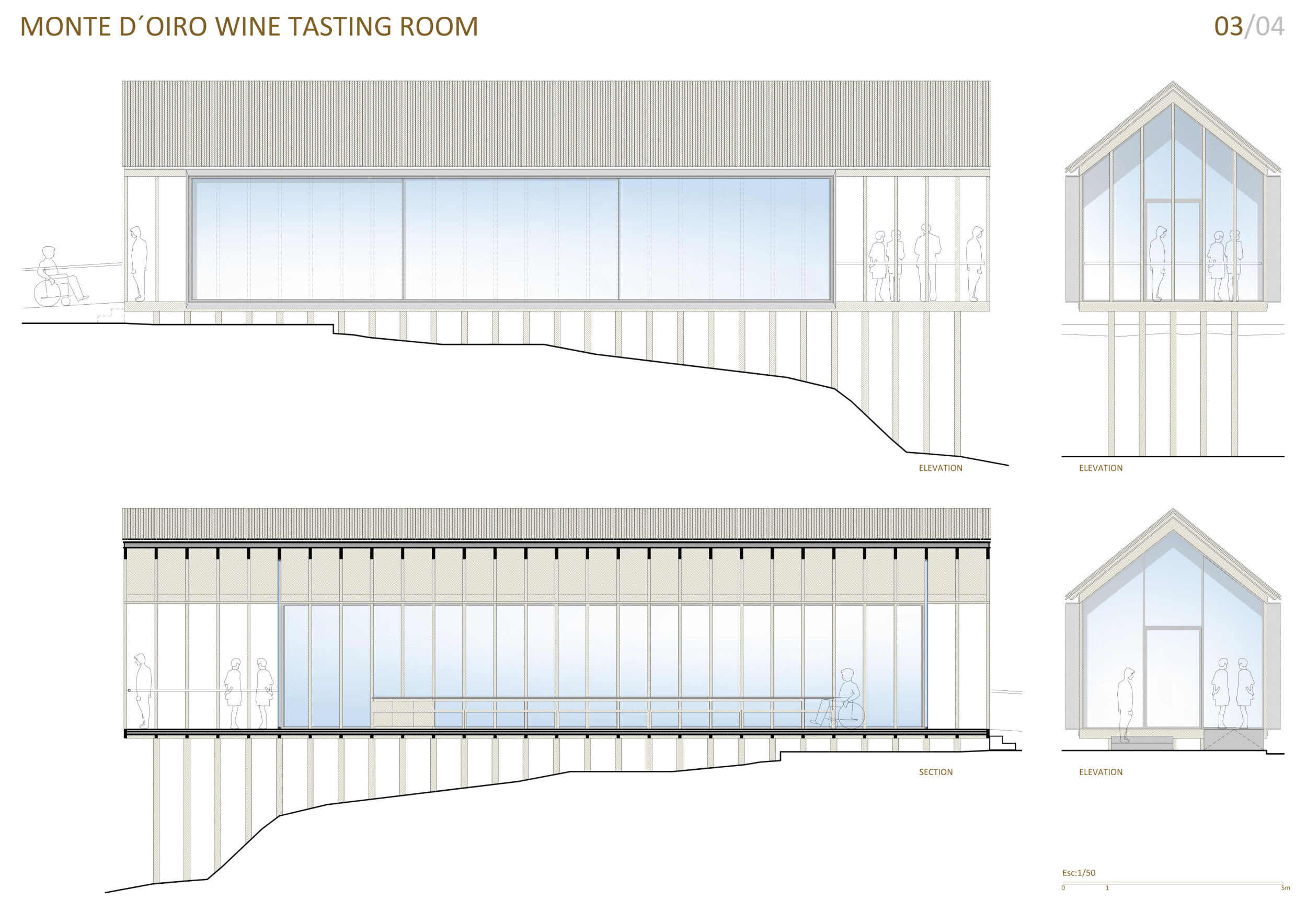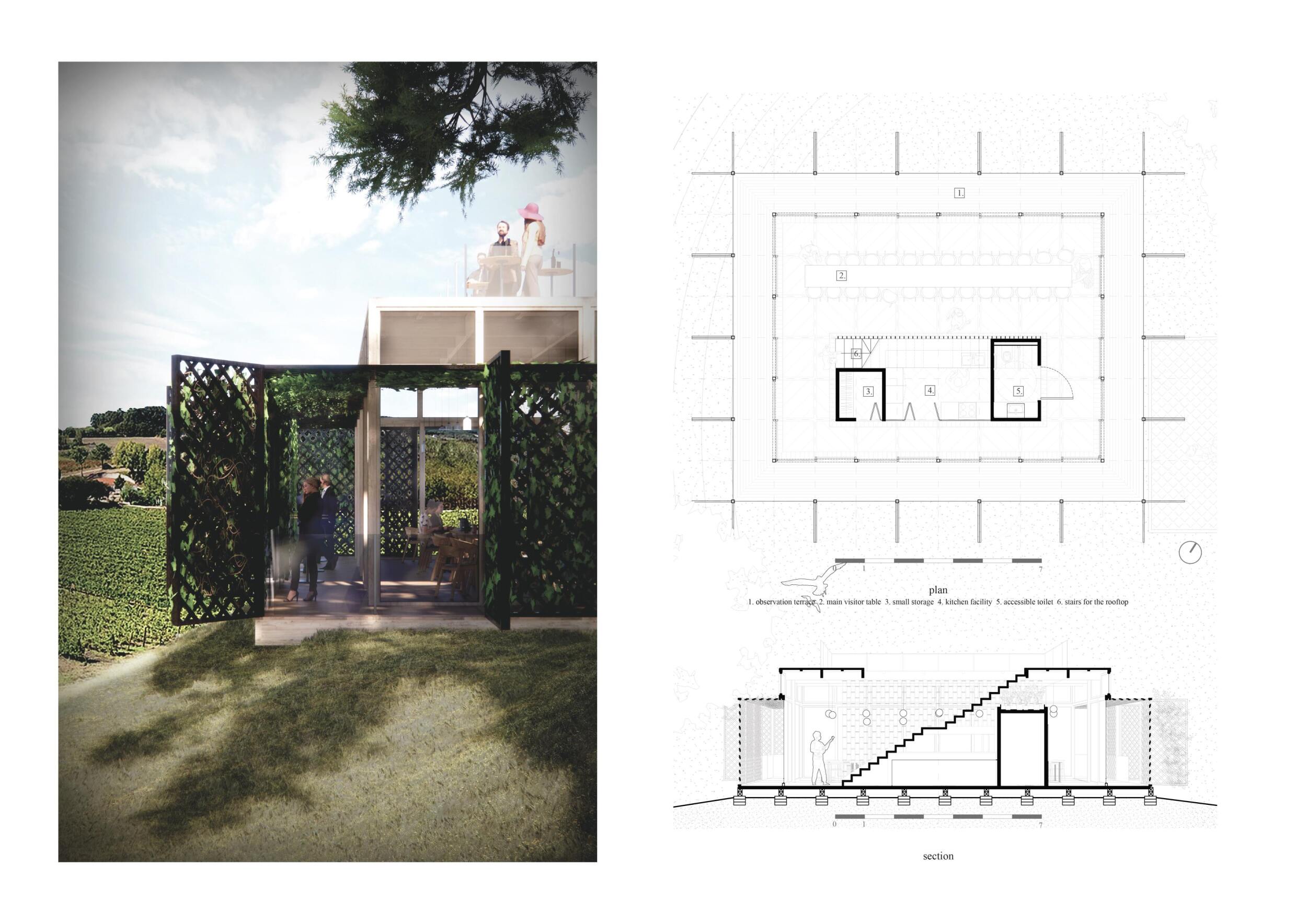 This bold proposal elevates a pitched-roof enclosure containing a ‘hanging wine cellar’ that floats above a wine tasting area semi-embedded into the hillside within a solid stone foundation. The two simple forms are divided horizontally by a glass shell that is set eye-level with the site, and a flat pond of water which visually enhances this effect of separation and levitation.