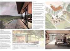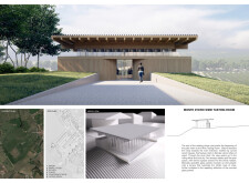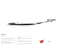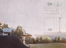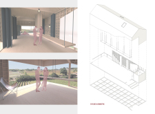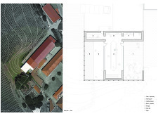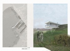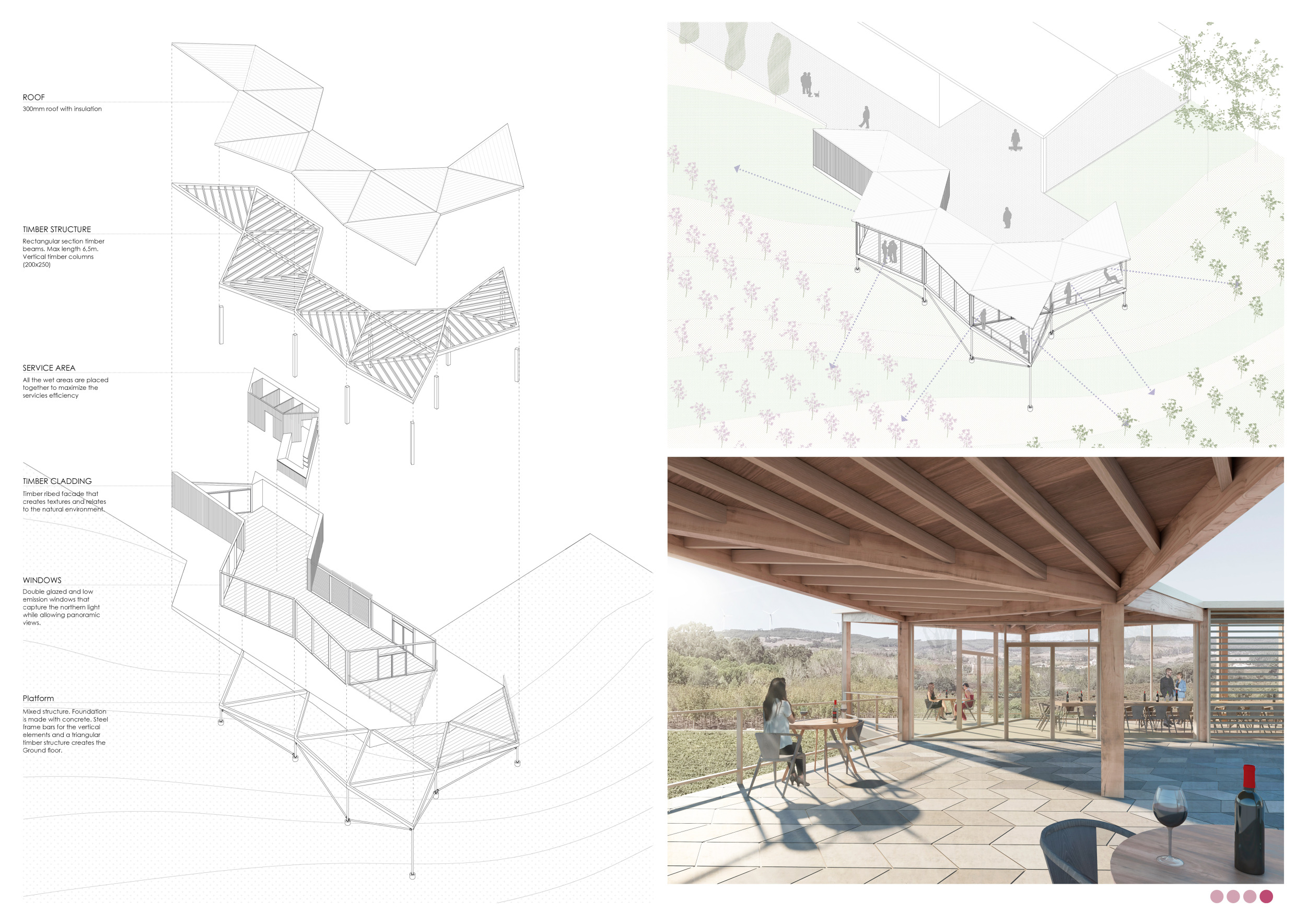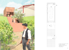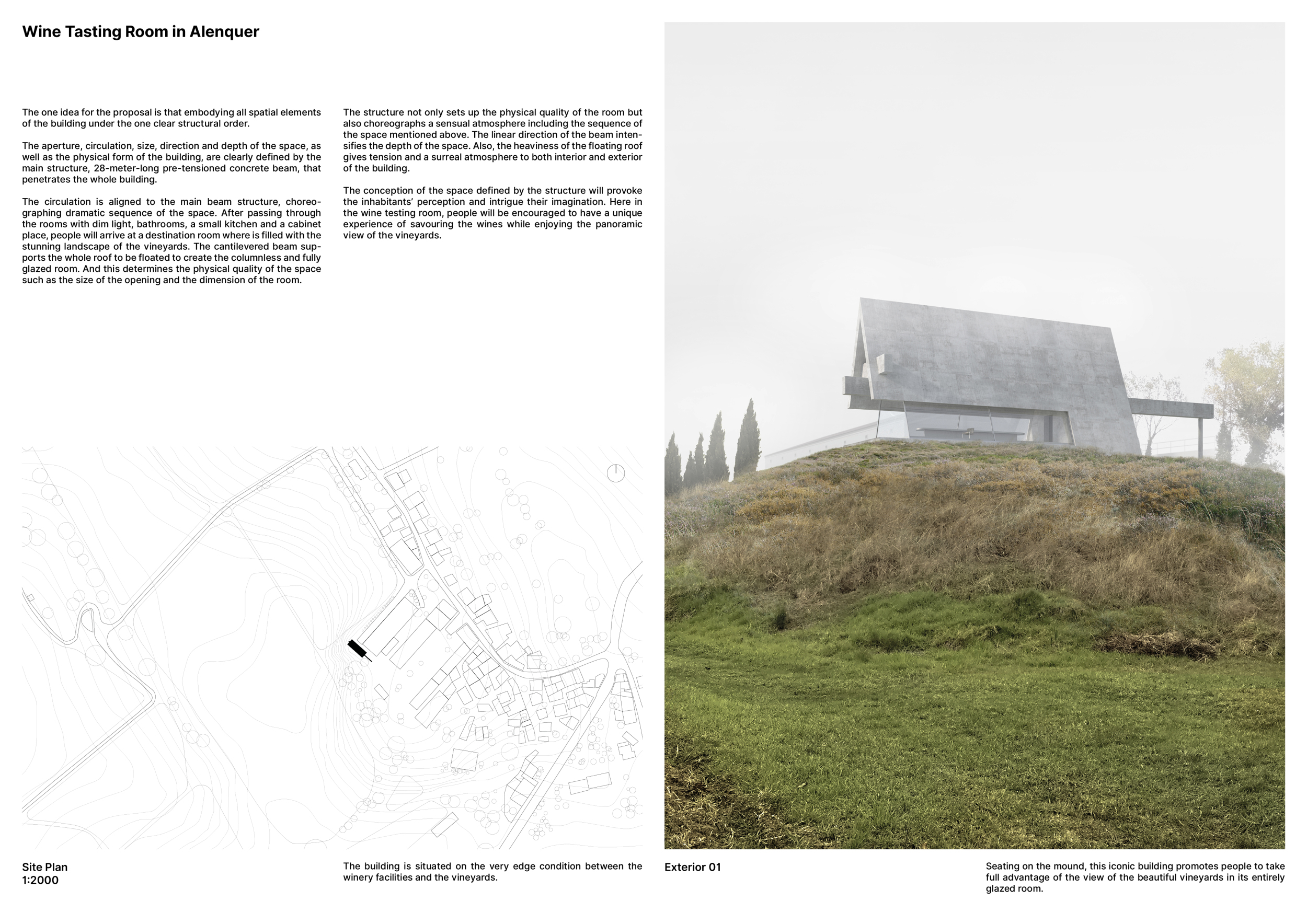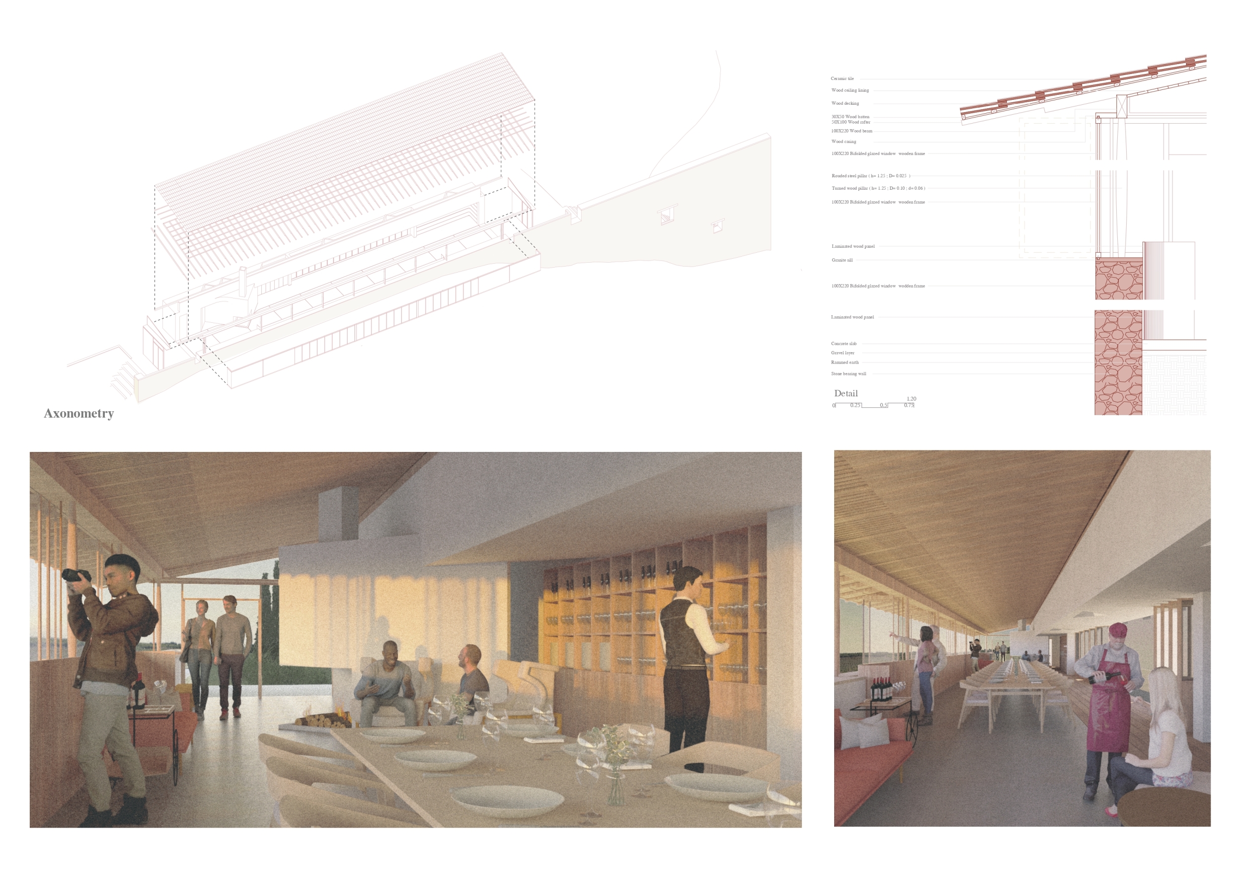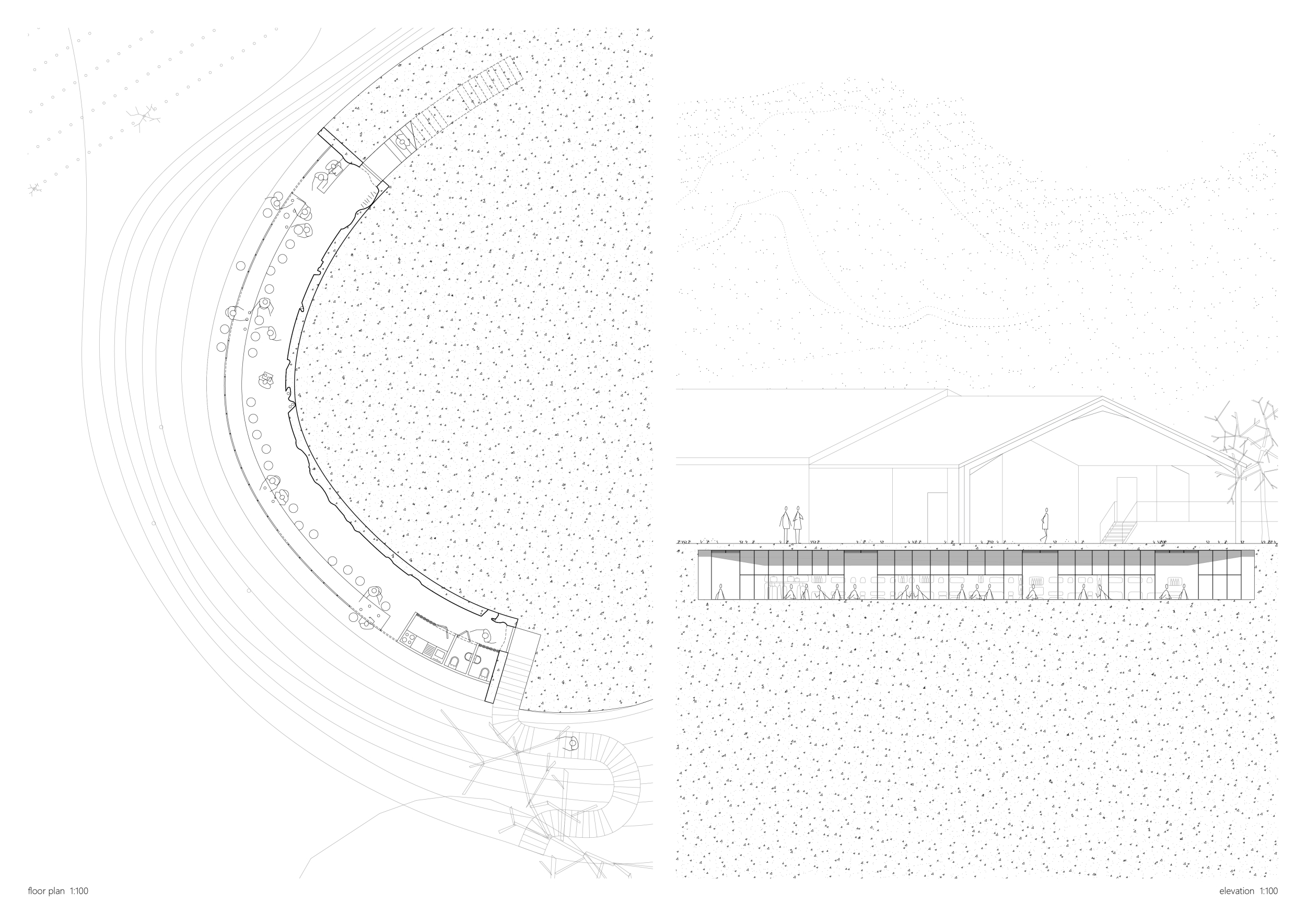 This bold proposal elevates a pitched-roof enclosure containing a ‘hanging wine cellar’ that floats above a wine tasting area semi-embedded into the hillside within a solid stone foundation. The two simple forms are divided horizontally by a glass shell that is set eye-level with the site, and a flat pond of water which visually enhances this effect of separation and levitation.