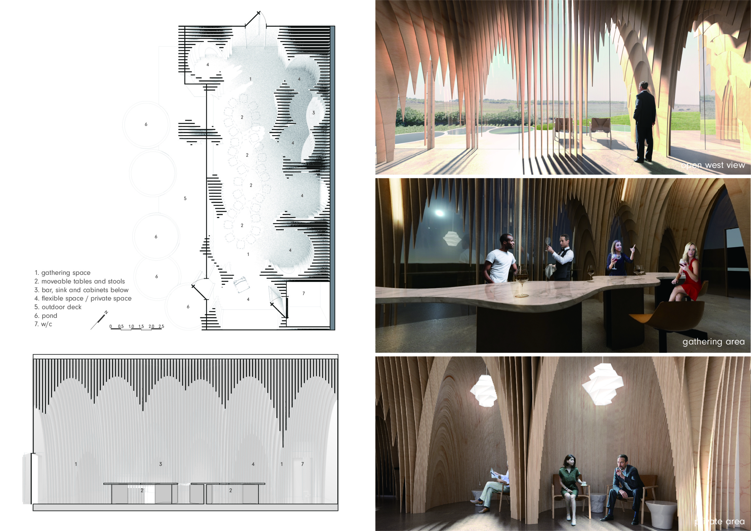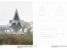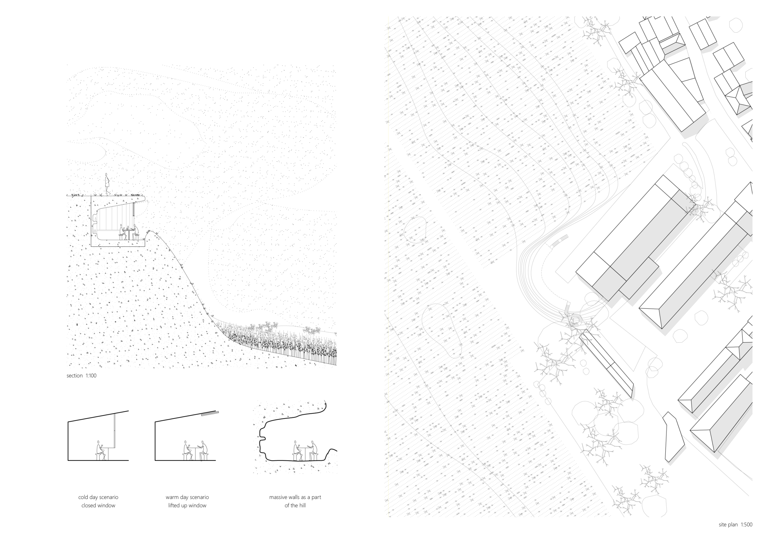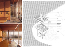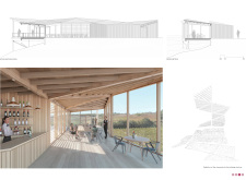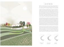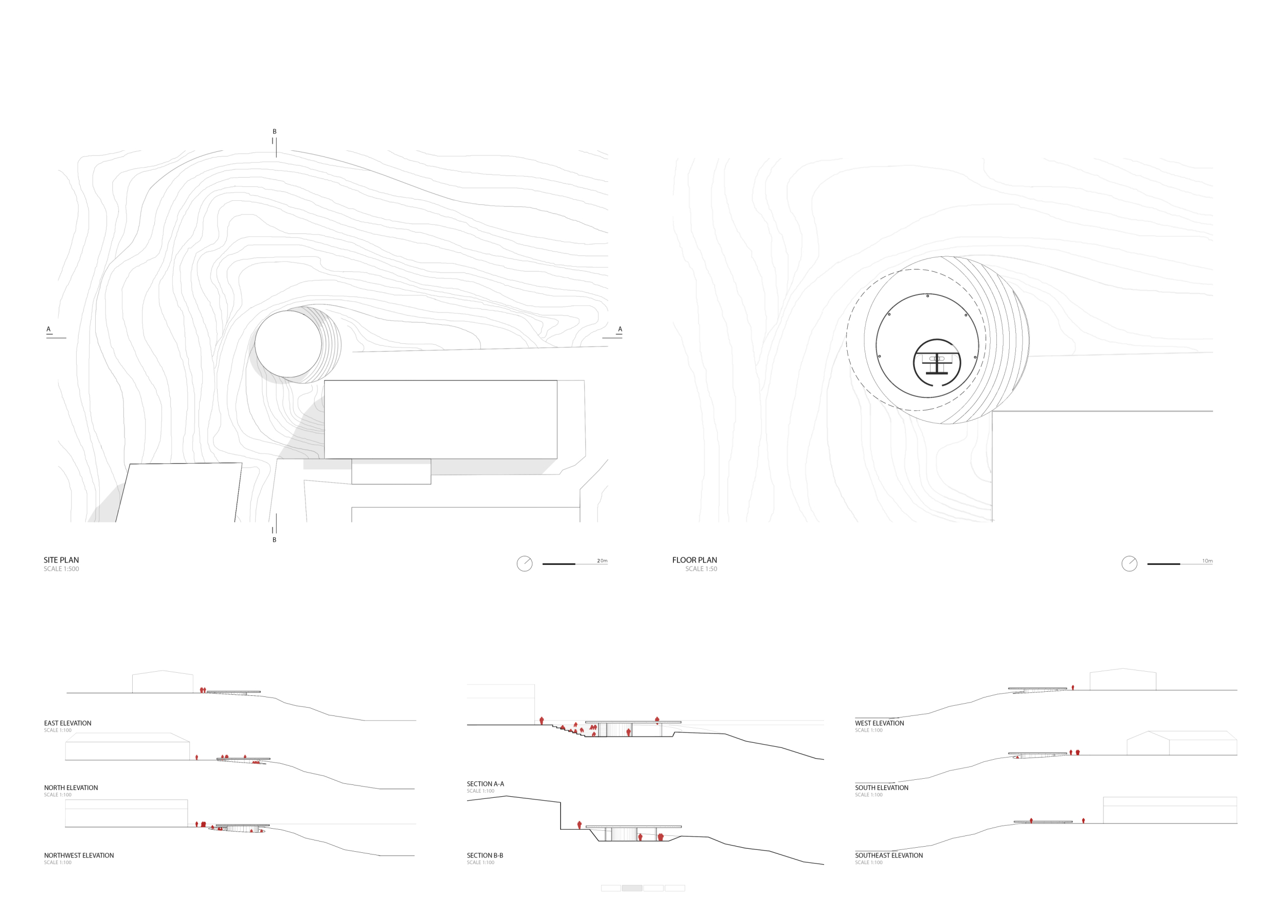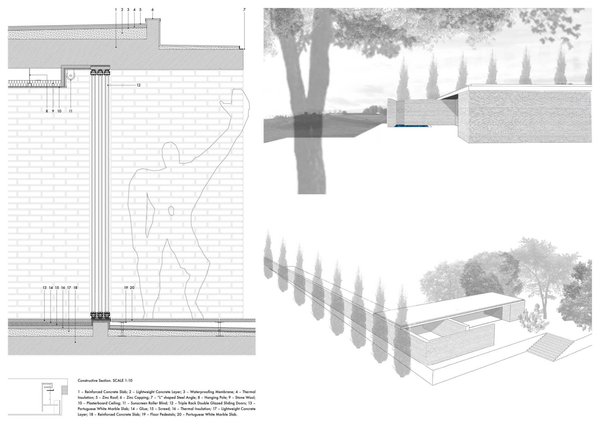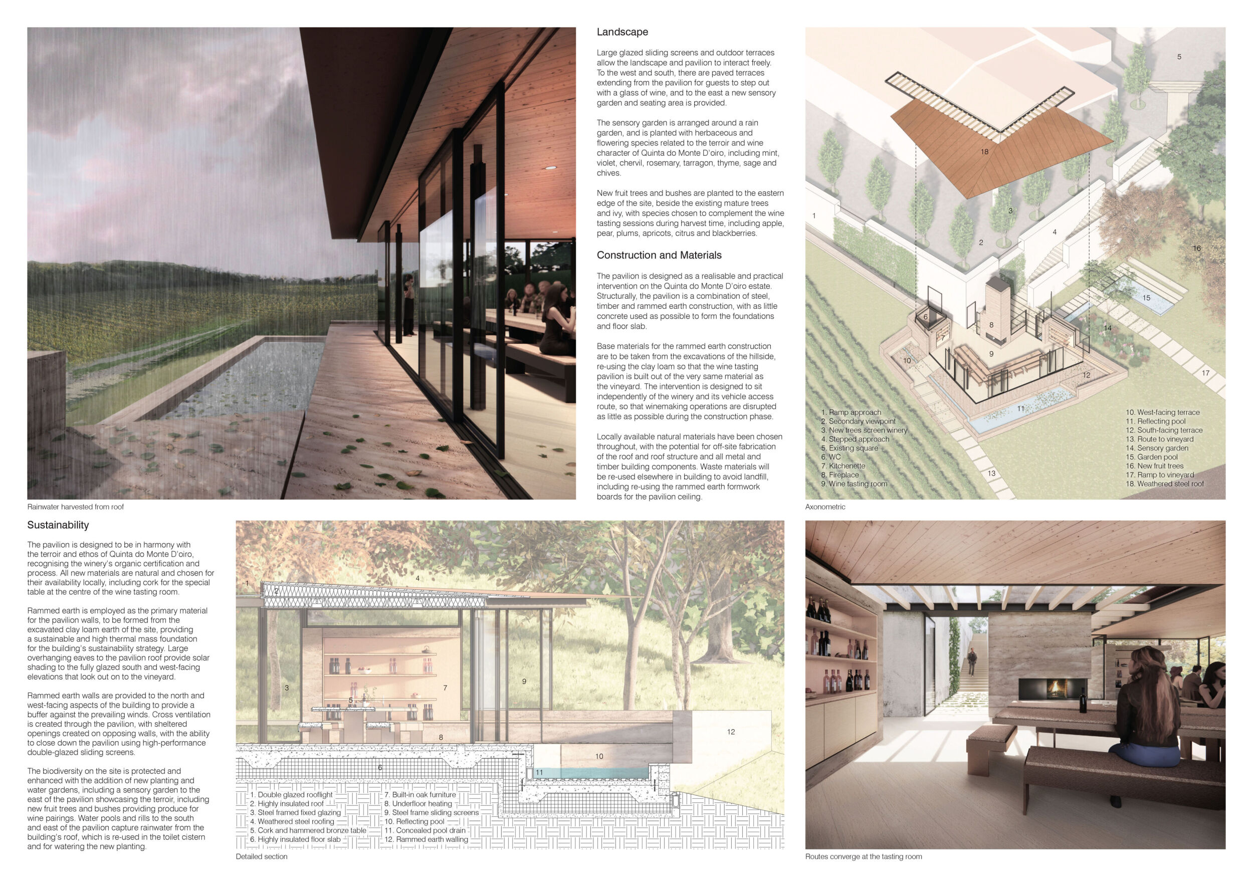 This bold proposal elevates a pitched-roof enclosure containing a ‘hanging wine cellar’ that floats above a wine tasting area semi-embedded into the hillside within a solid stone foundation. The two simple forms are divided horizontally by a glass shell that is set eye-level with the site, and a flat pond of water which visually enhances this effect of separation and levitation.