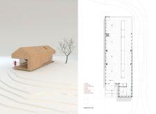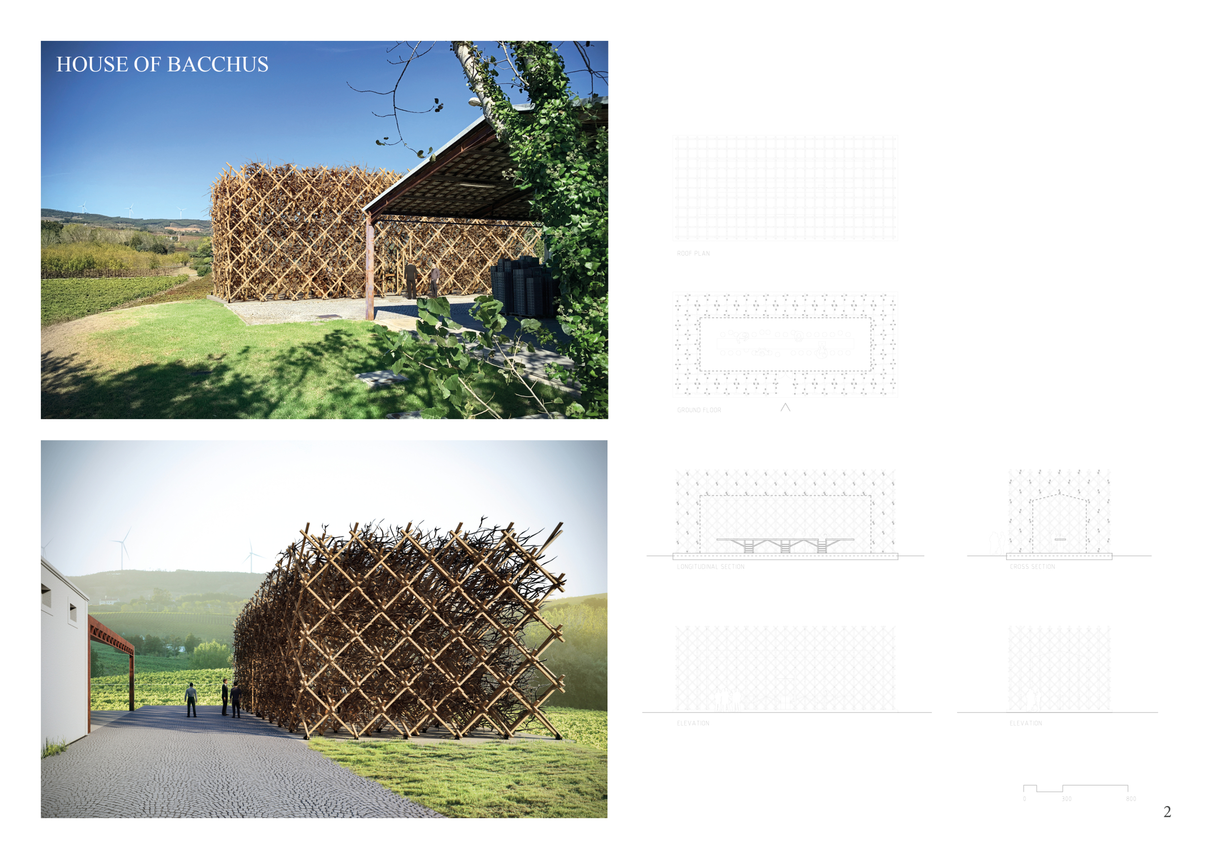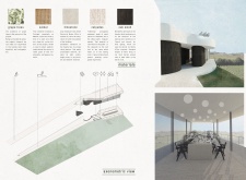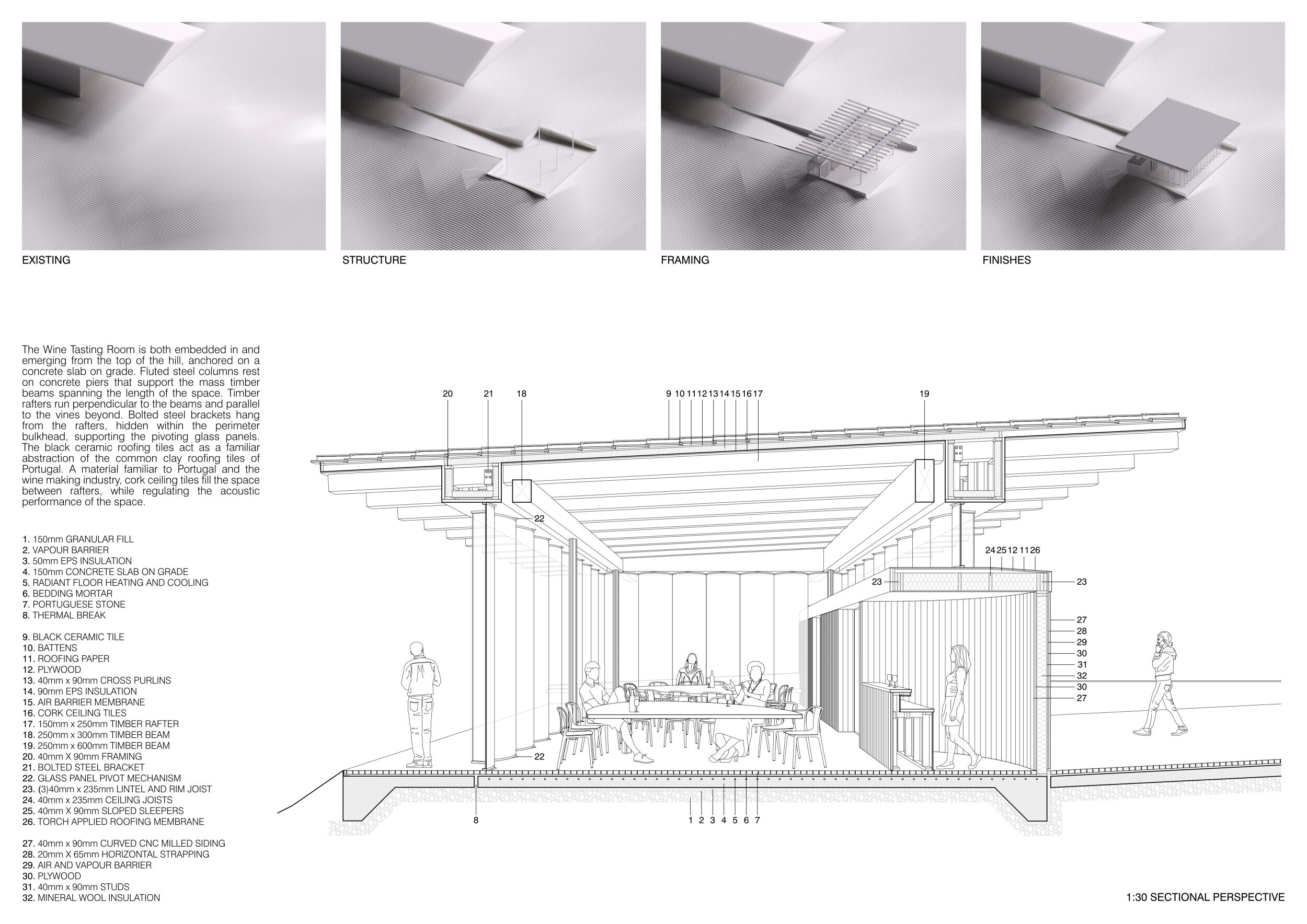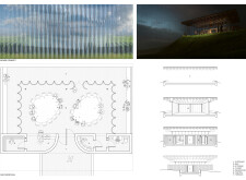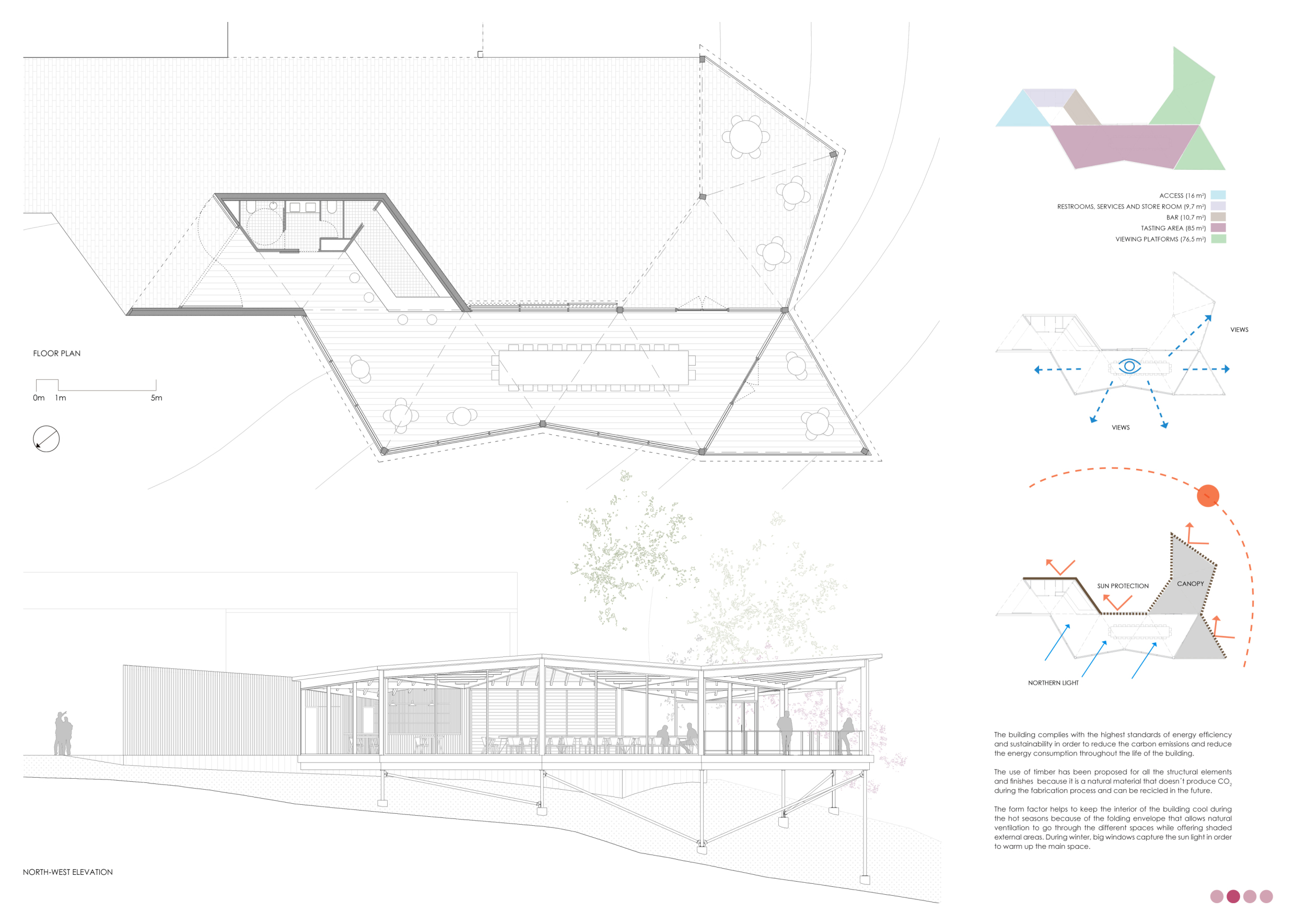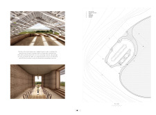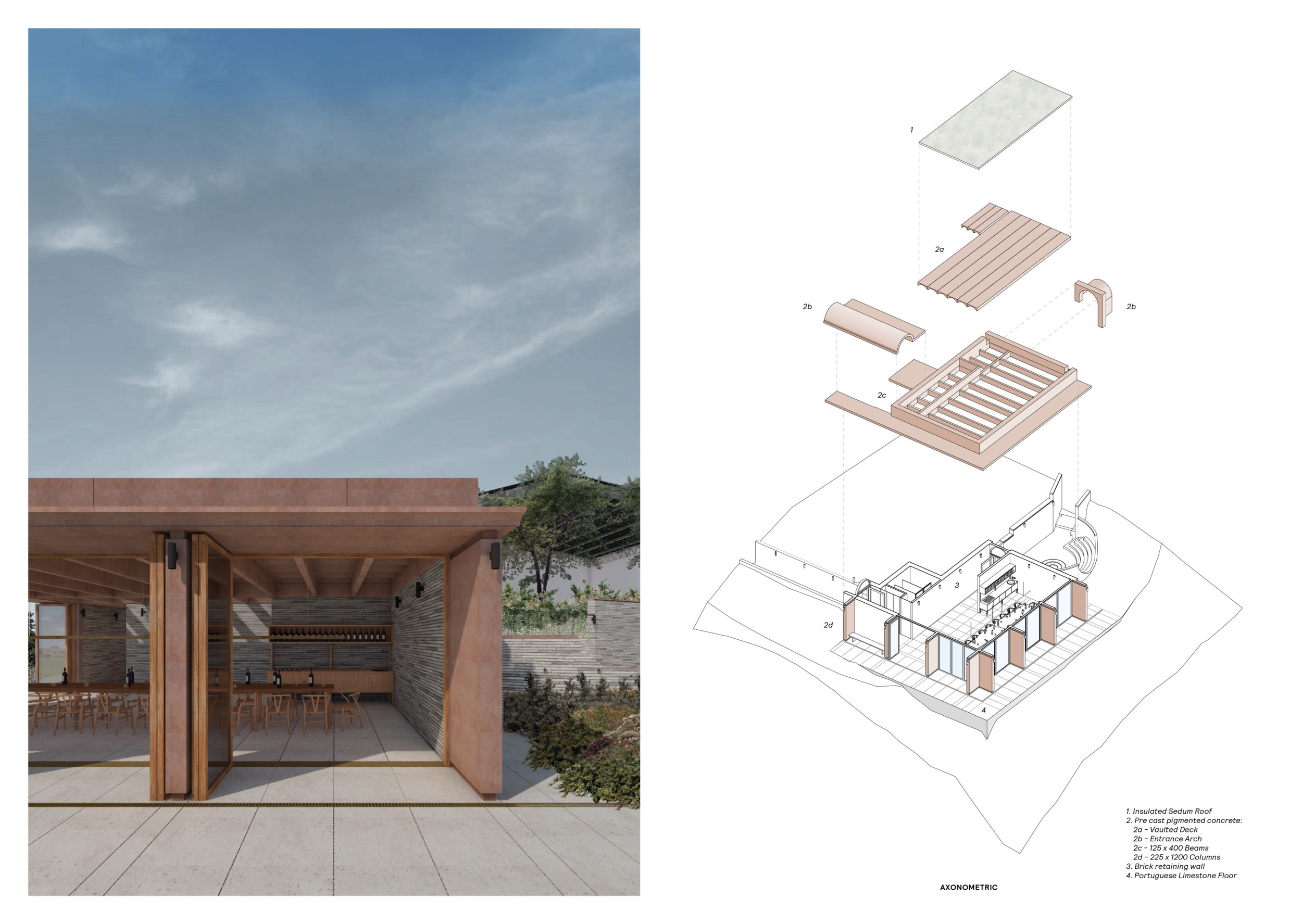 This bold proposal elevates a pitched-roof enclosure containing a ‘hanging wine cellar’ that floats above a wine tasting area semi-embedded into the hillside within a solid stone foundation. The two simple forms are divided horizontally by a glass shell that is set eye-level with the site, and a flat pond of water which visually enhances this effect of separation and levitation.