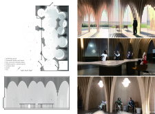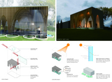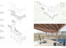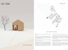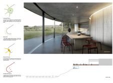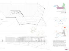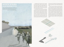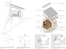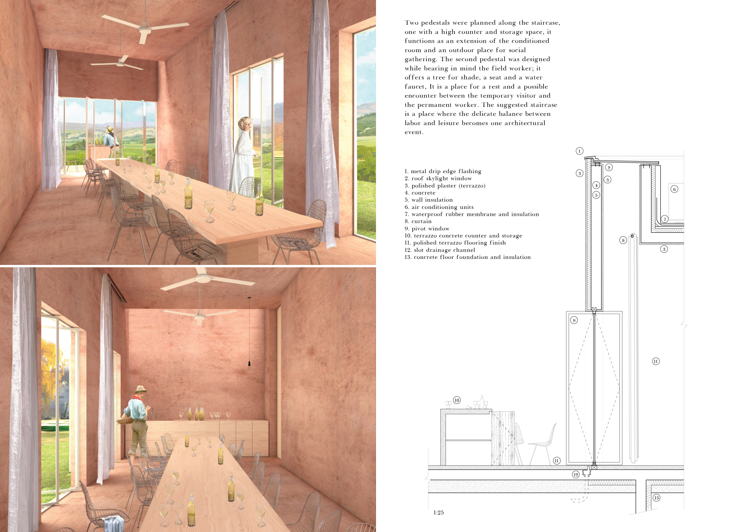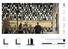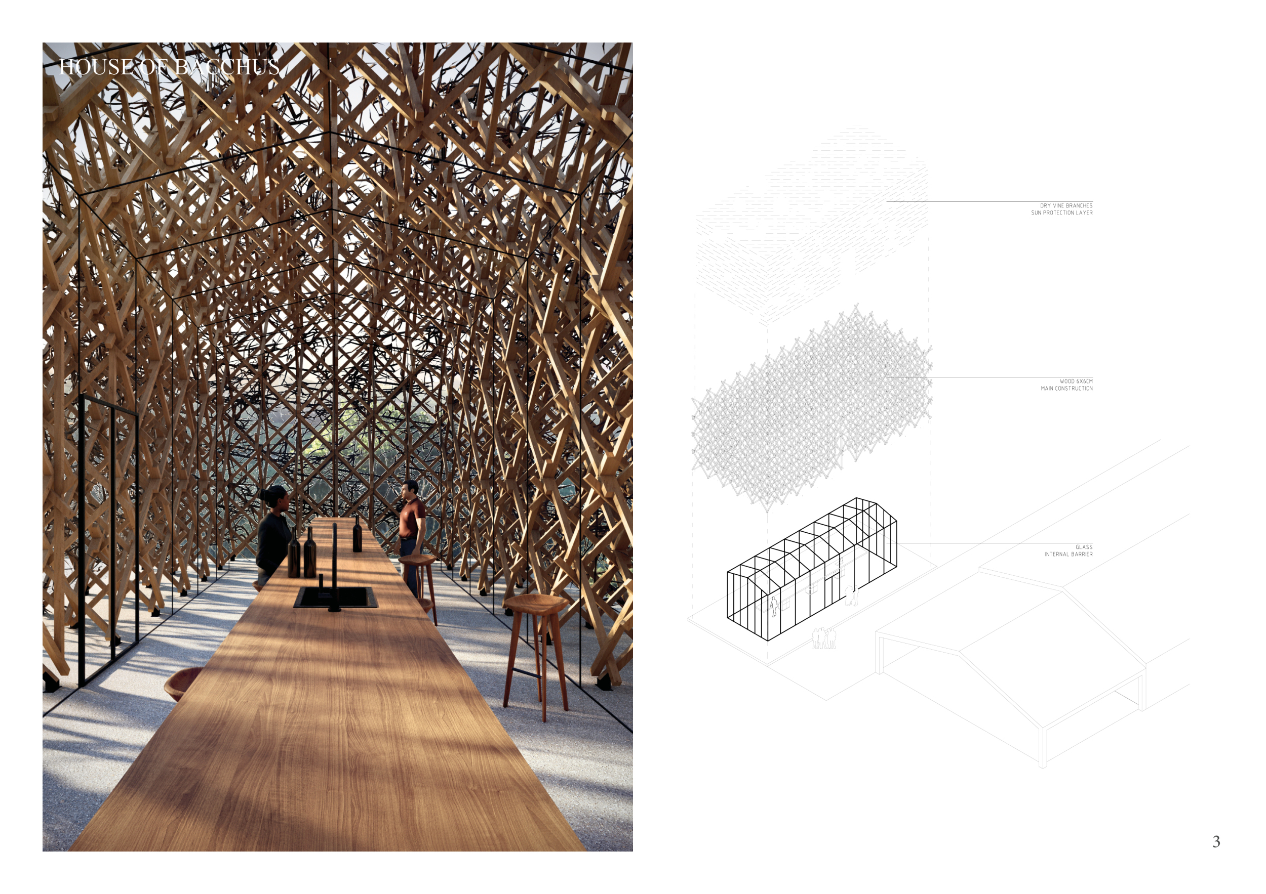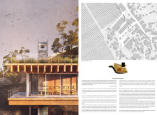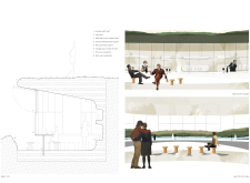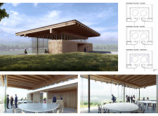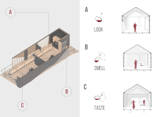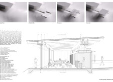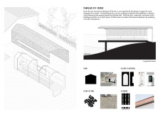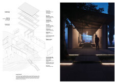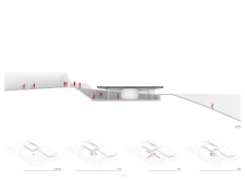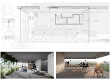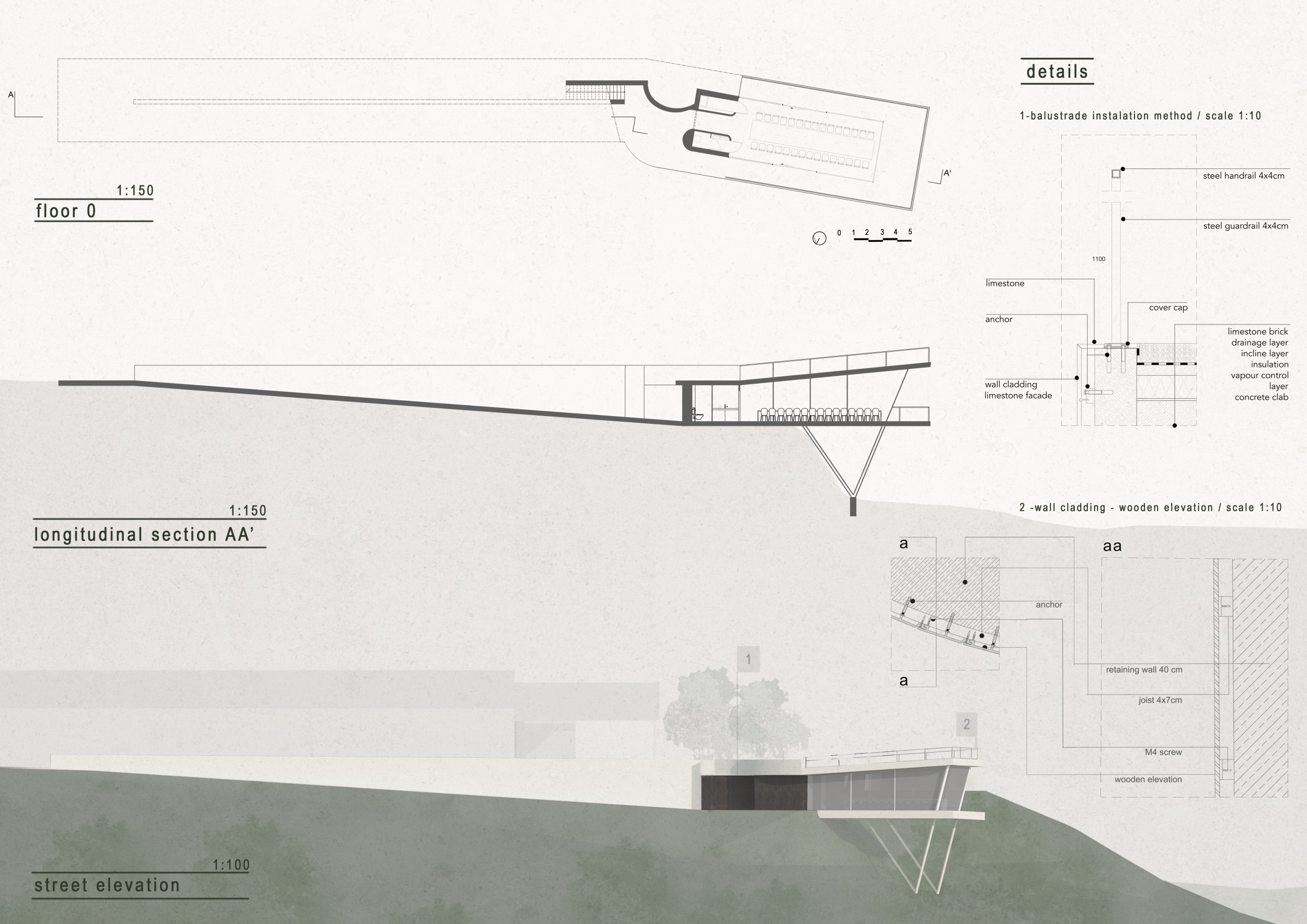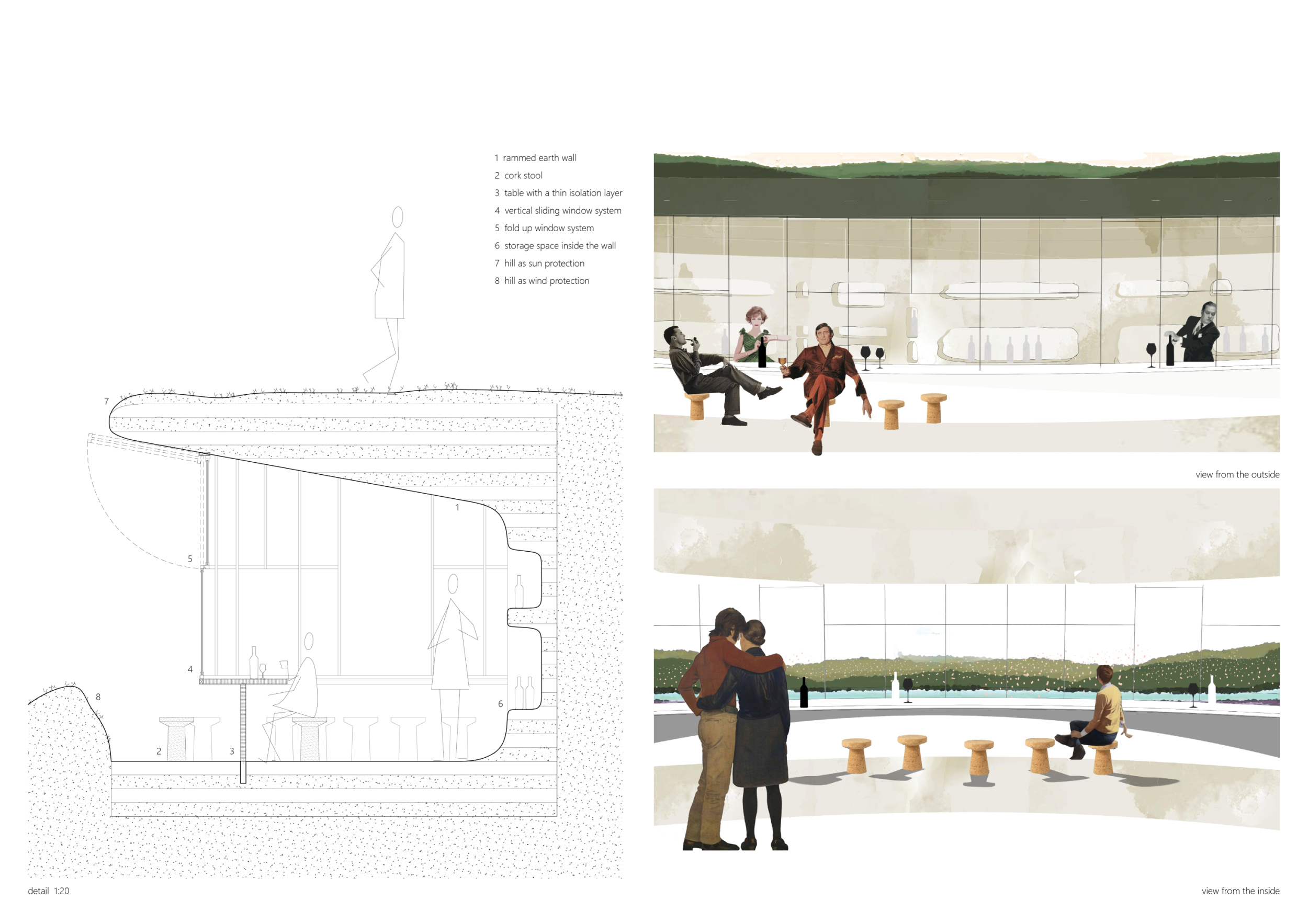 This bold proposal elevates a pitched-roof enclosure containing a ‘hanging wine cellar’ that floats above a wine tasting area semi-embedded into the hillside within a solid stone foundation. The two simple forms are divided horizontally by a glass shell that is set eye-level with the site, and a flat pond of water which visually enhances this effect of separation and levitation.
