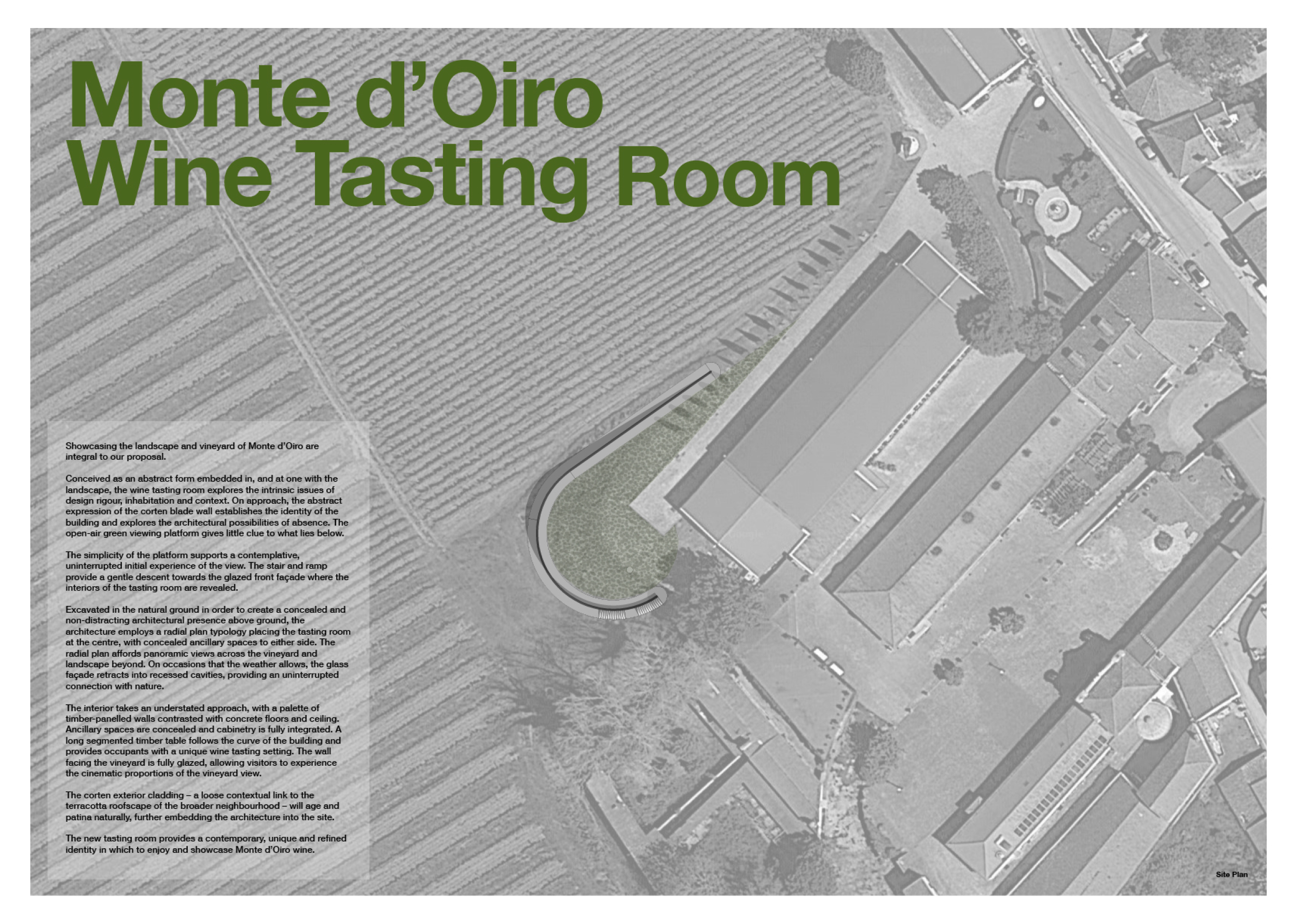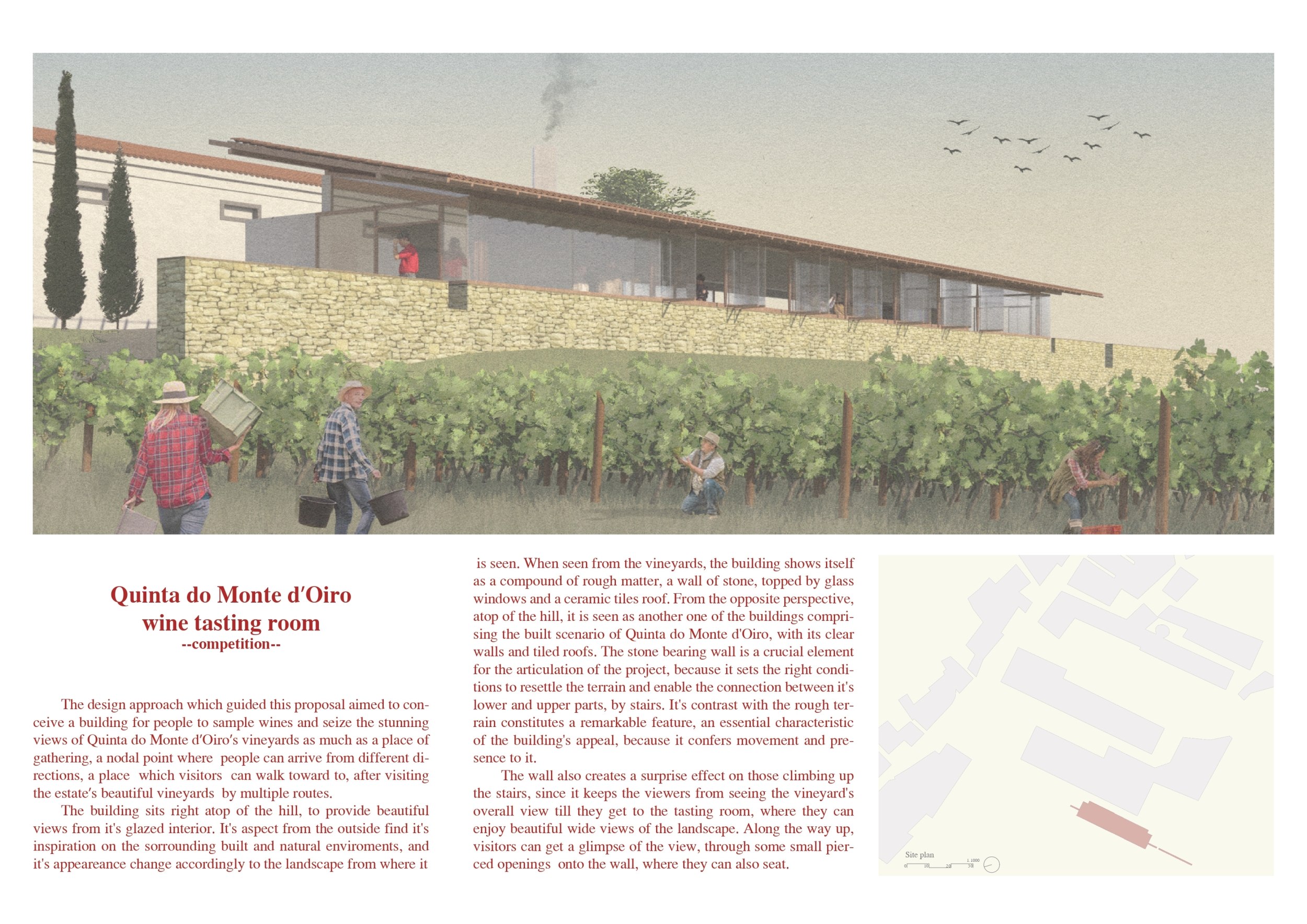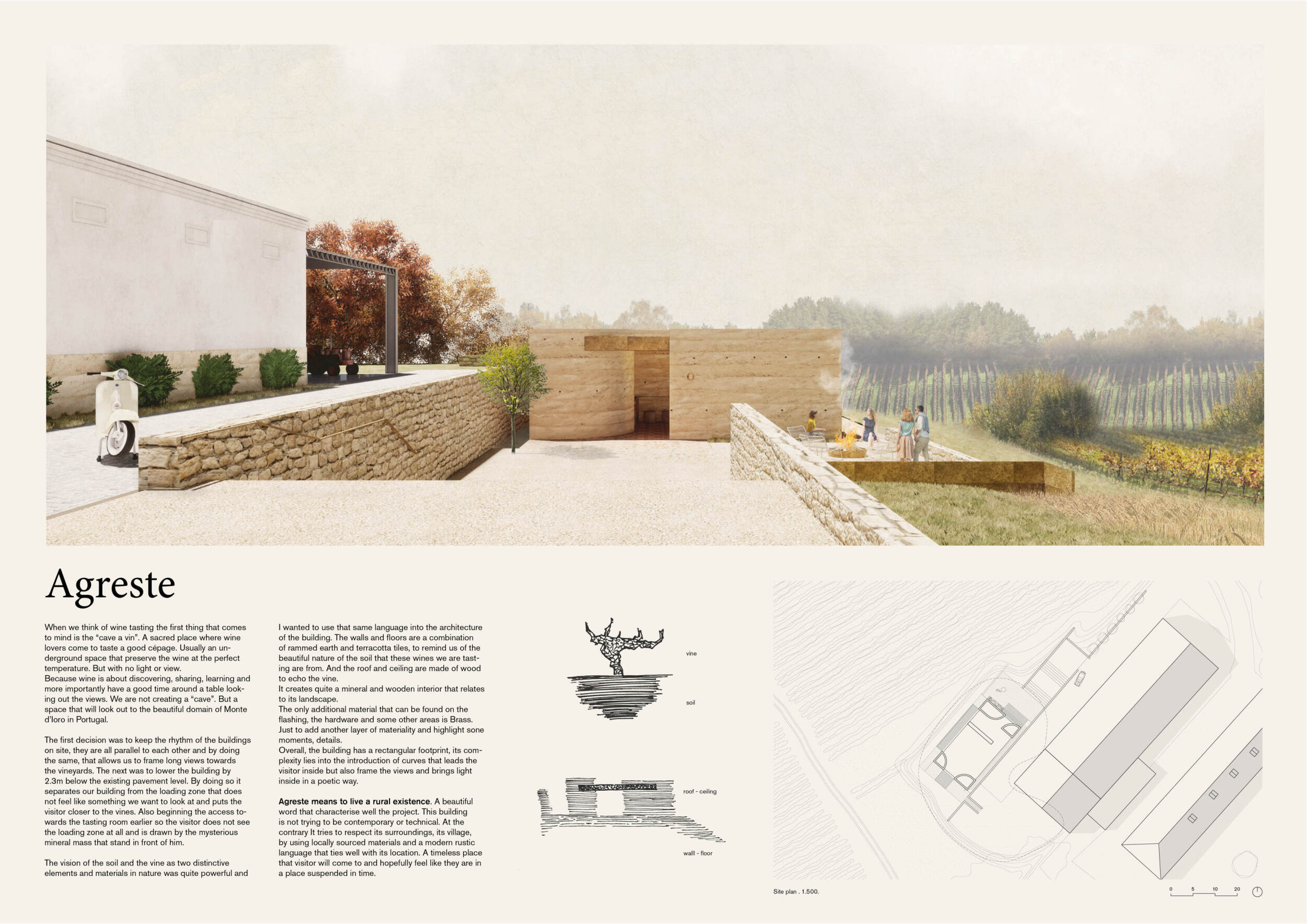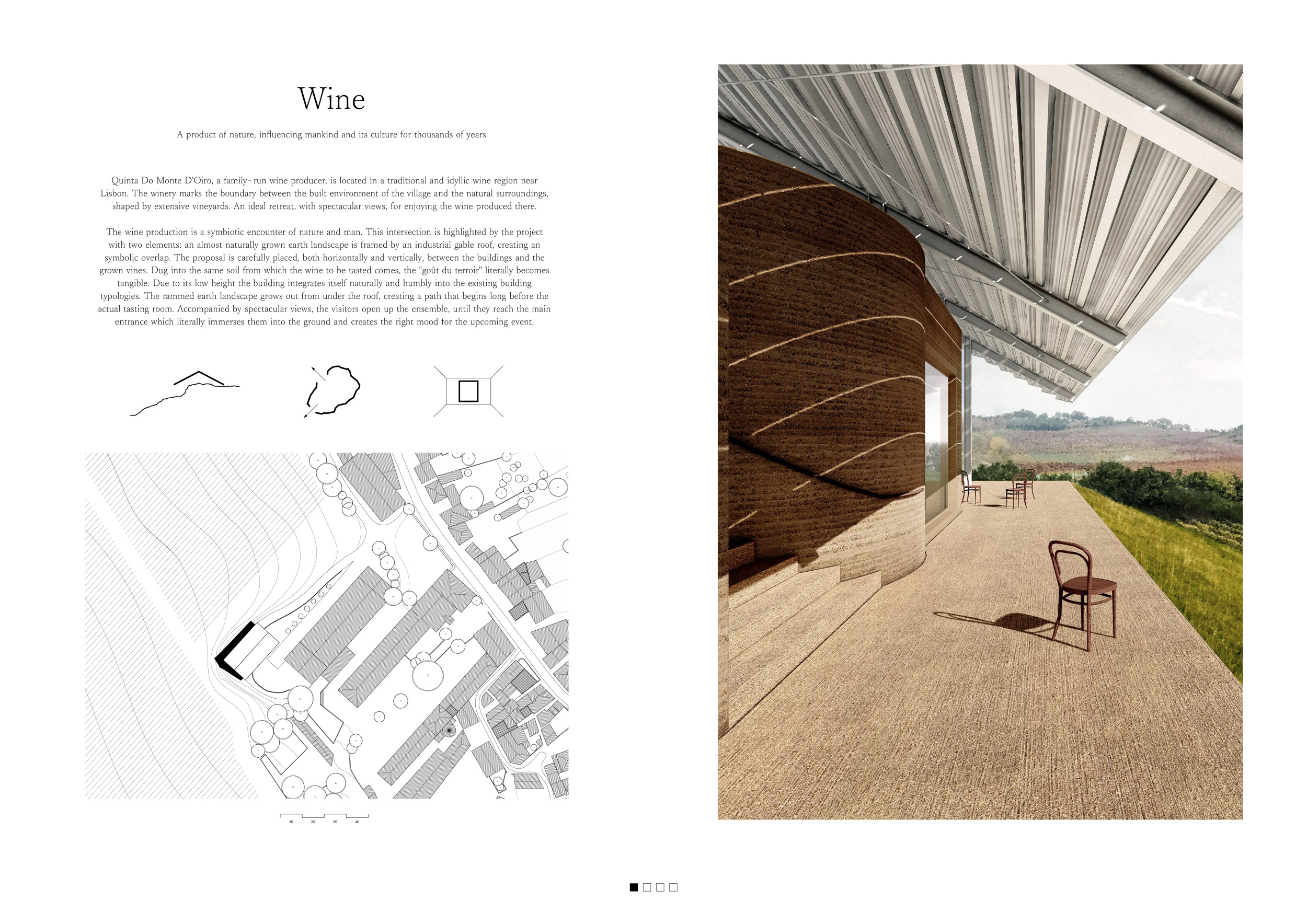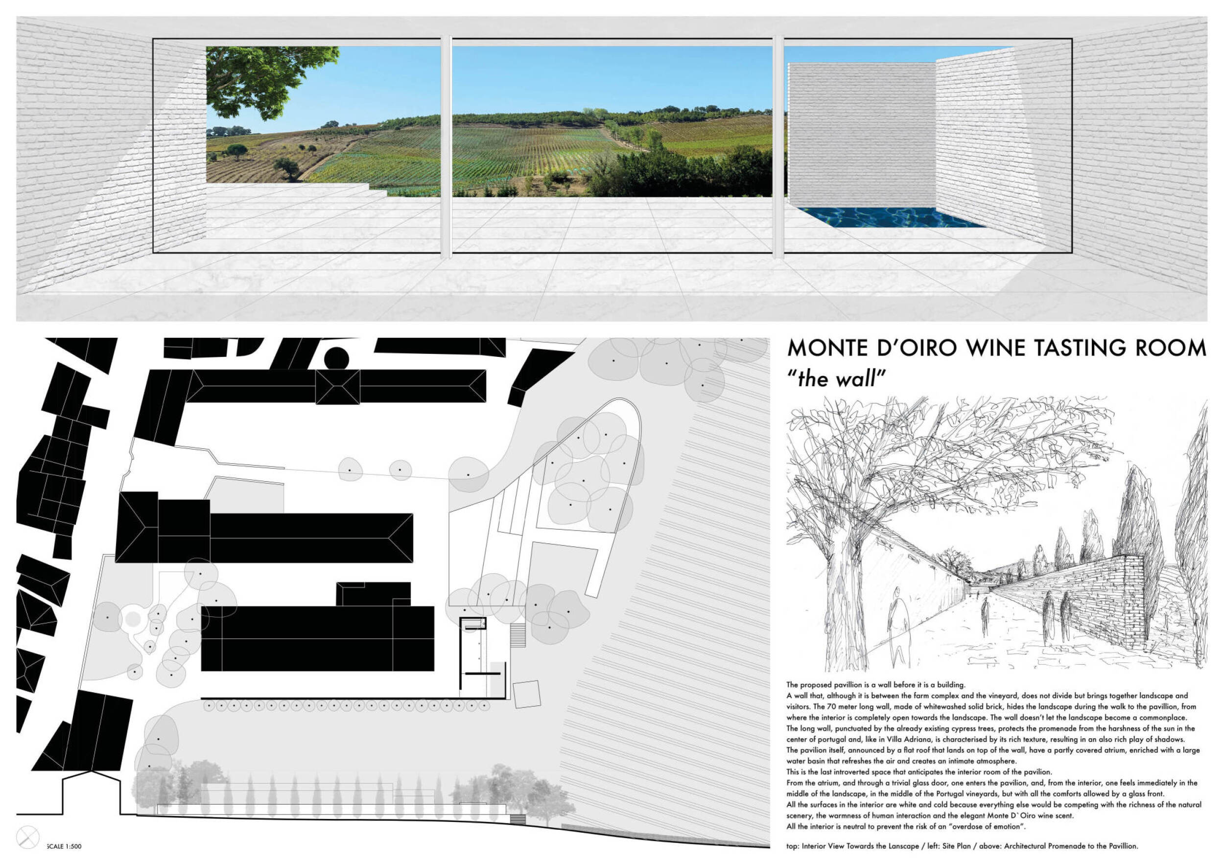 For the Monte d’Oiro Wine Tasting Room competition, the vineyard is seeking design ideas for a wine tasting room, where approximately 30 people can gather around a special tasting table to enjoy the wines as well as the magnificent views of the vineyard. The 60m² space is to be open and inviting, and the program is to provide simple amenities such as running water and storage. Designs for the tasting room were requested to be considerate of the existing vineyard facilities, while at the same time capable of becoming an architectural landmark. The Quinta do Monte d’Oiro has expressed an interest in constructing the winning proposal.