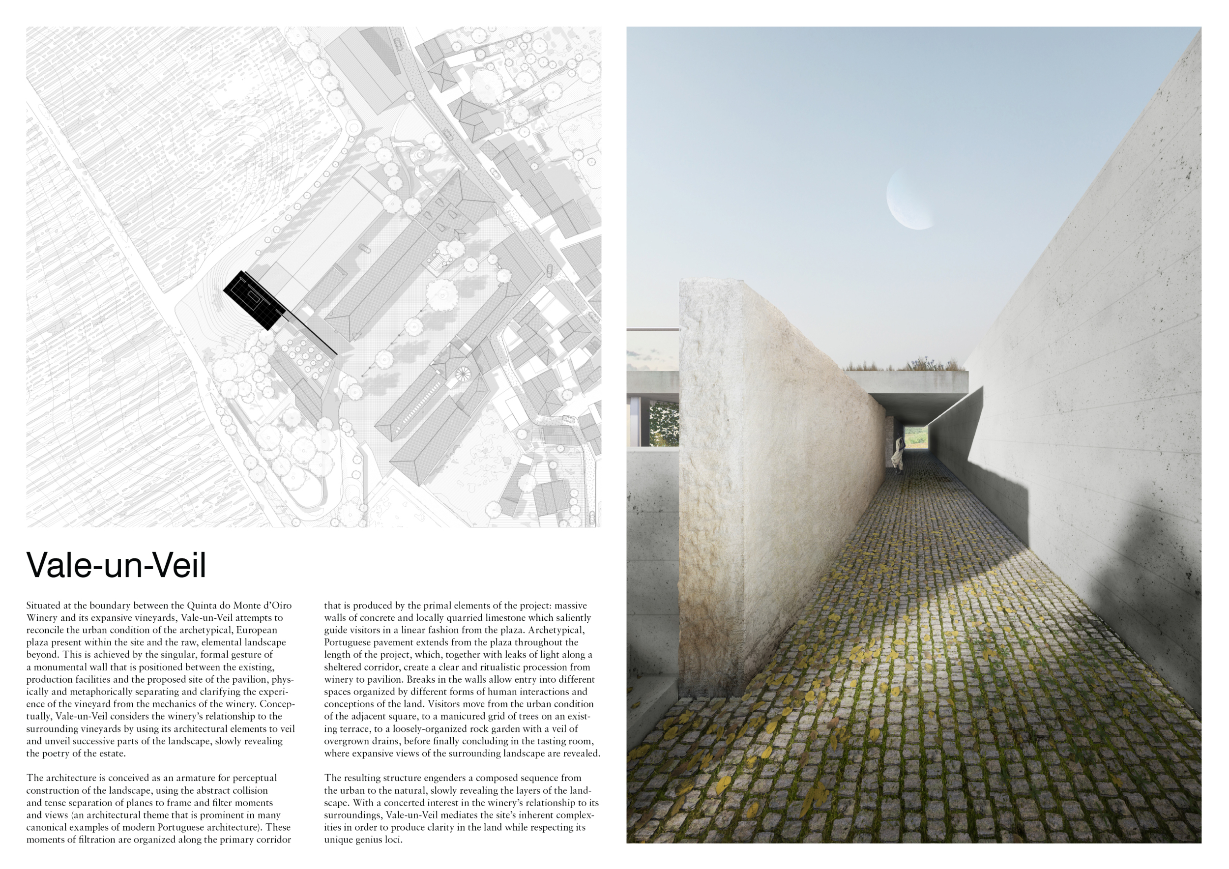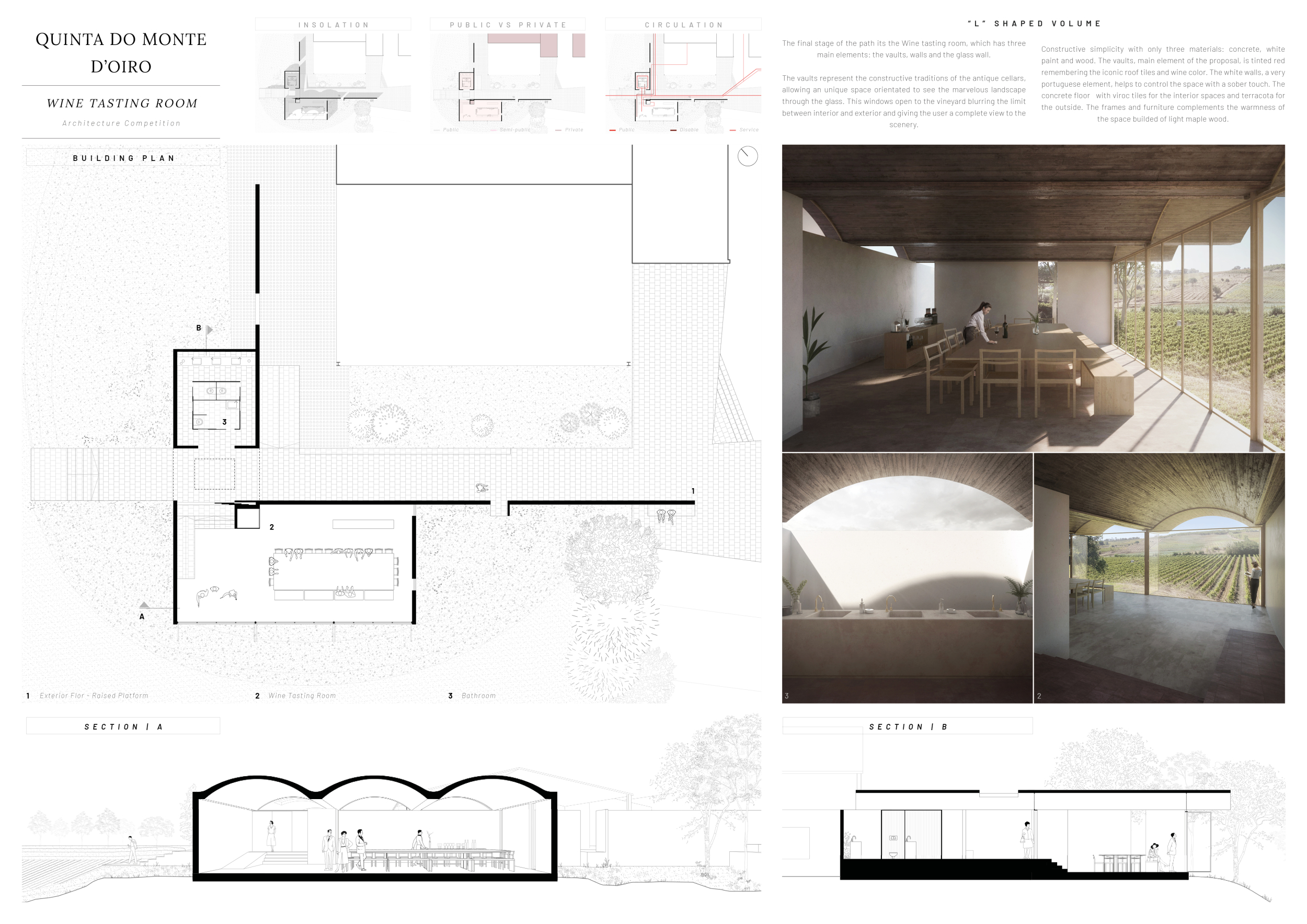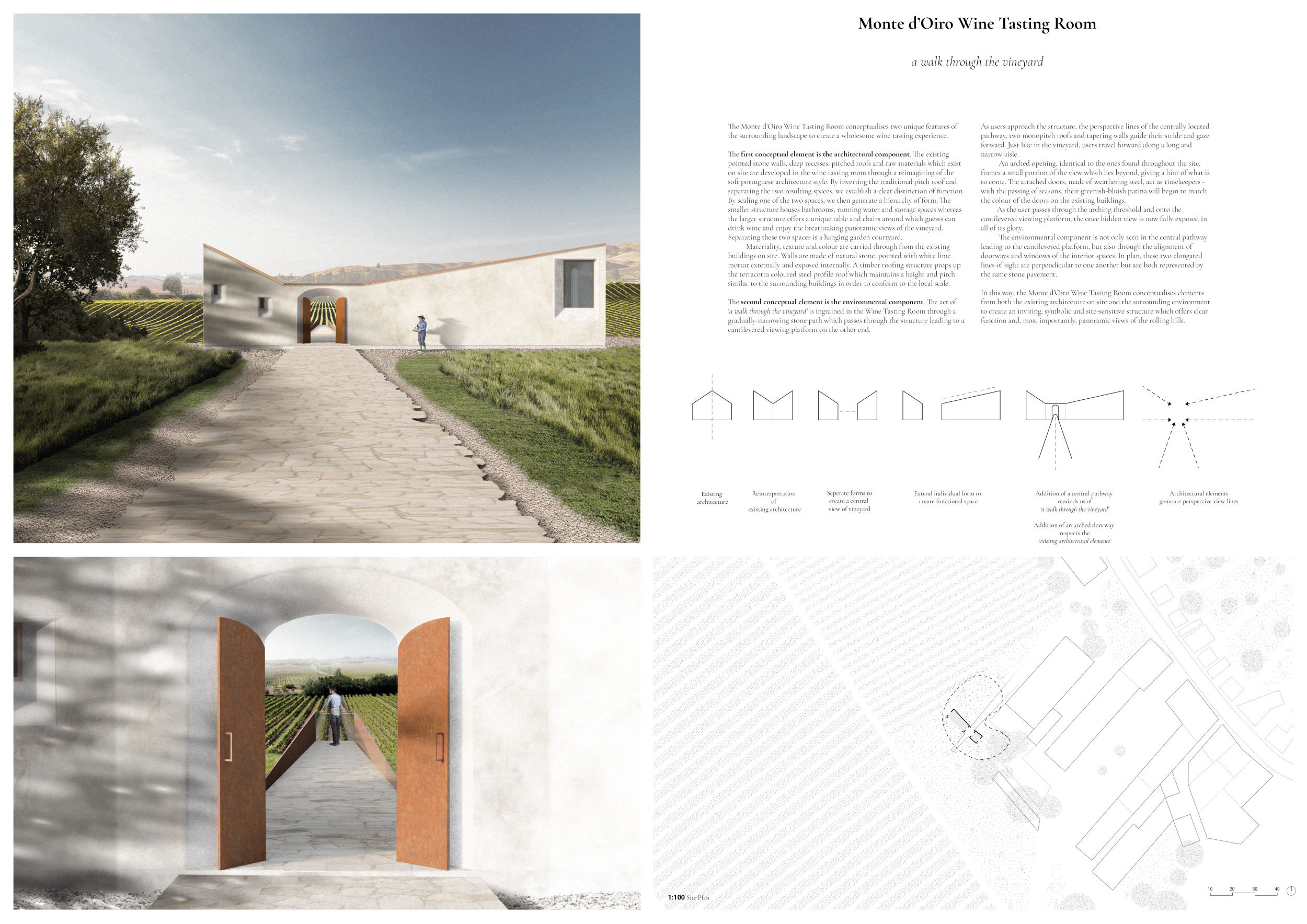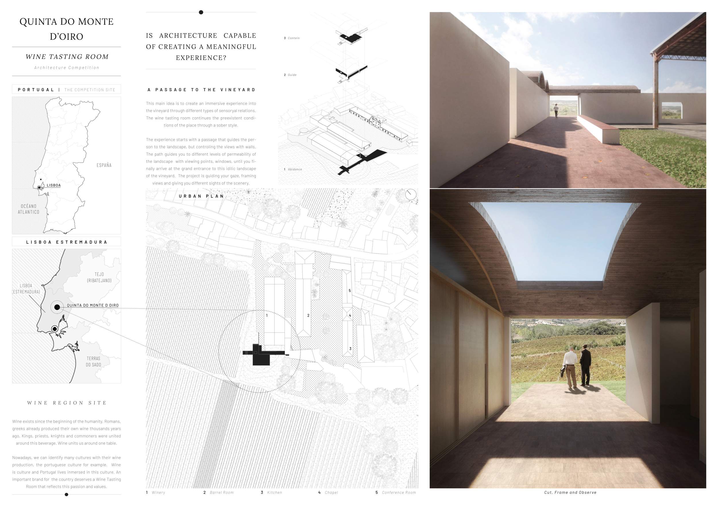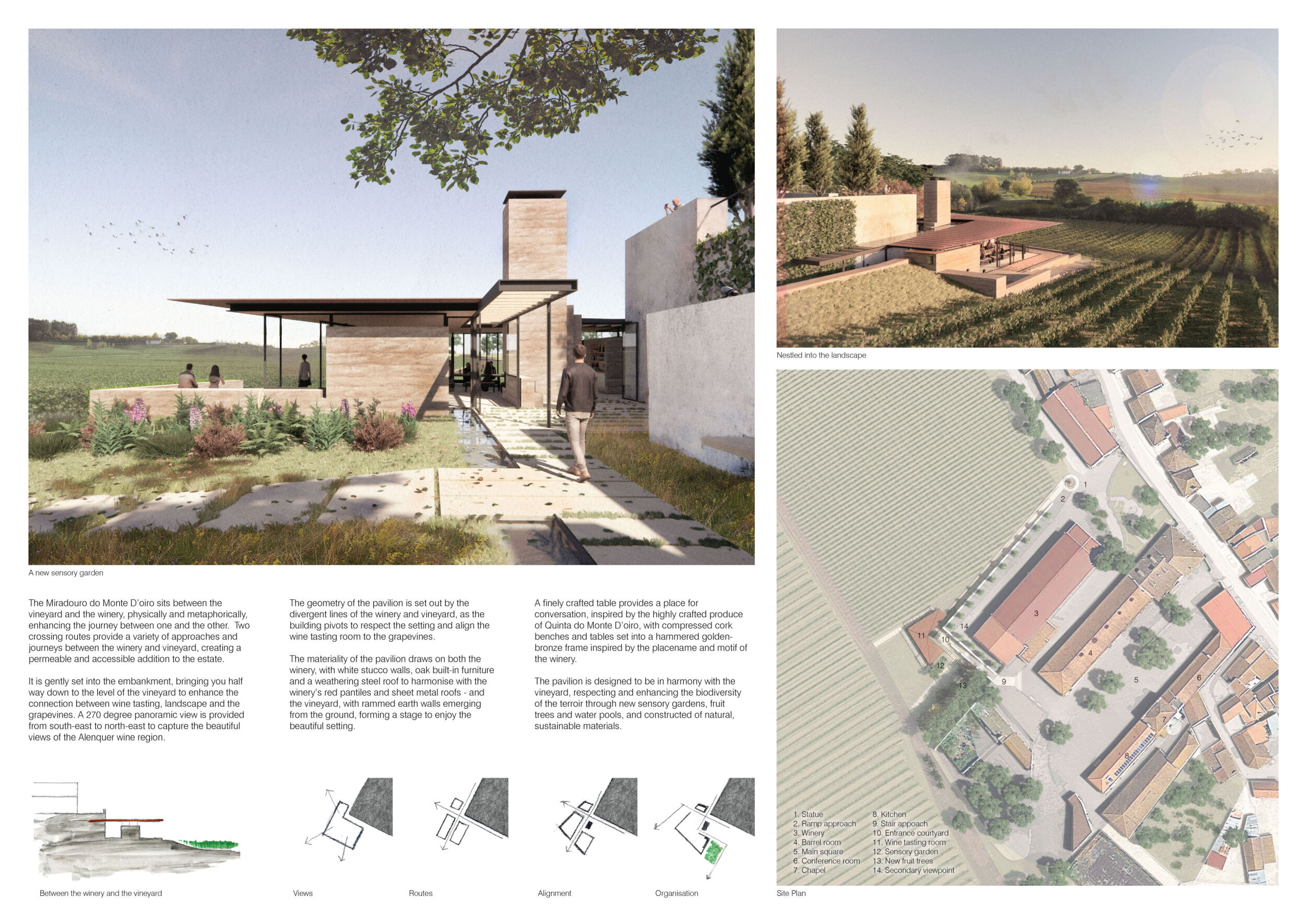 For the Monte d’Oiro Wine Tasting Room competition, the vineyard is seeking design ideas for a wine tasting room, where approximately 30 people can gather around a special tasting table to enjoy the wines as well as the magnificent views of the vineyard. The 60m² space is to be open and inviting, and the program is to provide simple amenities such as running water and storage. Designs for the tasting room were requested to be considerate of the existing vineyard facilities, while at the same time capable of becoming an architectural landmark. The Quinta do Monte d’Oiro has expressed an interest in constructing the winning proposal.