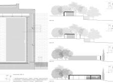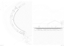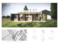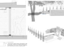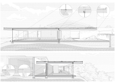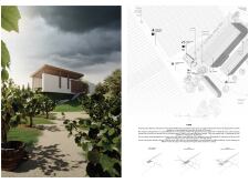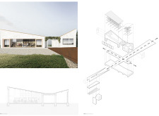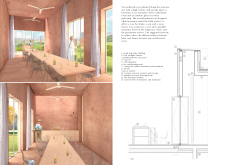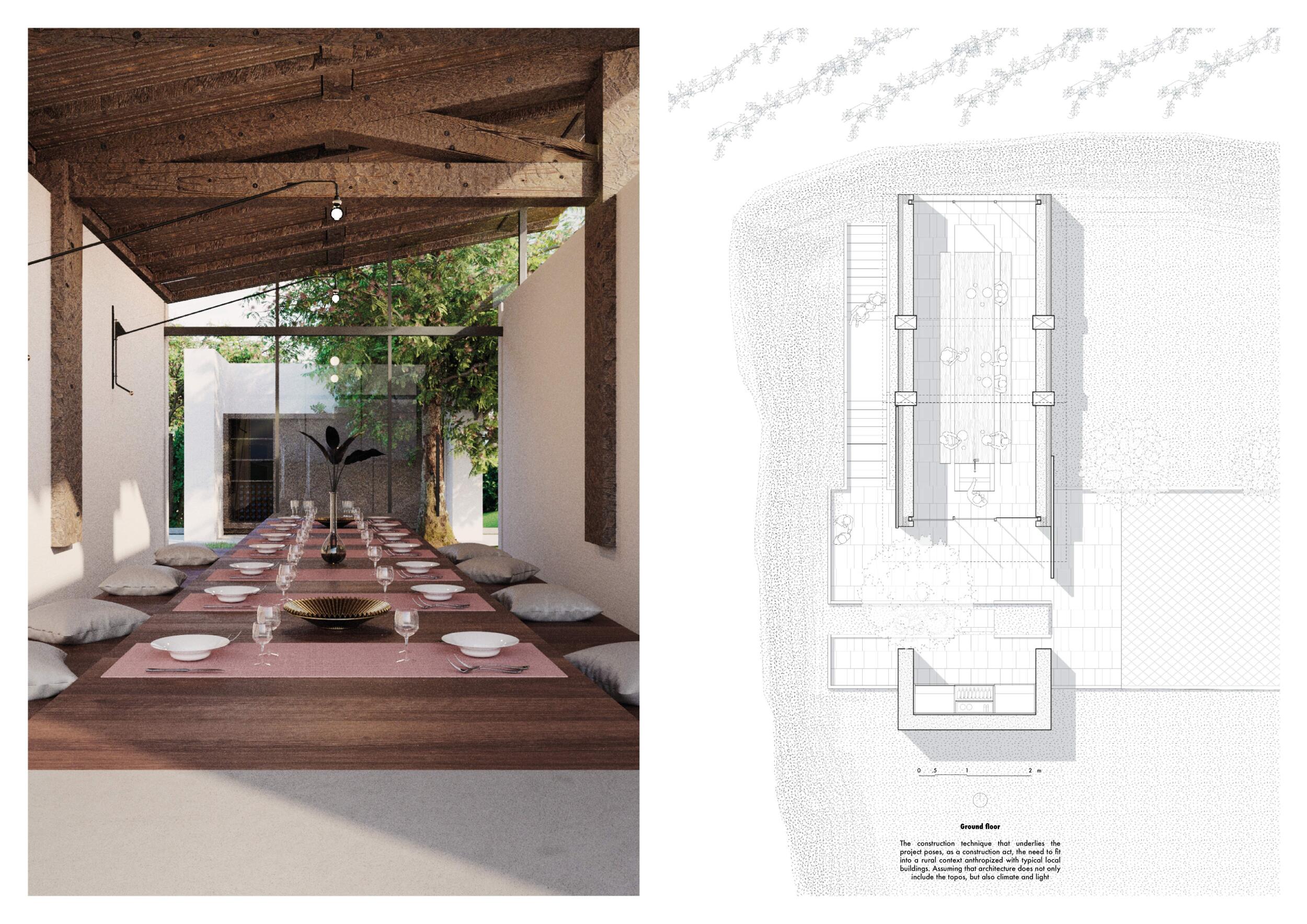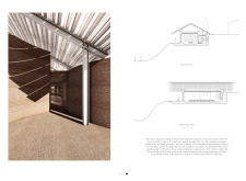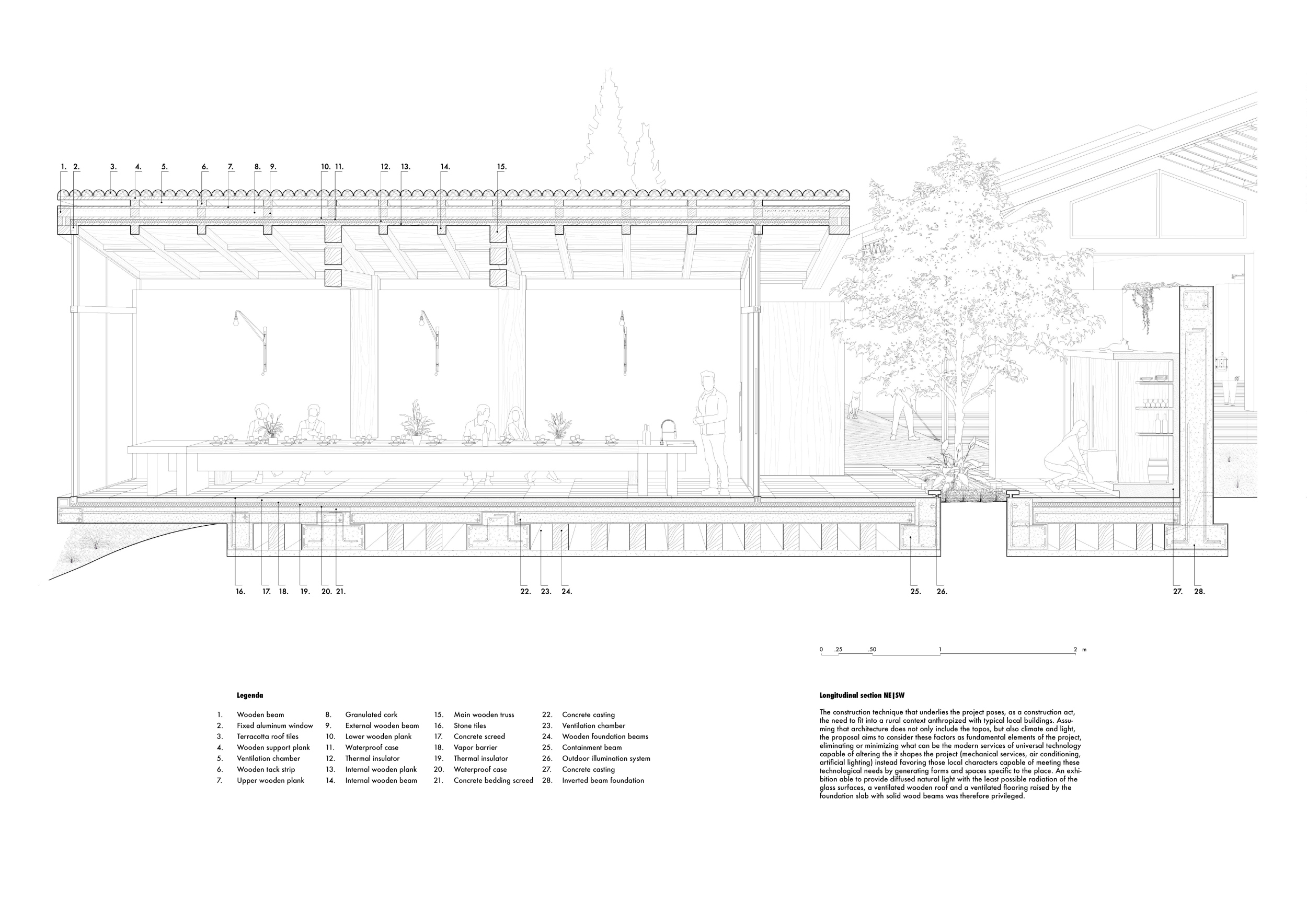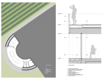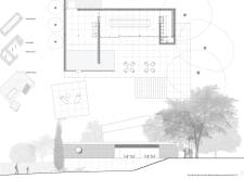 Agreste (‘to live a rural existence’) conceives of a subtle new structure sited parallel to - yet 2.3m below - the existing buildings. Constructed of rammed-earth reinforced walls and topped with a timber-framed and landscaped roof, the rectangular form comprises four semi-circular enclosures at its corners containing support spaces.