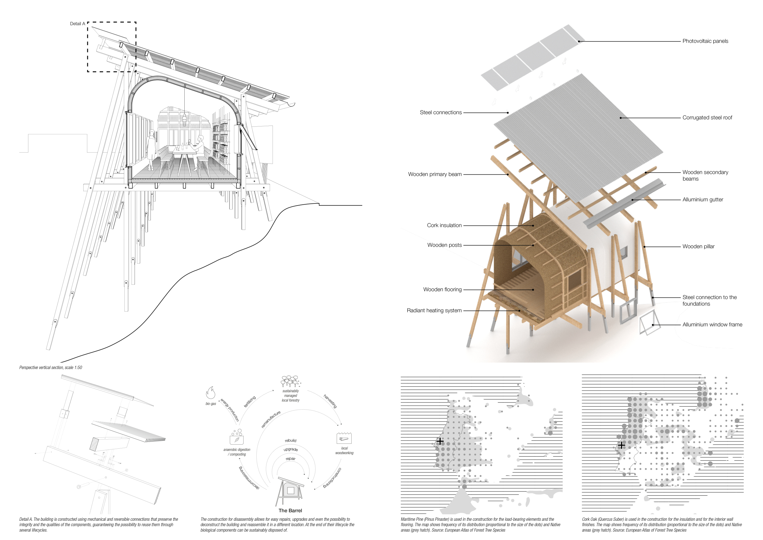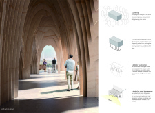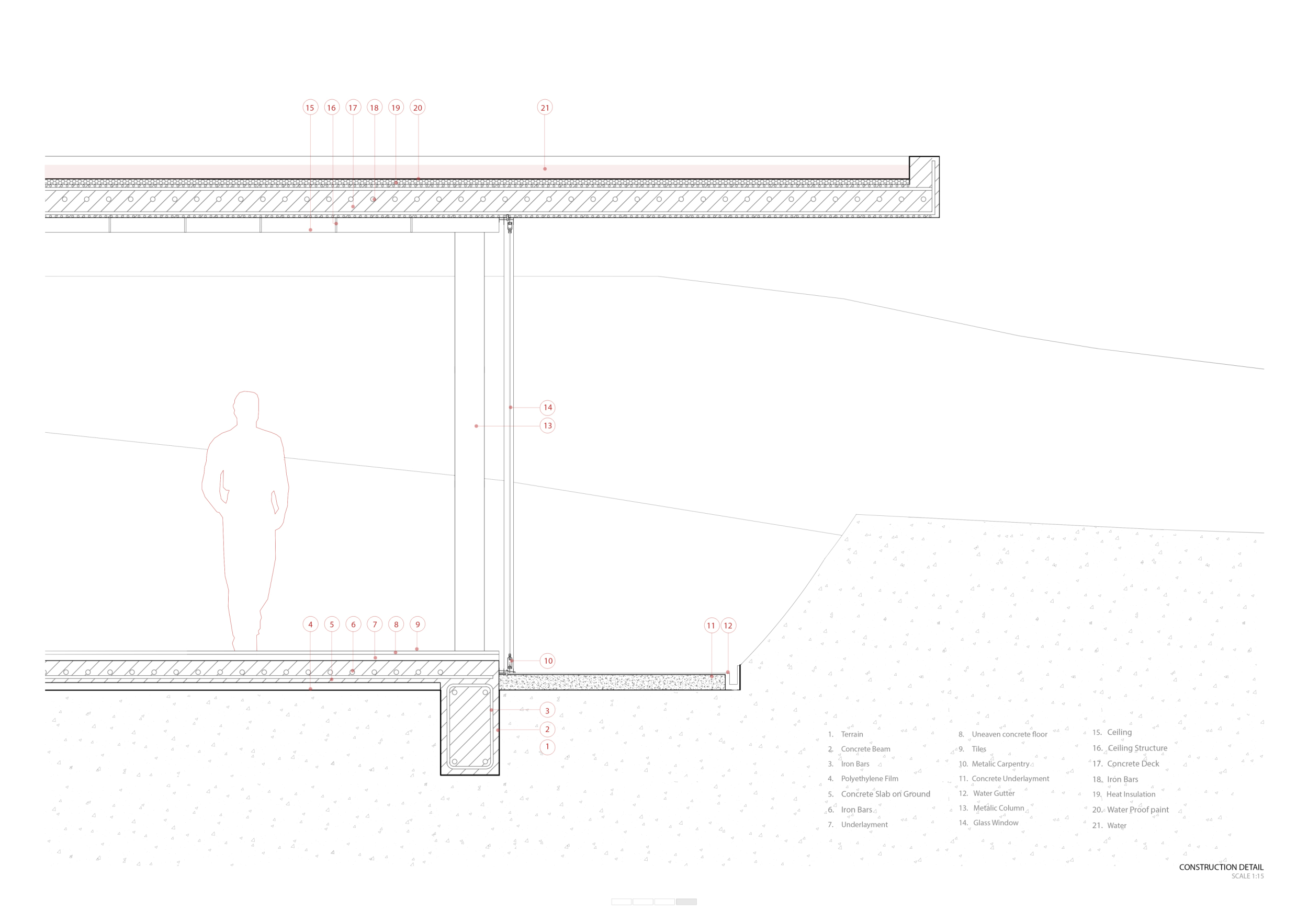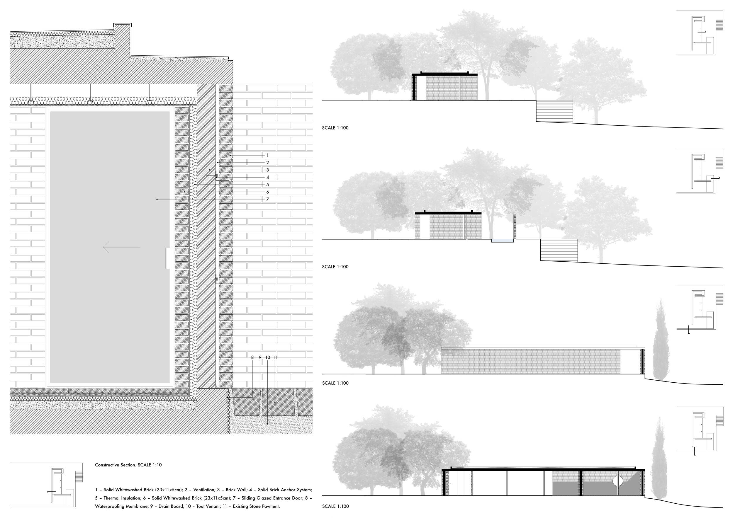 Agreste (‘to live a rural existence’) conceives of a subtle new structure sited parallel to - yet 2.3m below - the existing buildings. Constructed of rammed-earth reinforced walls and topped with a timber-framed and landscaped roof, the rectangular form comprises four semi-circular enclosures at its corners containing support spaces.
