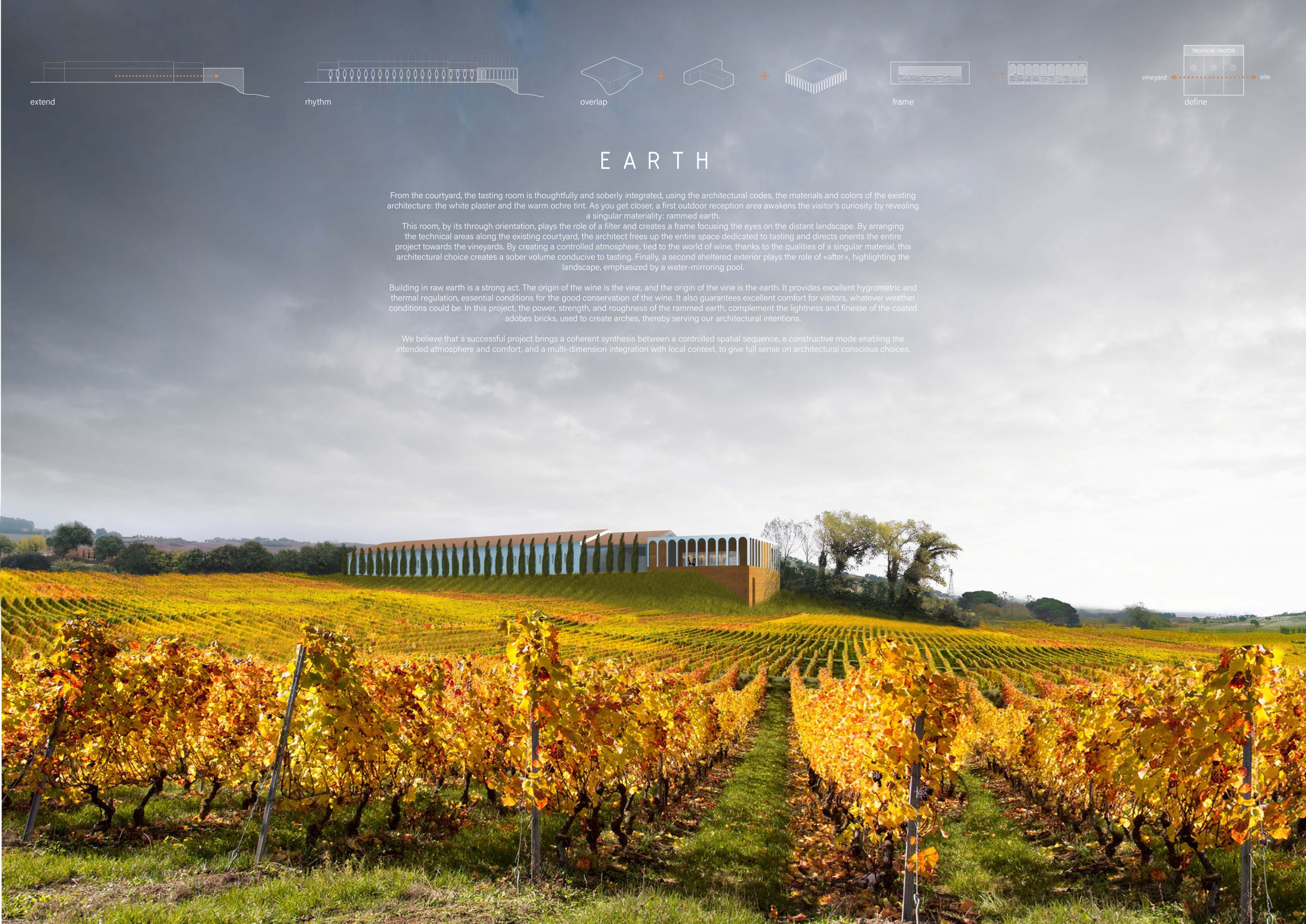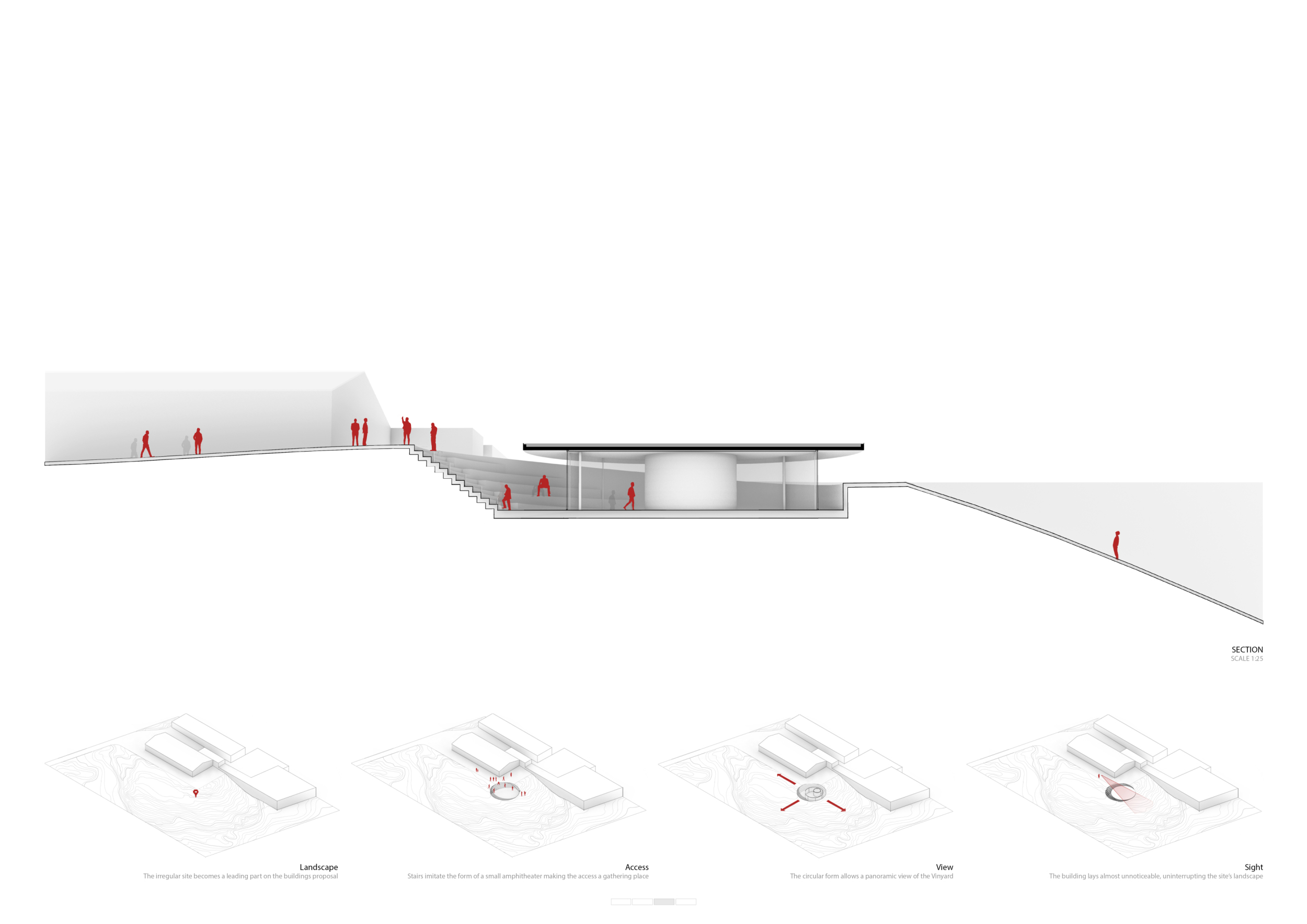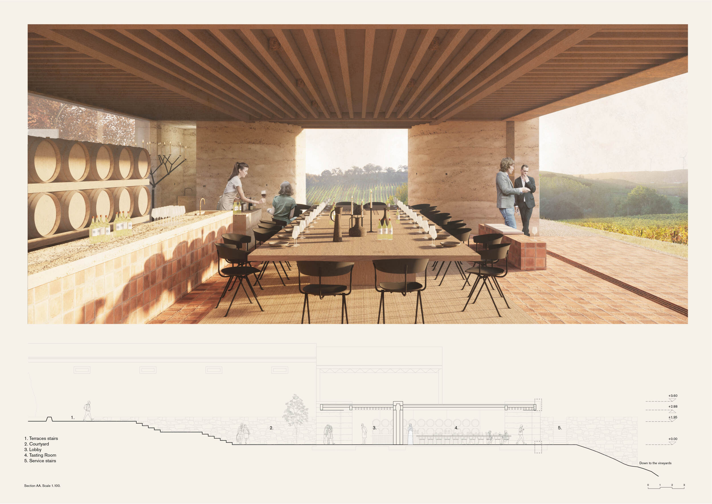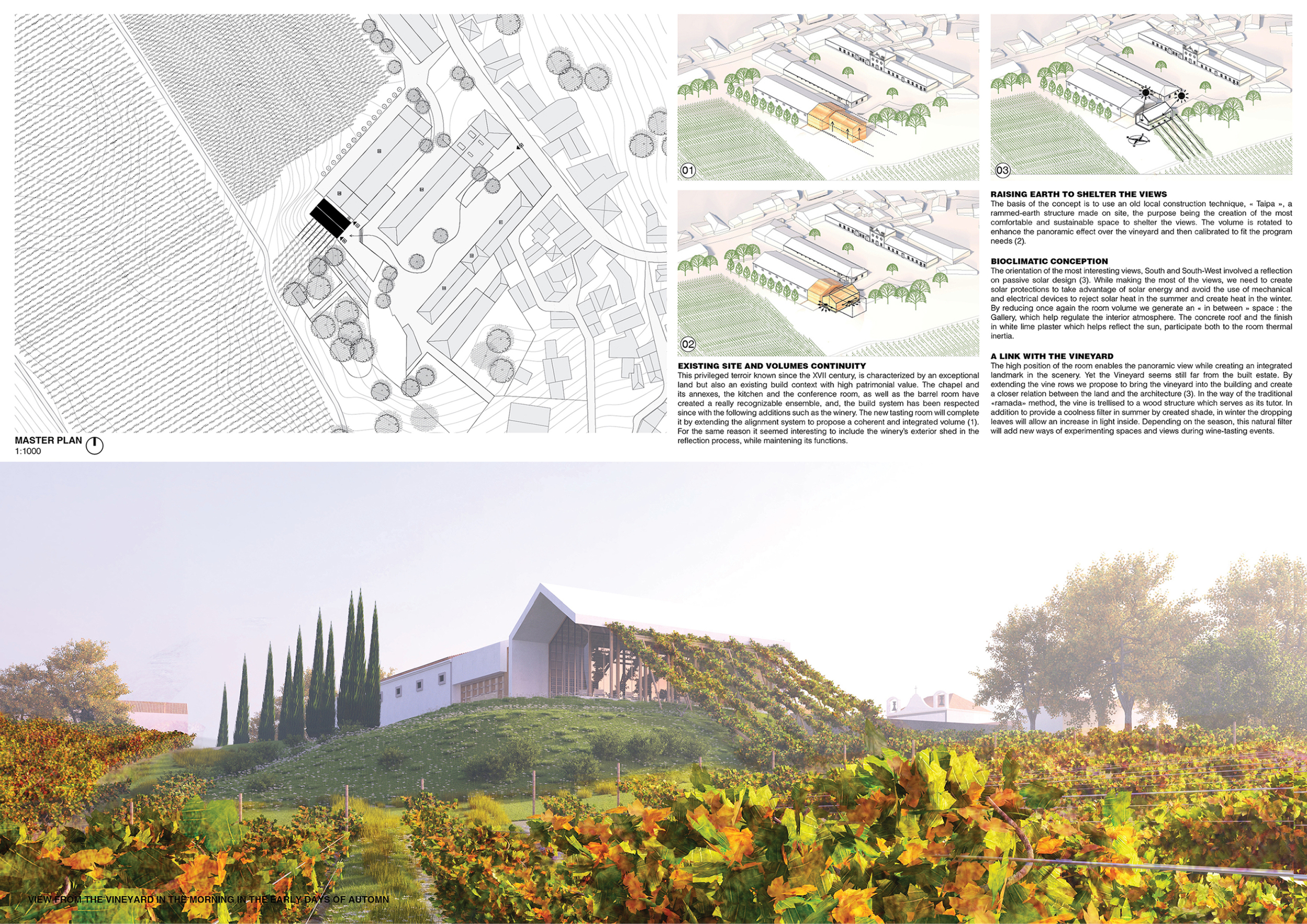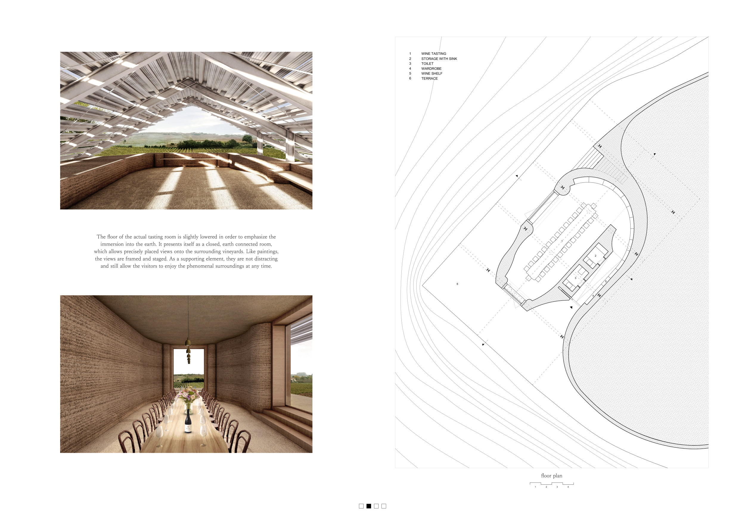 The jury evaluated designs for their capacity to offer a unique space to the vineyard, and sought proposals that made use of natural materials. The received proposals experimented with a host of ideas for integrating the new project within the site. Given the elevated conditions of the existing buildings, proposals conceived of a mix of above-grade concepts as well as constructions carved into the hillside.