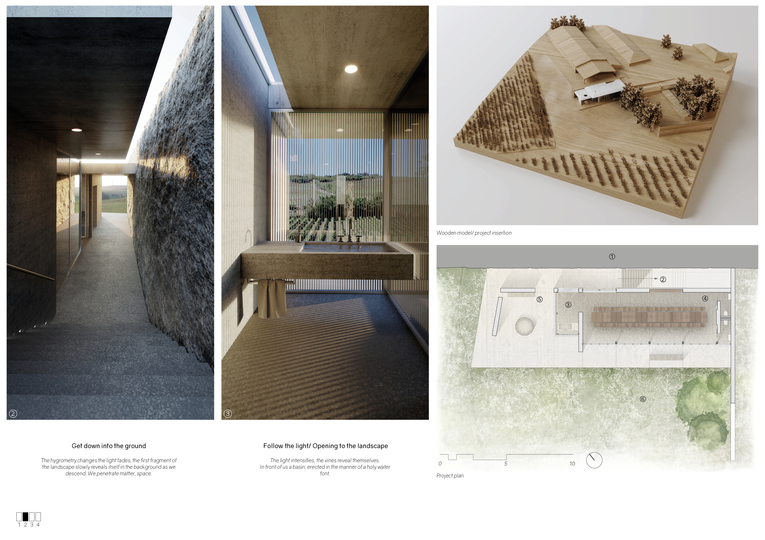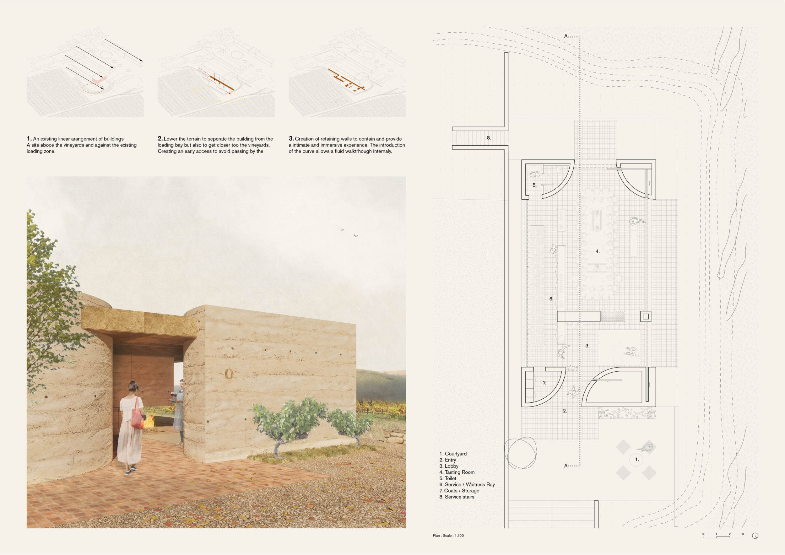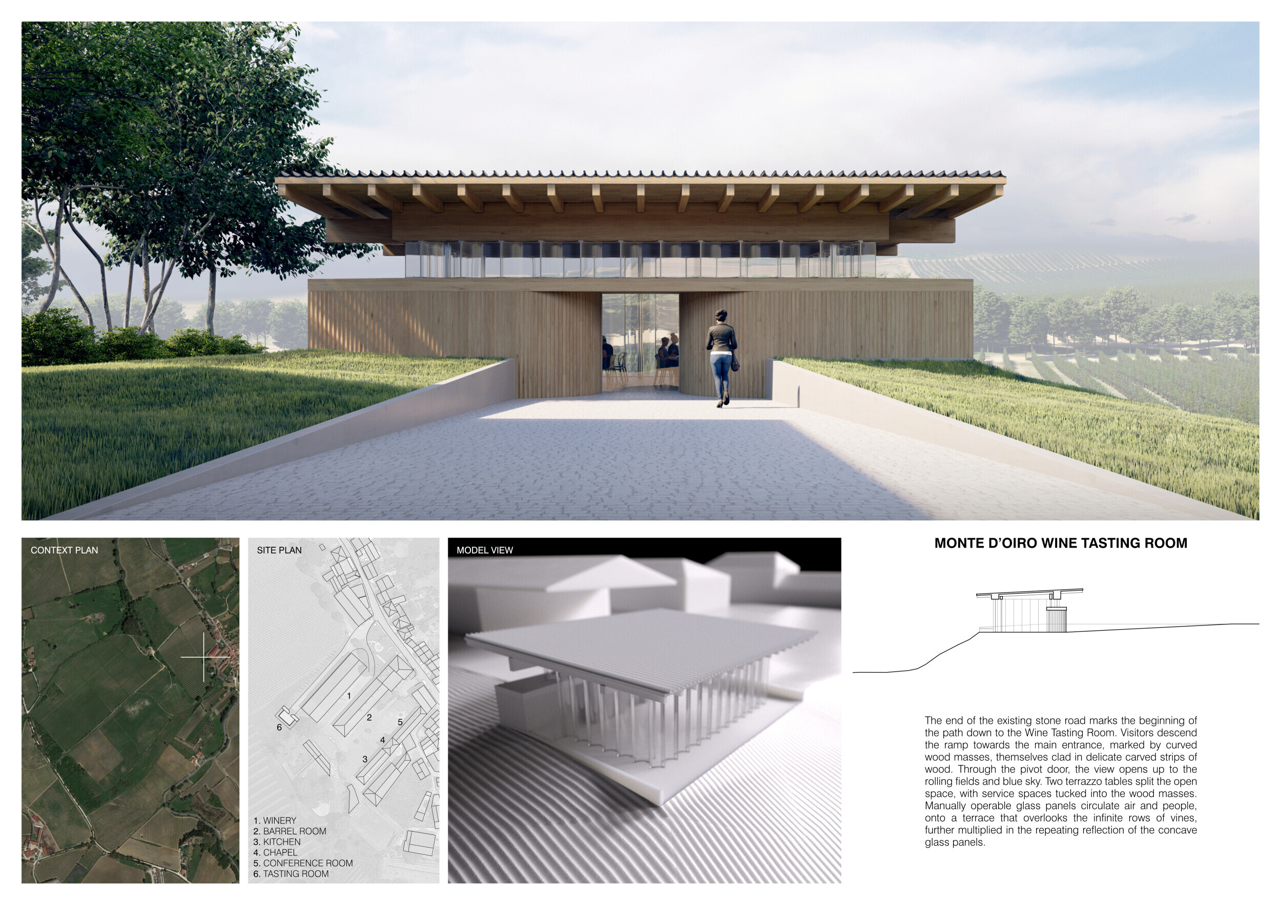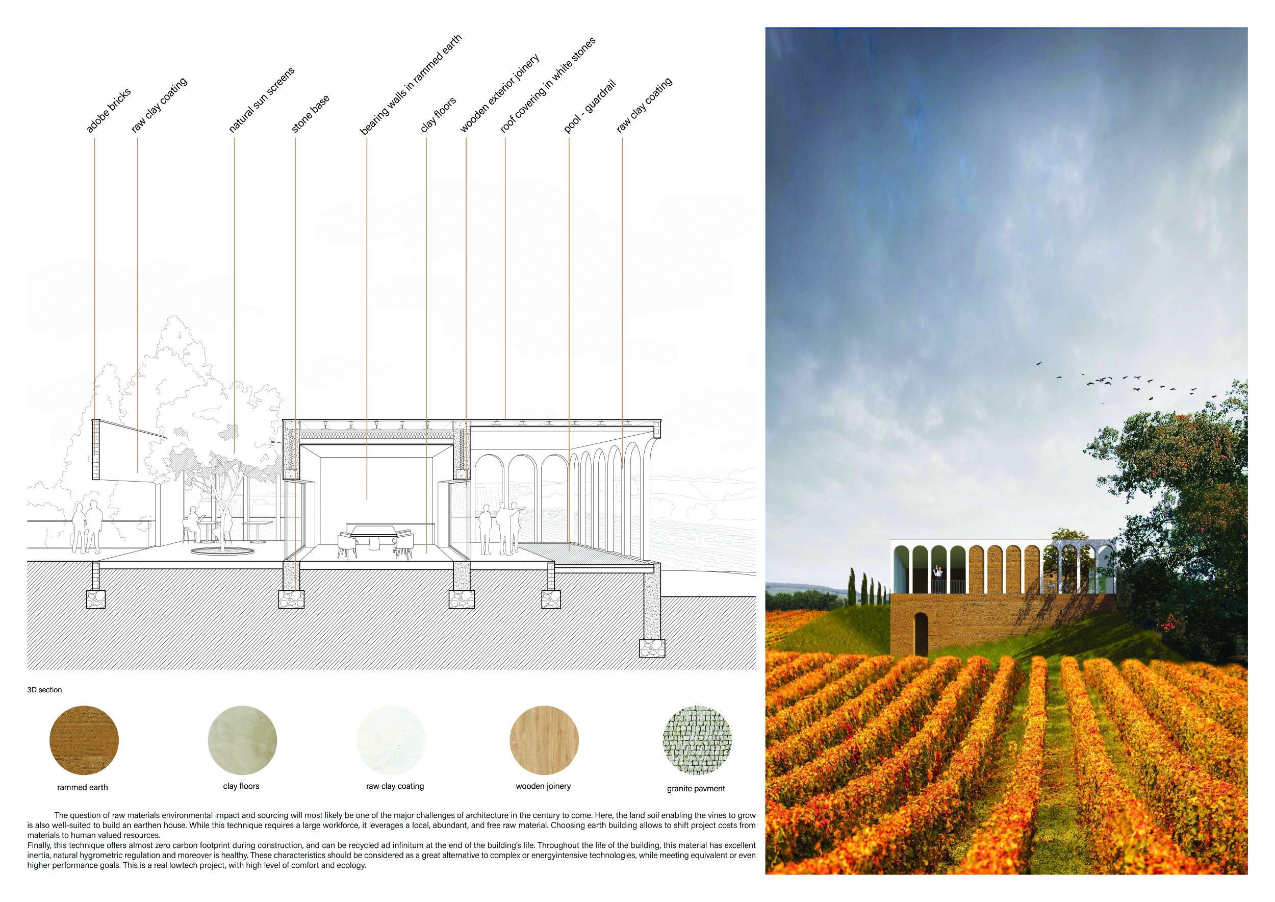The jury evaluated designs for their capacity to offer a unique space to the vineyard, and sought proposals that made use of natural materials. The received proposals experimented with a host of ideas for integrating the new project within the site. Given the elevated conditions of the existing buildings, proposals conceived of a mix of above-grade concepts as well as constructions carved into the hillside.