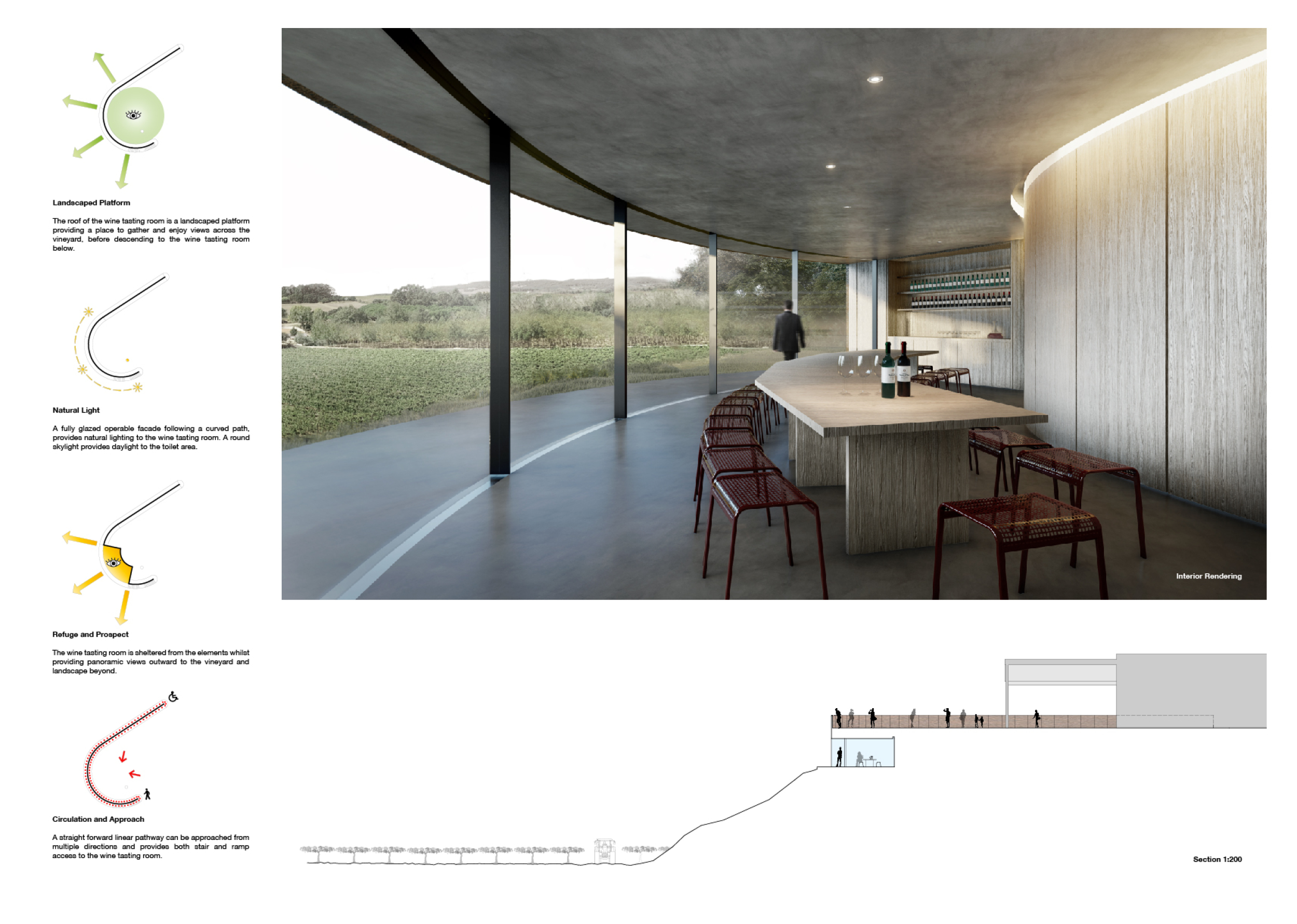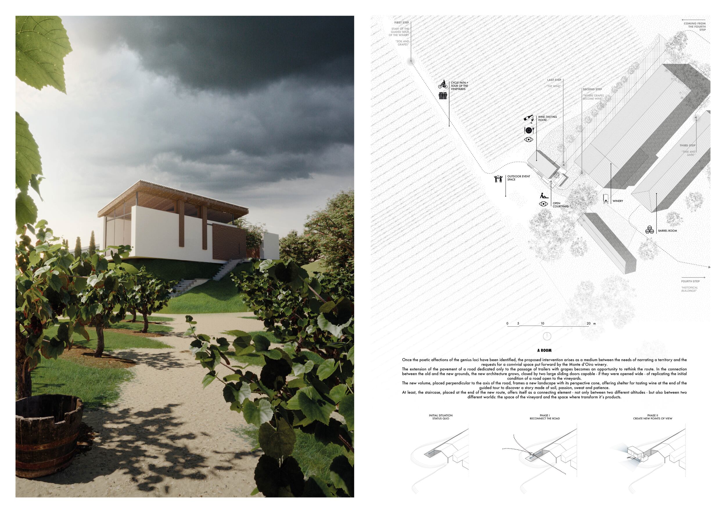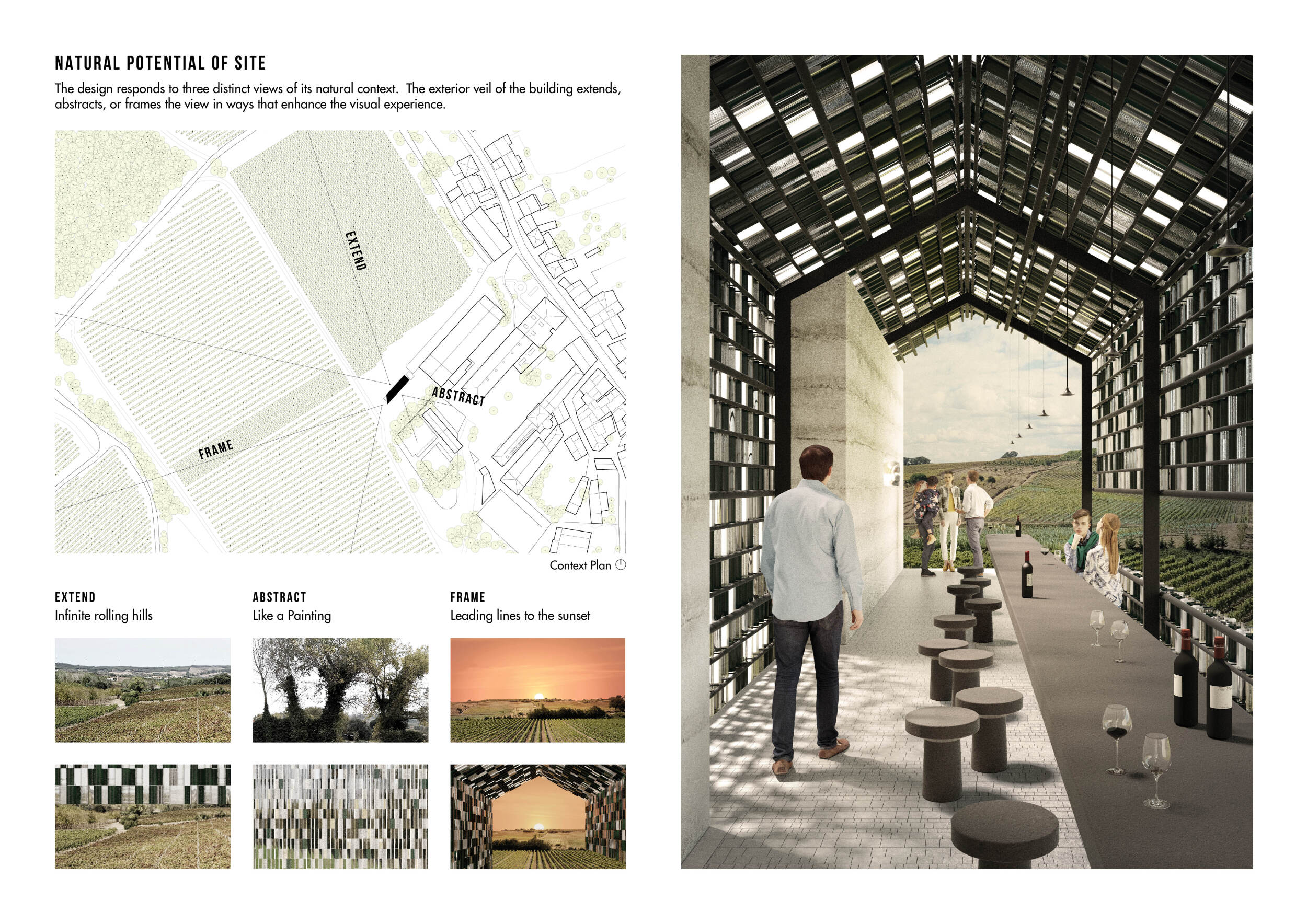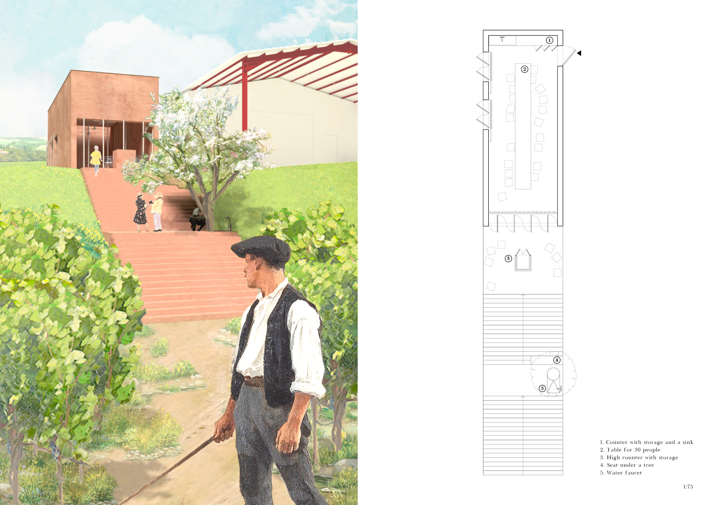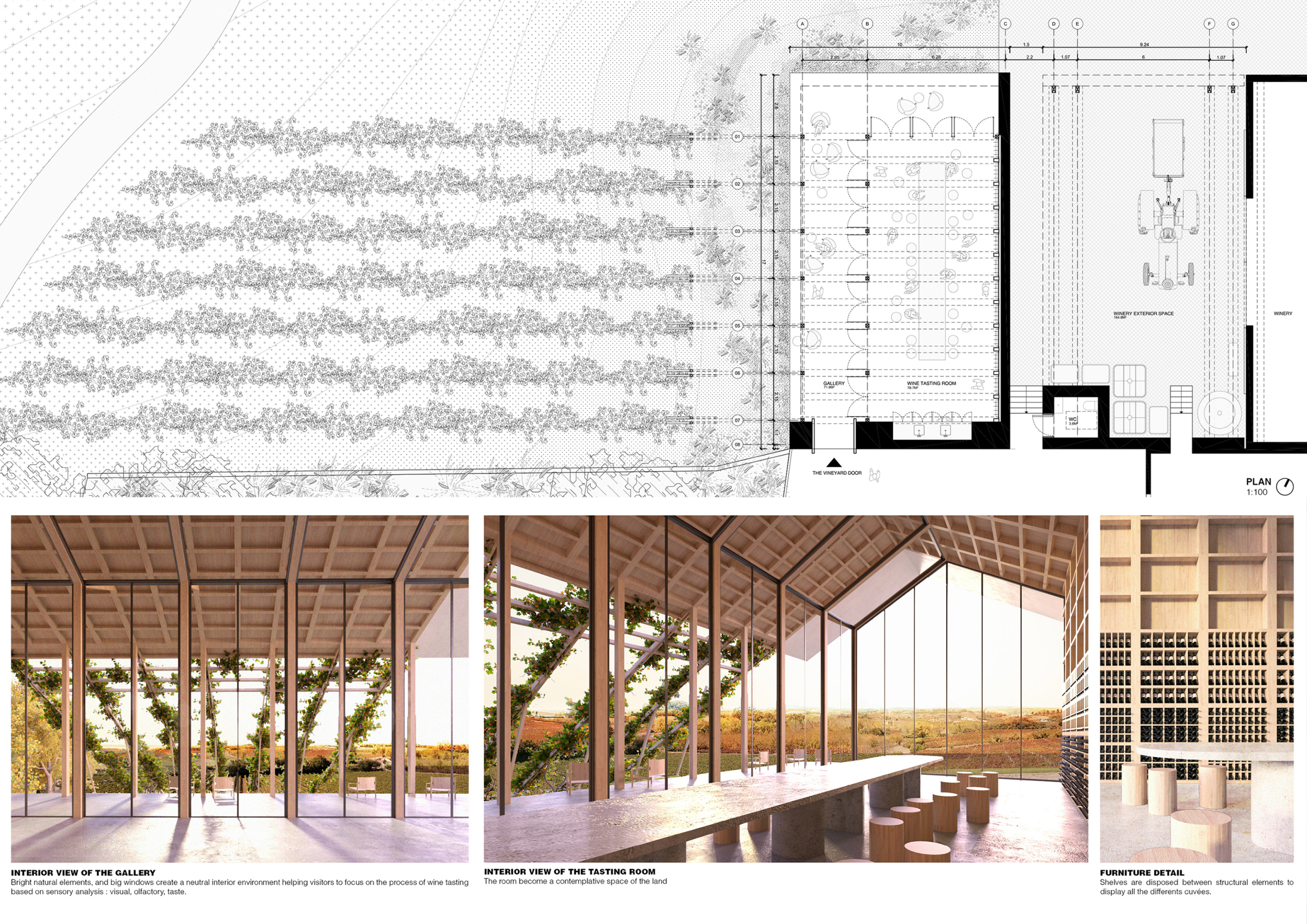 The jury evaluated designs for their capacity to offer a unique space to the vineyard, and sought proposals that made use of natural materials. The received proposals experimented with a host of ideas for integrating the new project within the site. Given the elevated conditions of the existing buildings, proposals conceived of a mix of above-grade concepts as well as constructions carved into the hillside.
