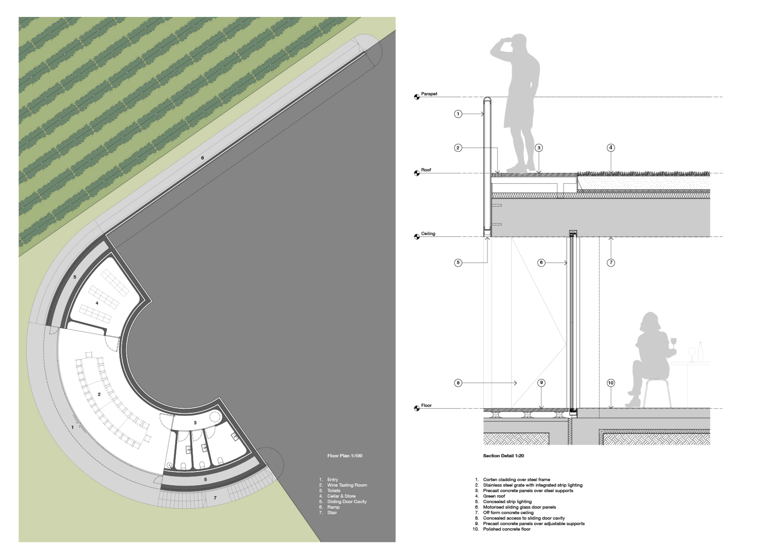 The project is organized linearly about an axis that divides support spaces on one side from the wine tasting room on the other. It is characterized by a series of straight, solid walls that open up at considered points to frame views, as well as to reflect sunlight and cast shadows. The tasting room is set beneath three reinforced concrete vaults stained the color of wine.