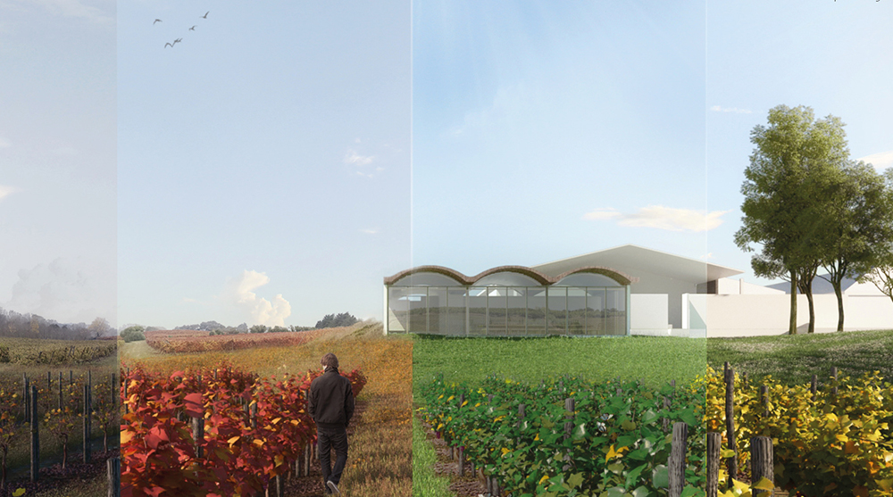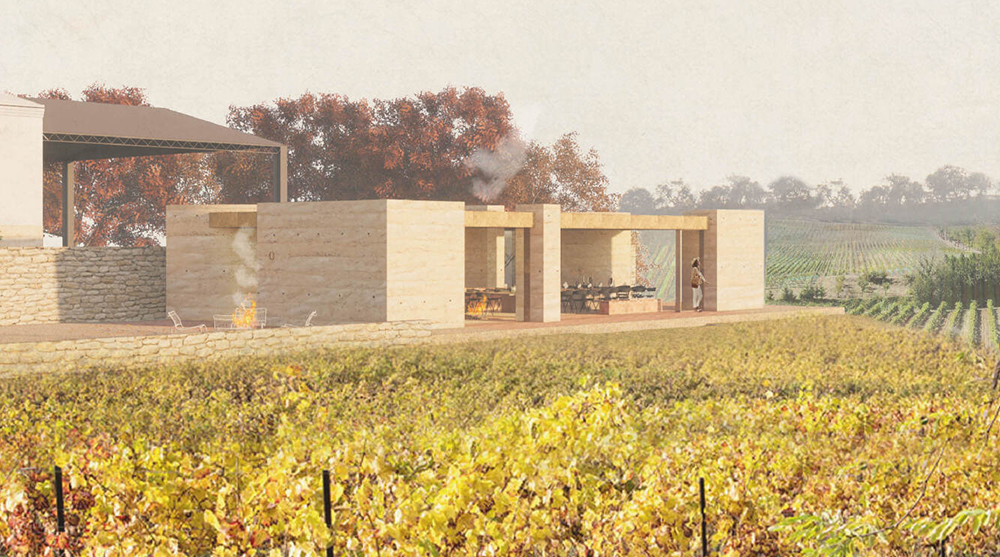 Evin Johann from France took first prize for the Agreste project, which conceived a structure with rammed-earth reinforced walls topped with a timber-framed and landscaped roof. Its rectangular form features four semi-circular enclosures at its corners containing support spaces, with the main space divided into a reception area and tasting area by a central hearth.